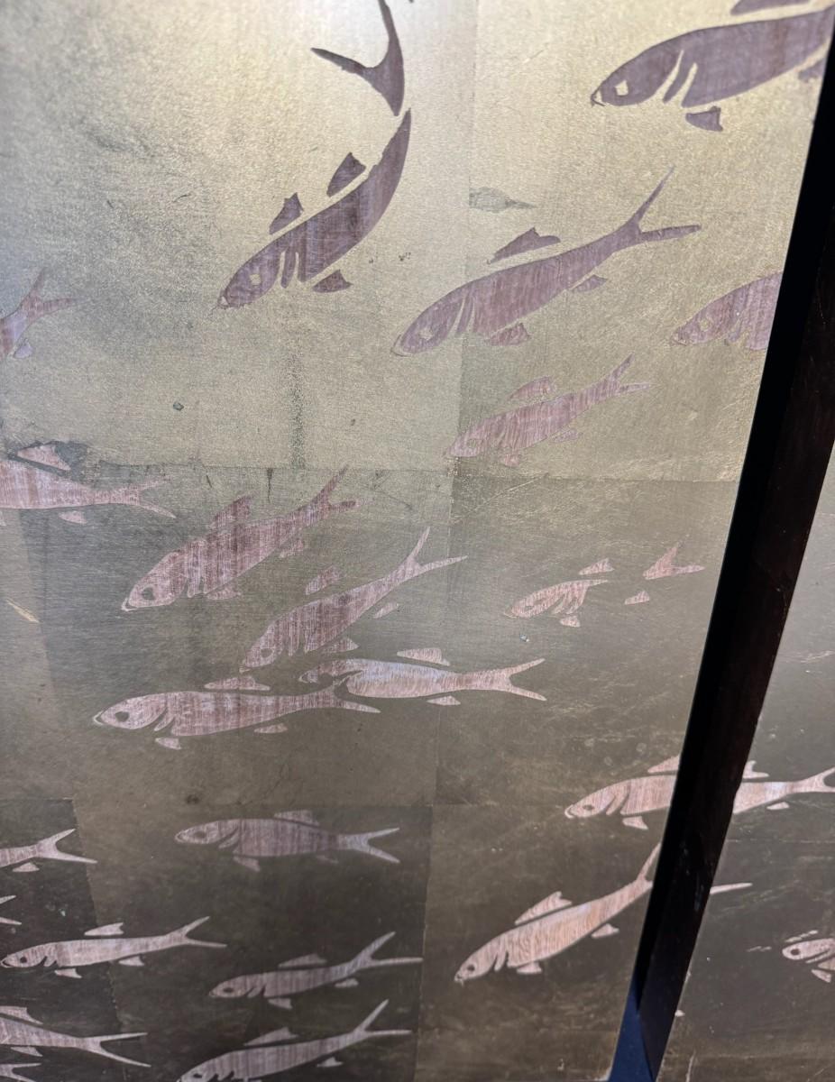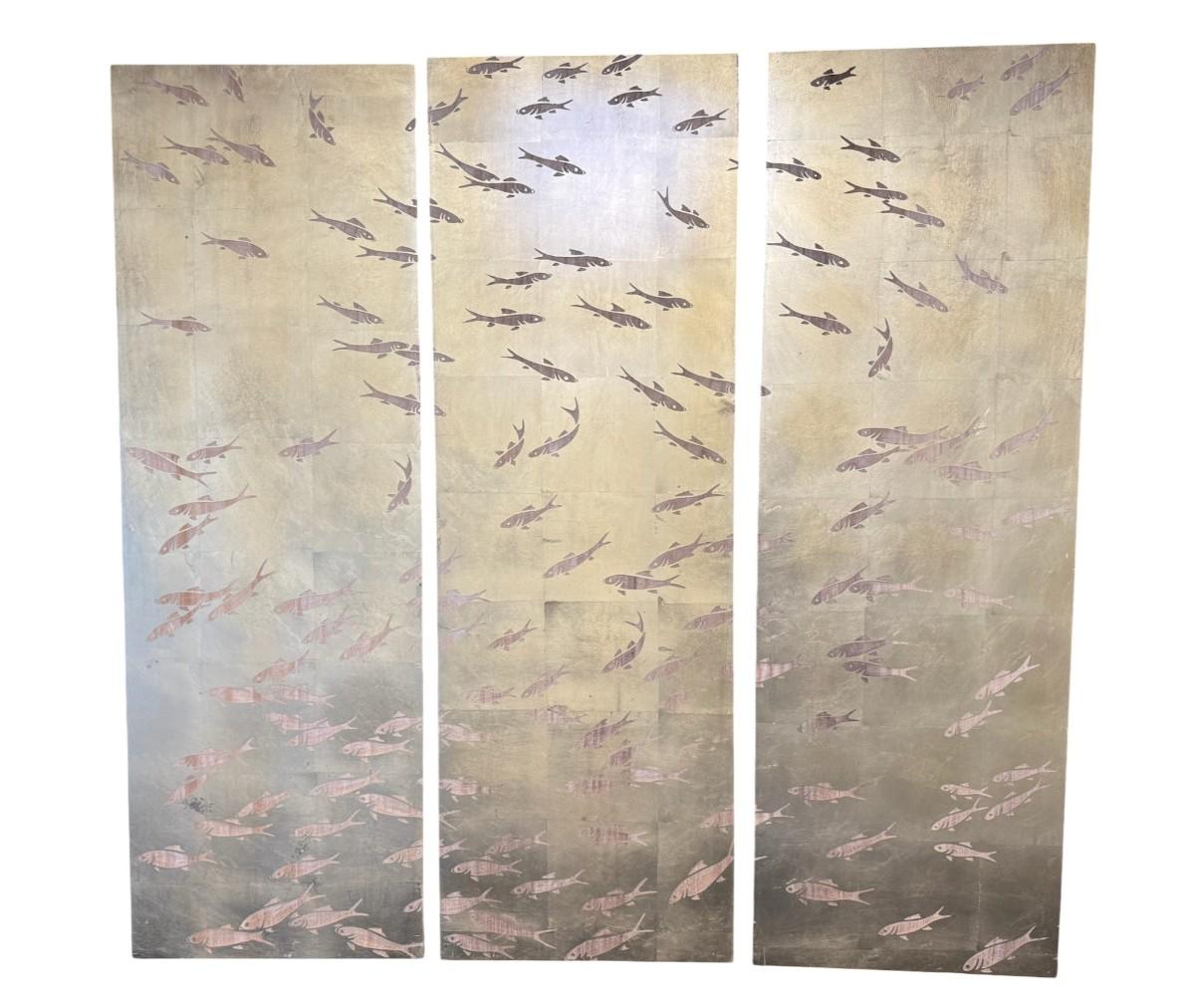 These gold tone panels each depict numerous swimming koi fish throughout. Total of three panels. The hardware is on the reverse. There is some age related wear. Measurement: 47”H x 16”W (each). [MA]