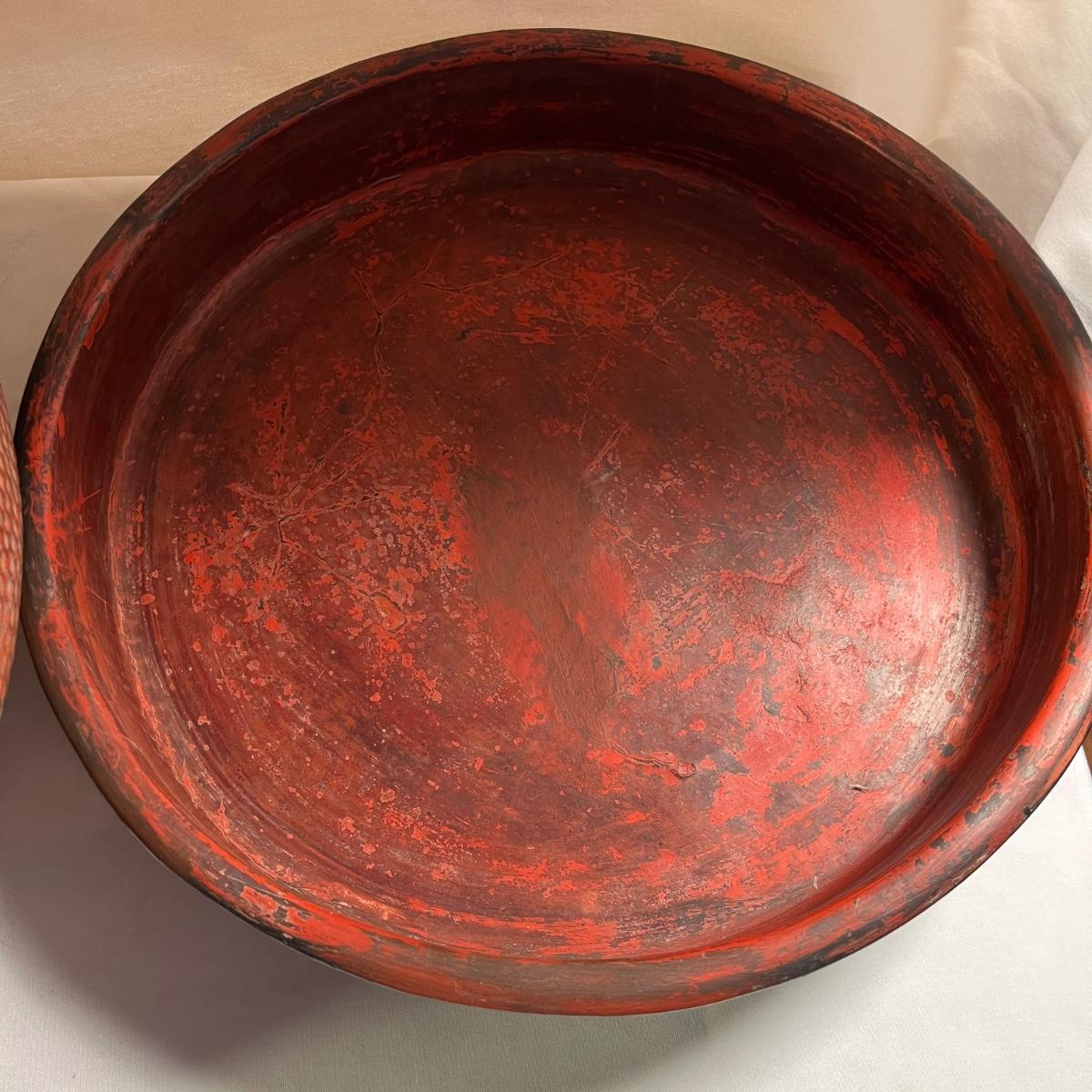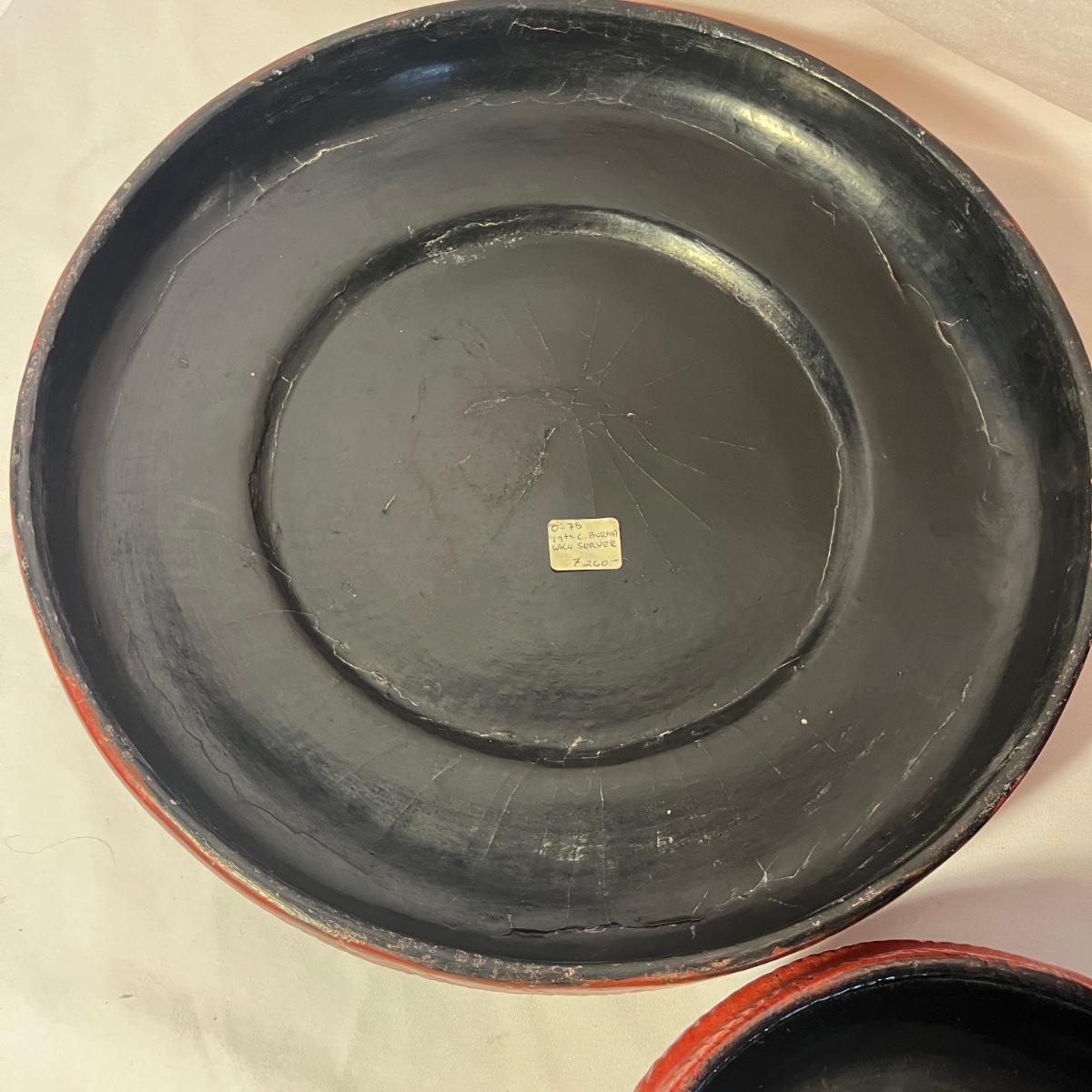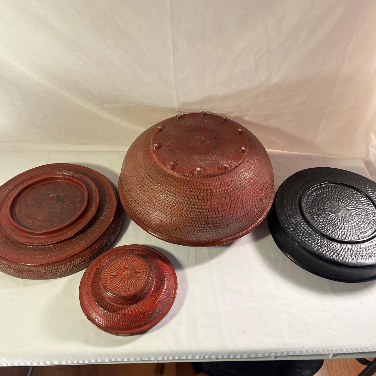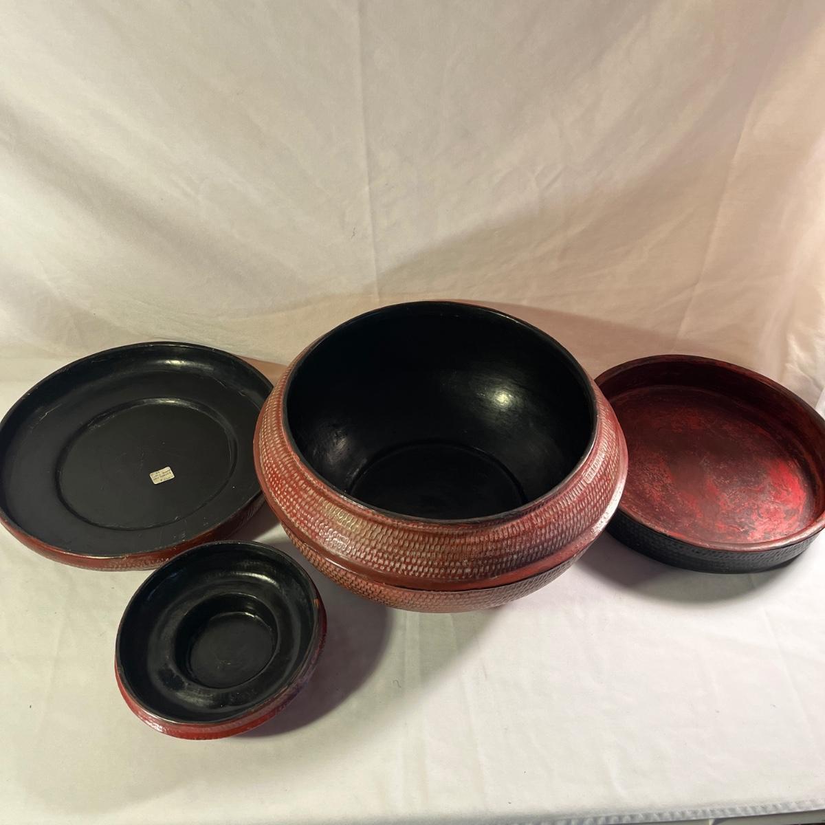 Lot includes a four piece set wood serving bowl that appears to be lacquered. Bowl measures 17”D x 13.5”H.