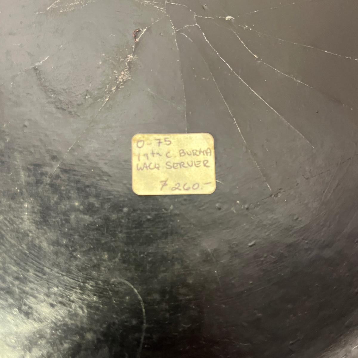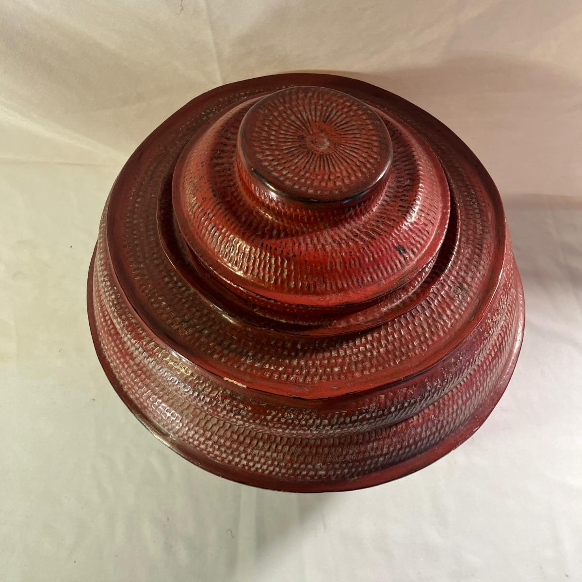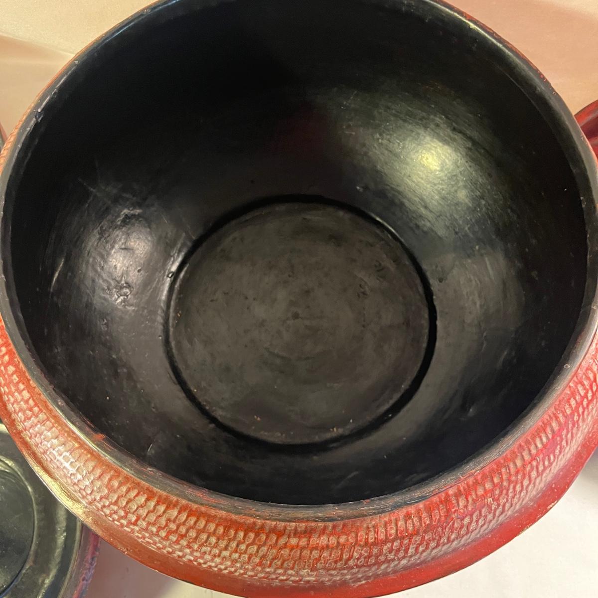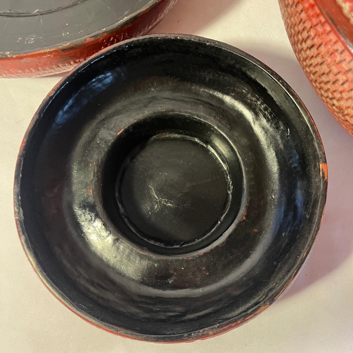 Lot includes a four piece set wood serving bowl that appears to be lacquered. Bowl measures 17”D x 13.5”H.