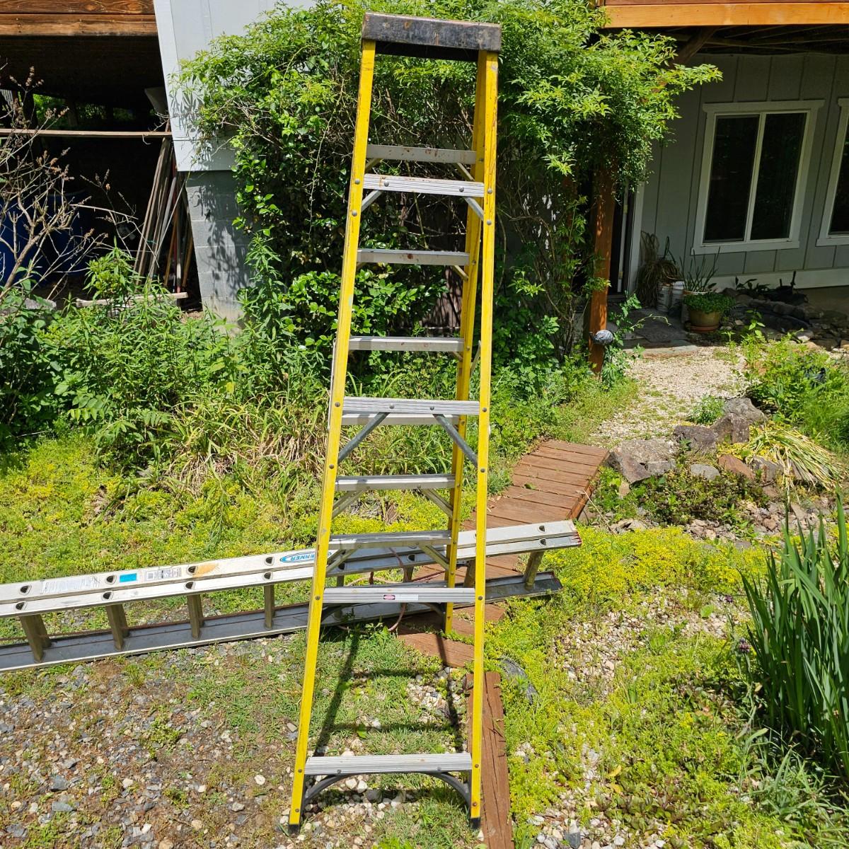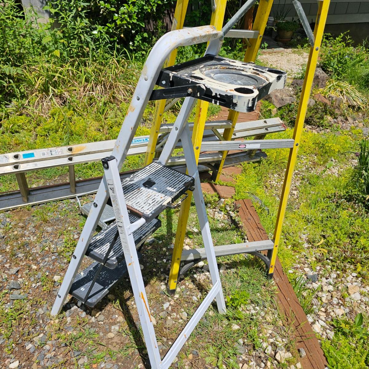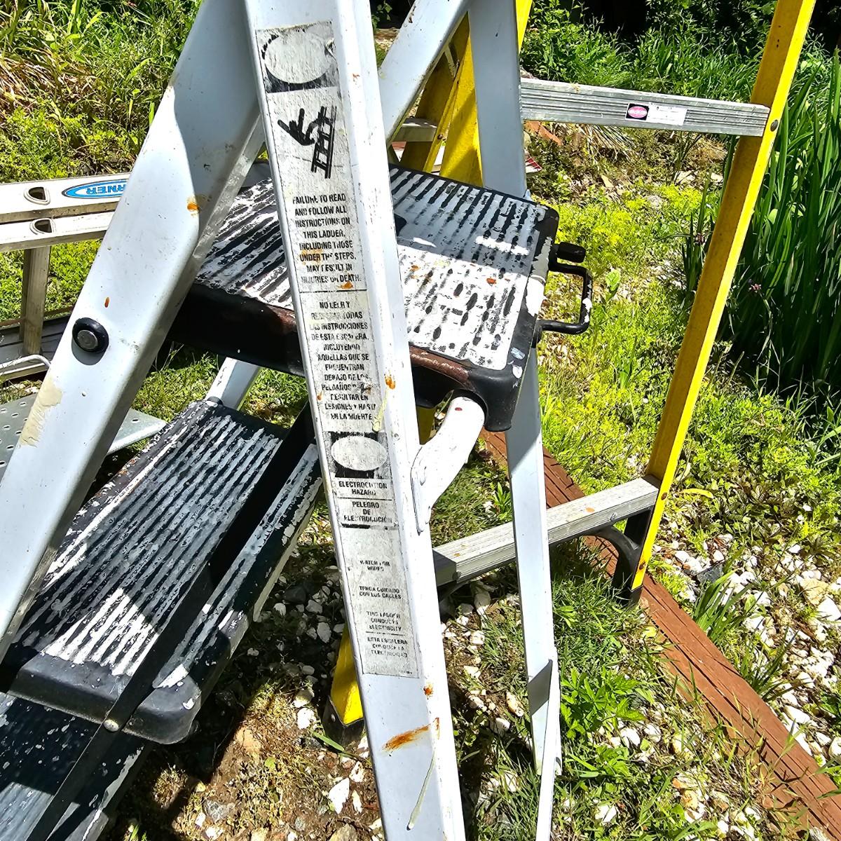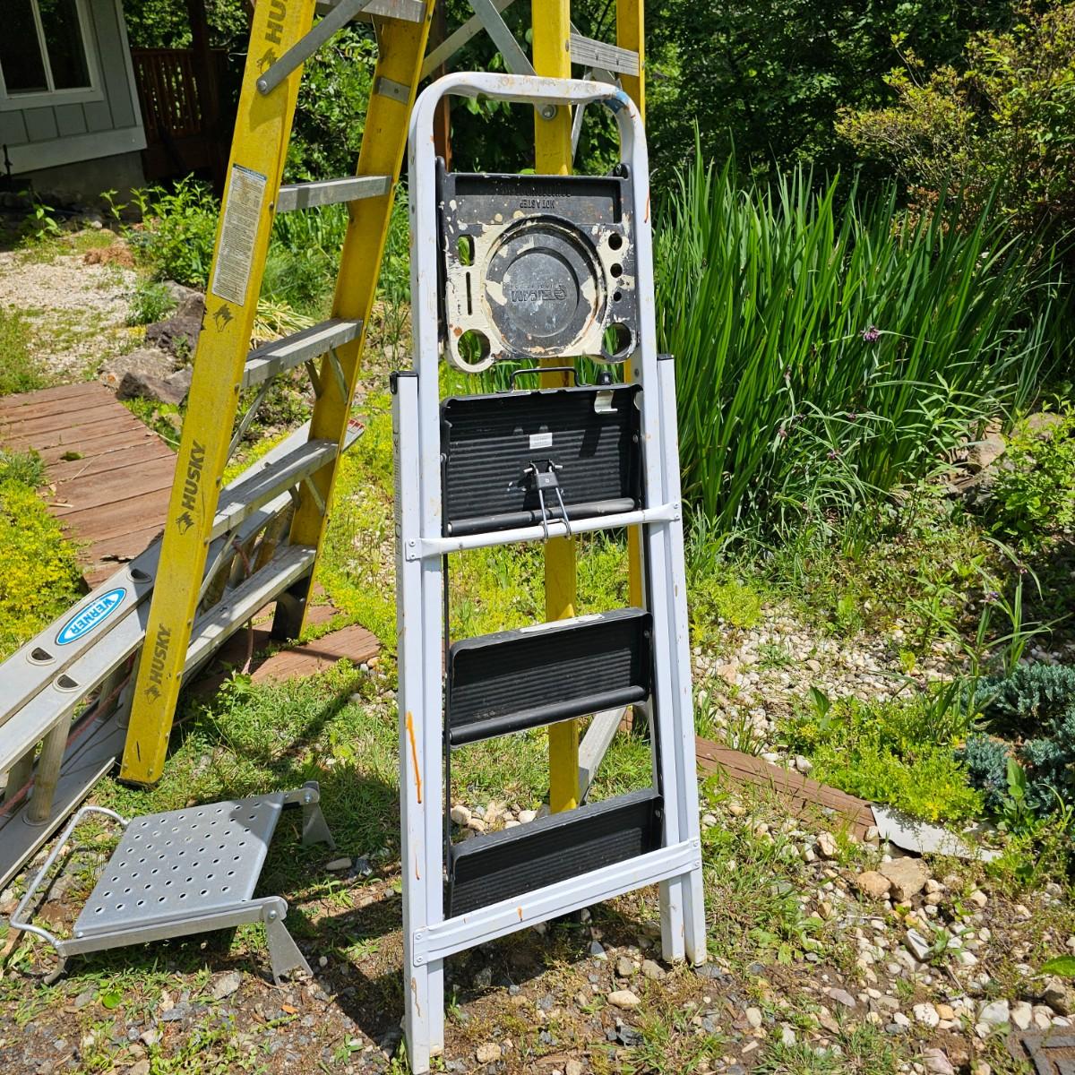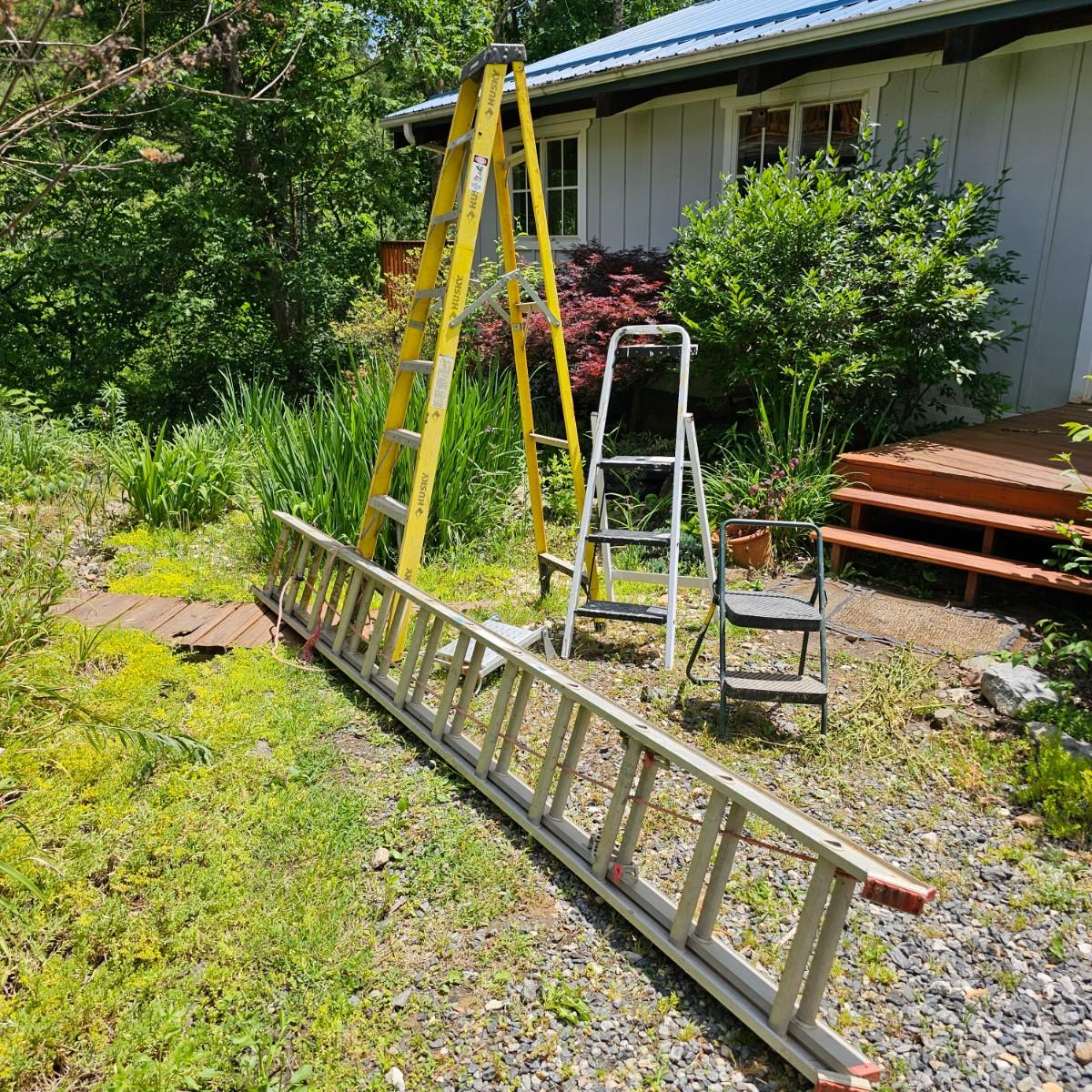 A mixture of different sizes of ladders for every need. One short two step Cosco stool, 16" x 18" x 26"H. One three step ladder with work tray, 26" x 20" x 52"H. A Husky yellow fiberglass eight foot stepladder. And finally, one Werner aluminum 24 foot extension ladder with grip feet and lifting rope. See photos for details. Local pickup only.