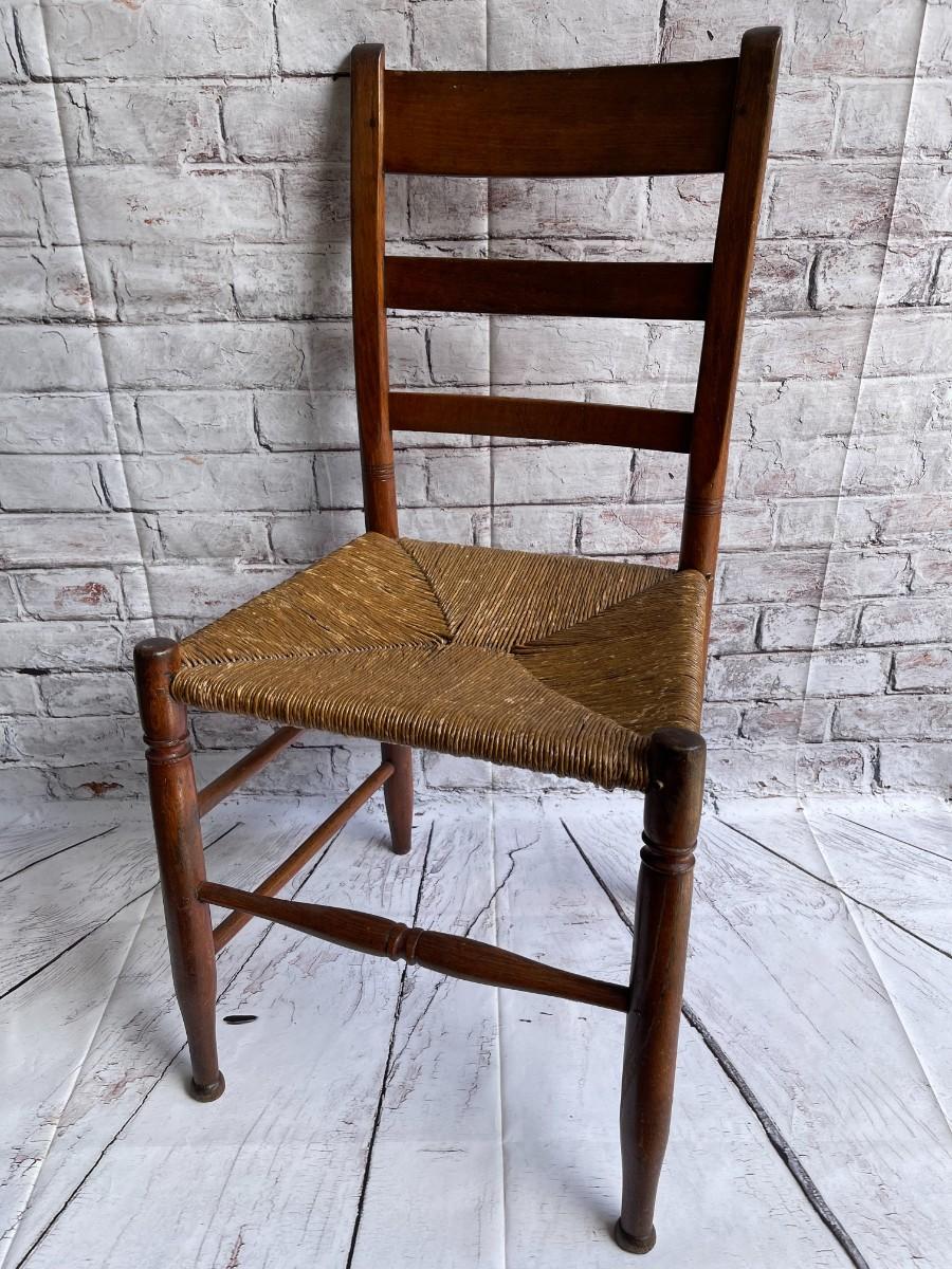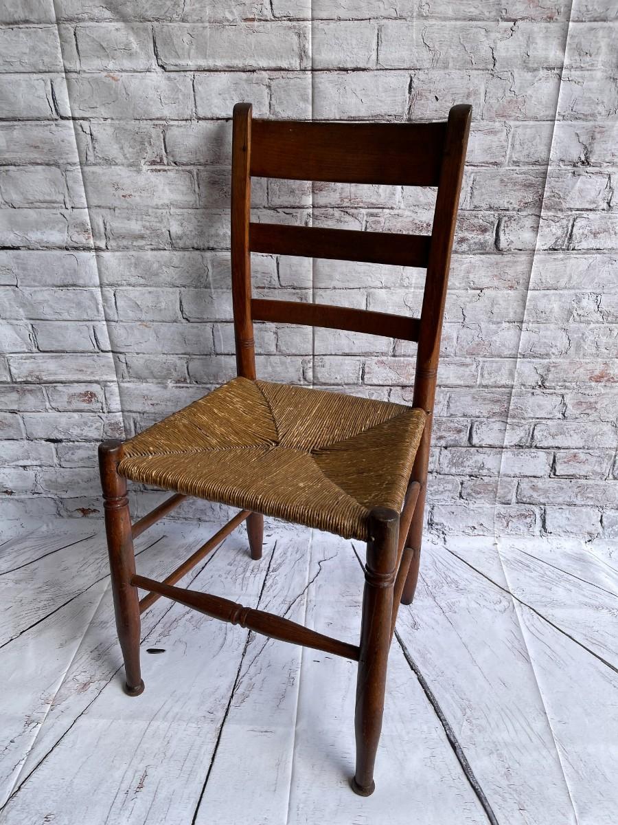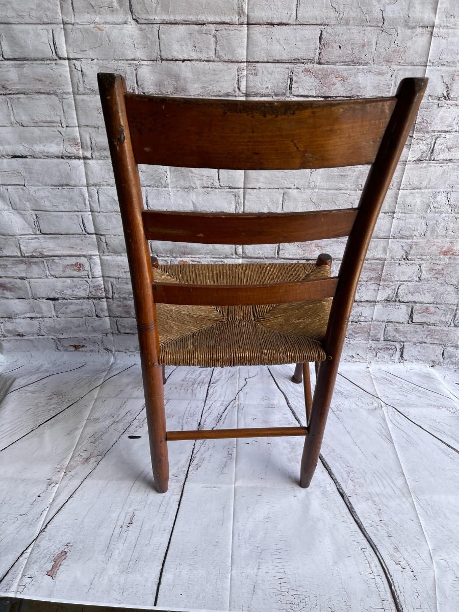 This is a single, brown solid wood ladder back chair with rush seat. It's in good condition with some signs of wear and would make a lovely desk chair or accent chair. 33" high. Seat is 16" high, 13" deep and 16" wide. # 300
