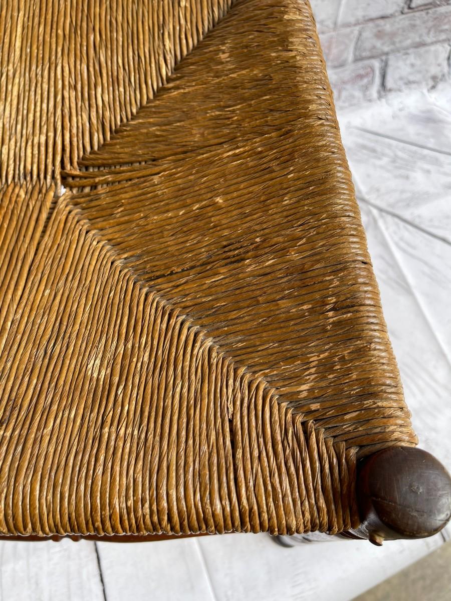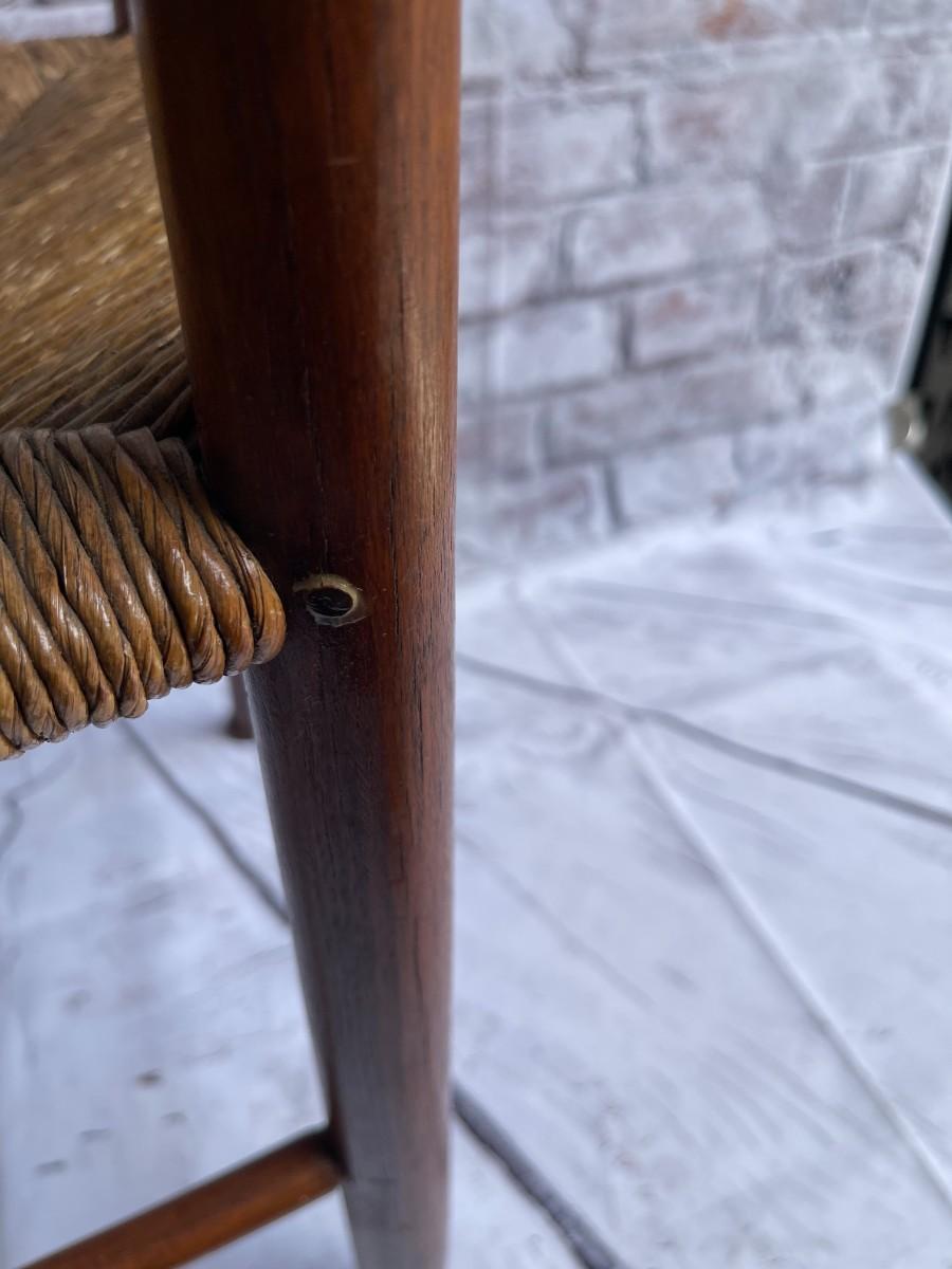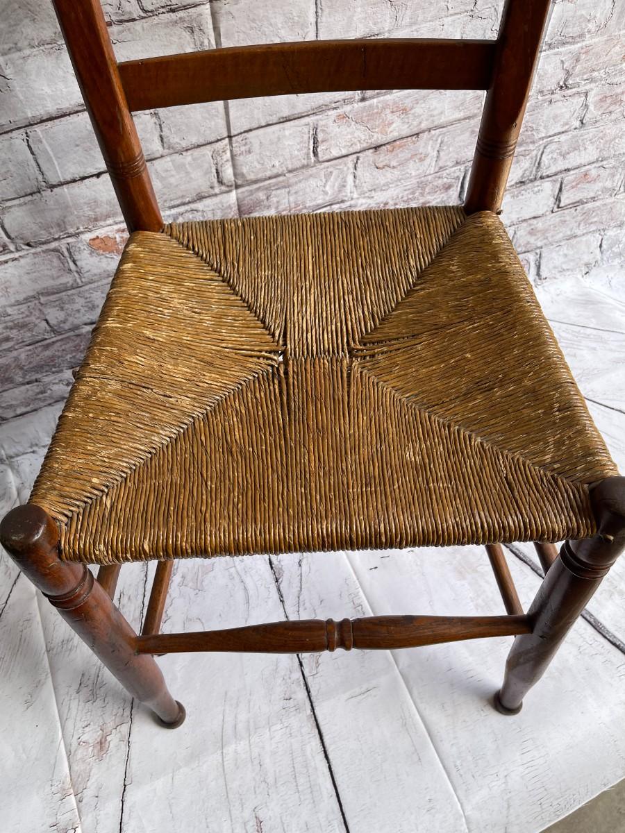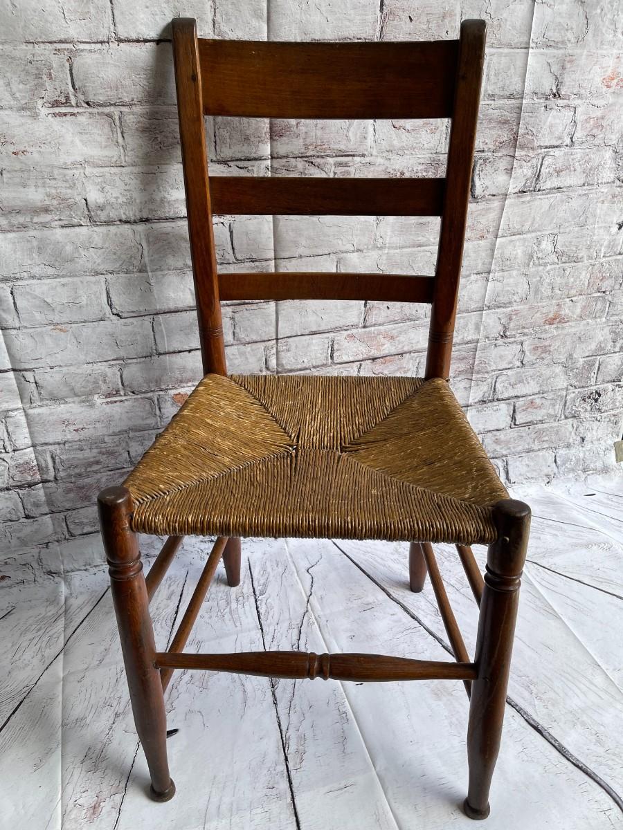 This is a single, brown solid wood ladder back chair with rush seat. It's in good condition with some signs of wear and would make a lovely desk chair or accent chair. 33" high. Seat is 16" high, 13" deep and 16" wide. # 300