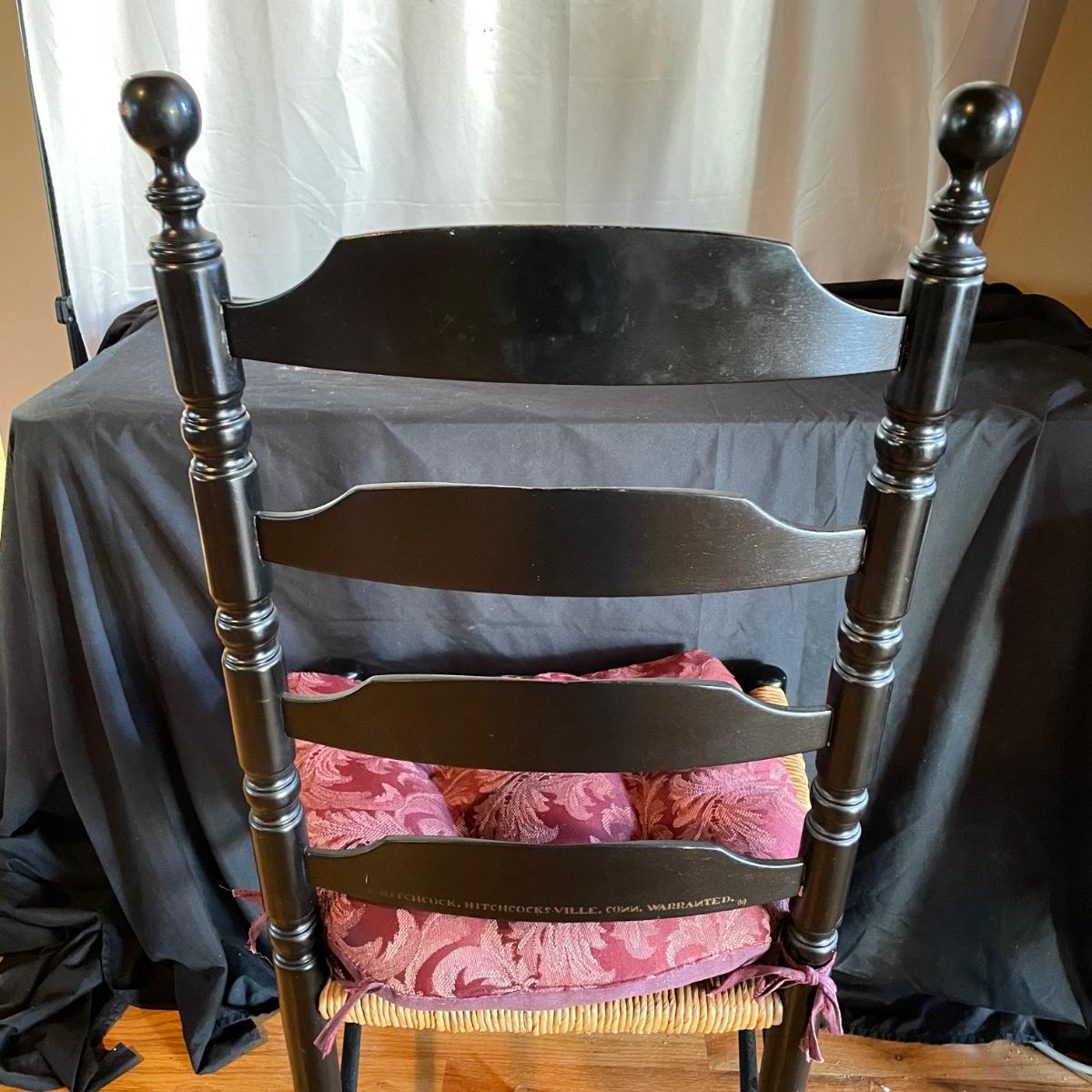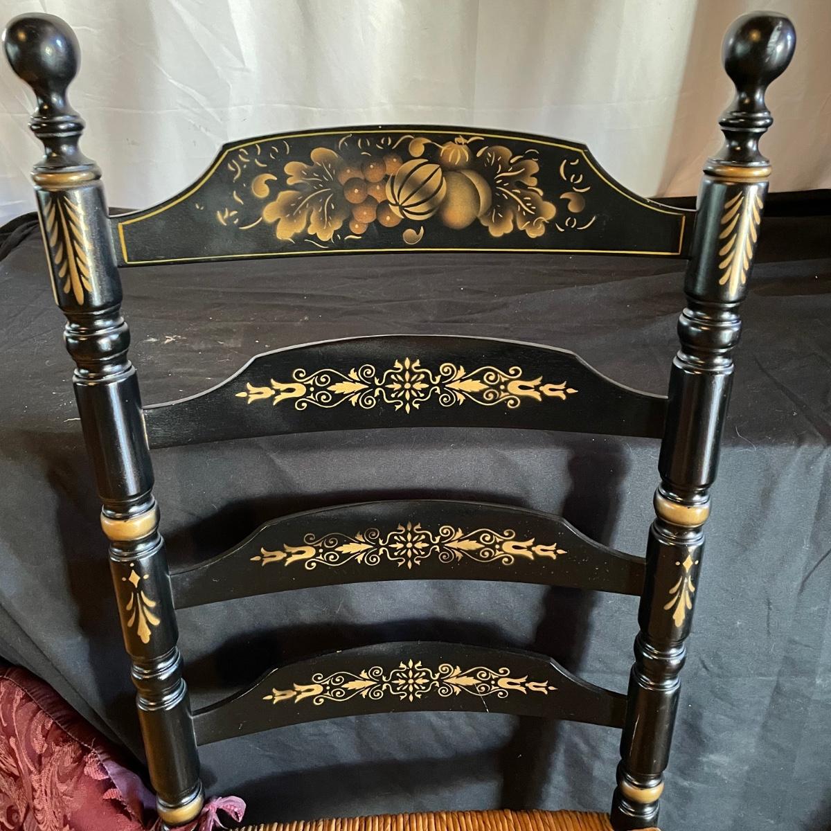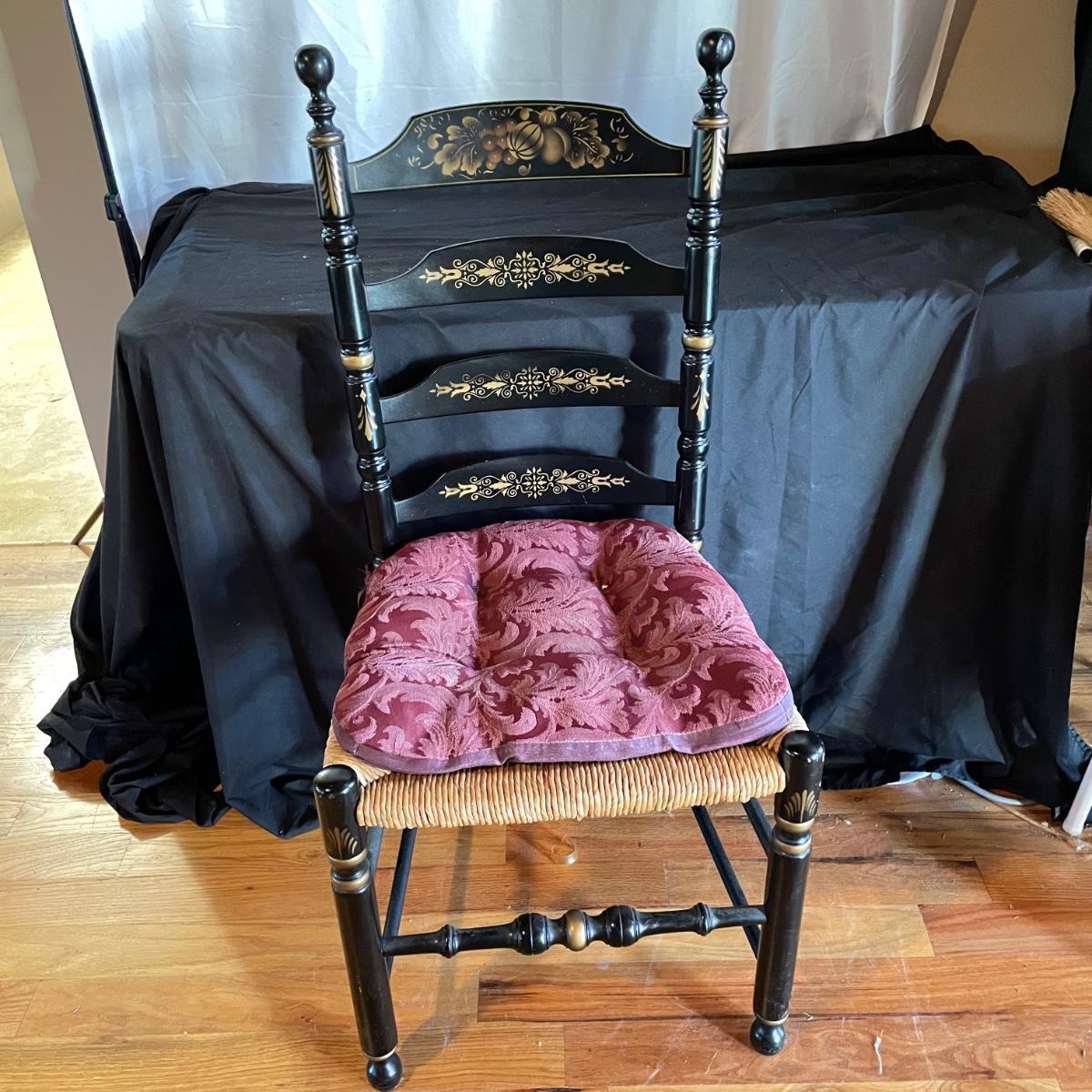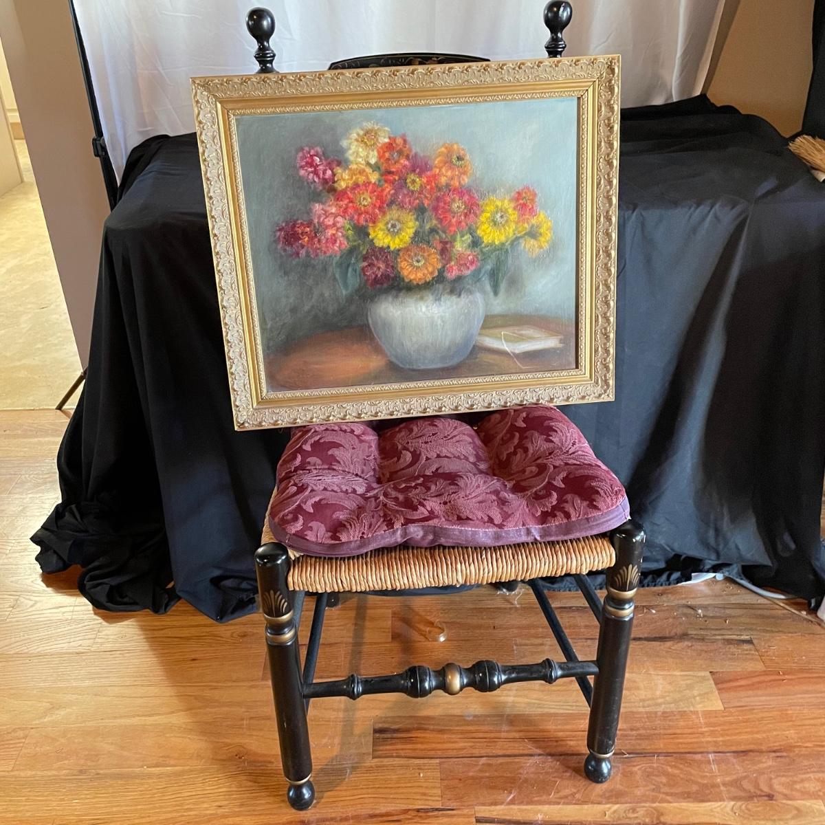 A beautiful Hitchcock style ladderback chair measures 19.5” x 17” x 41” with a seat height at 18”. This chair has a nice rush seat and golden accents. A couple dings noted in images. Chair is paired with a pretty gold framed still life floral oil painting. Art is professionally framed, the wooden frame measures approximately 23” x 19.5”. There is a blemish on the art in the lower right corner, it appears to be a superficial scrape, leaving the paint underneath showing through. See images. Local pick up only.
