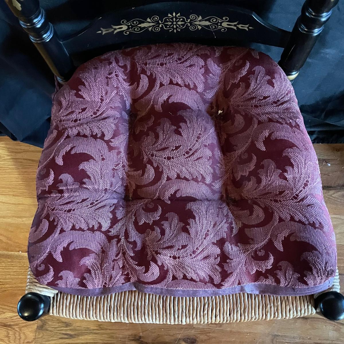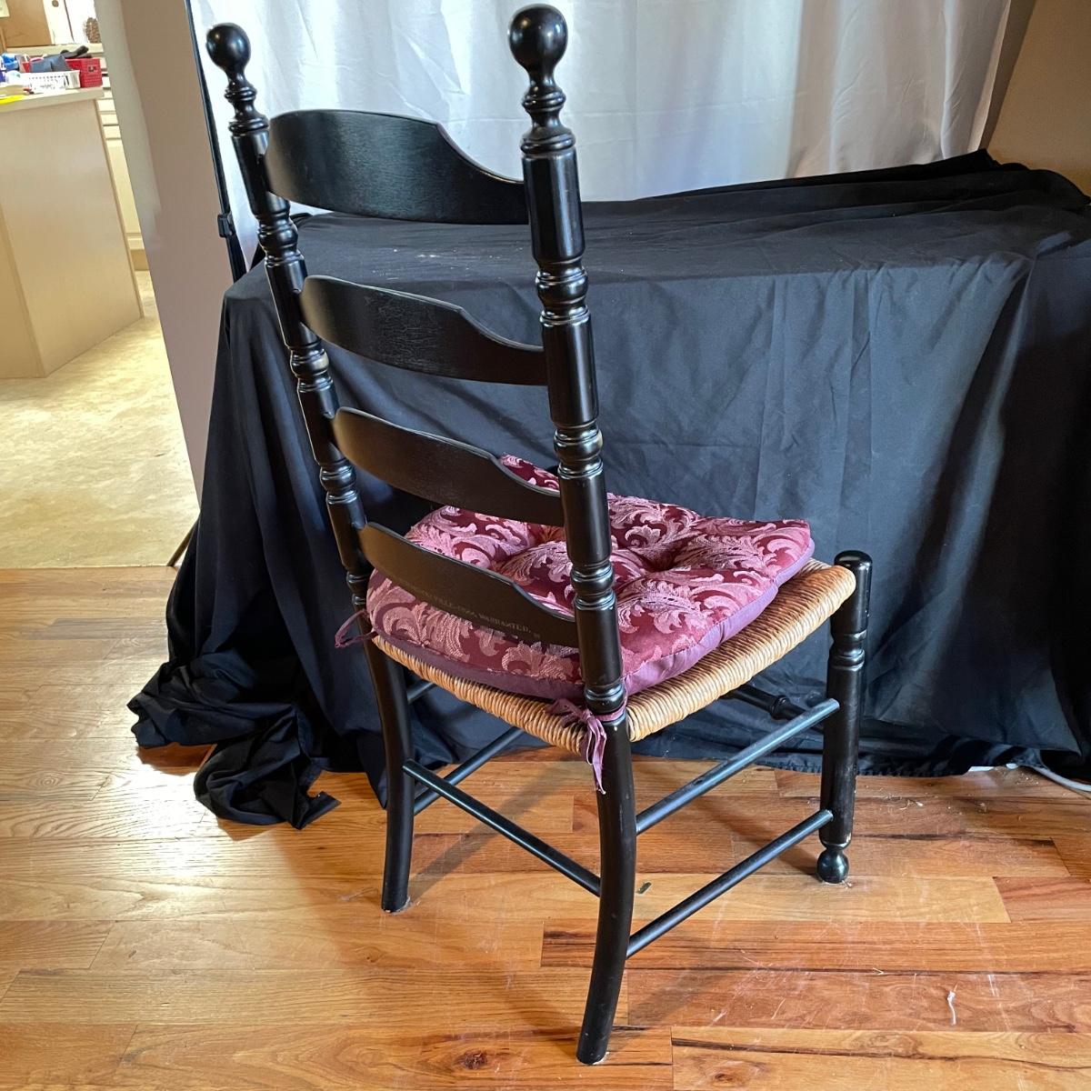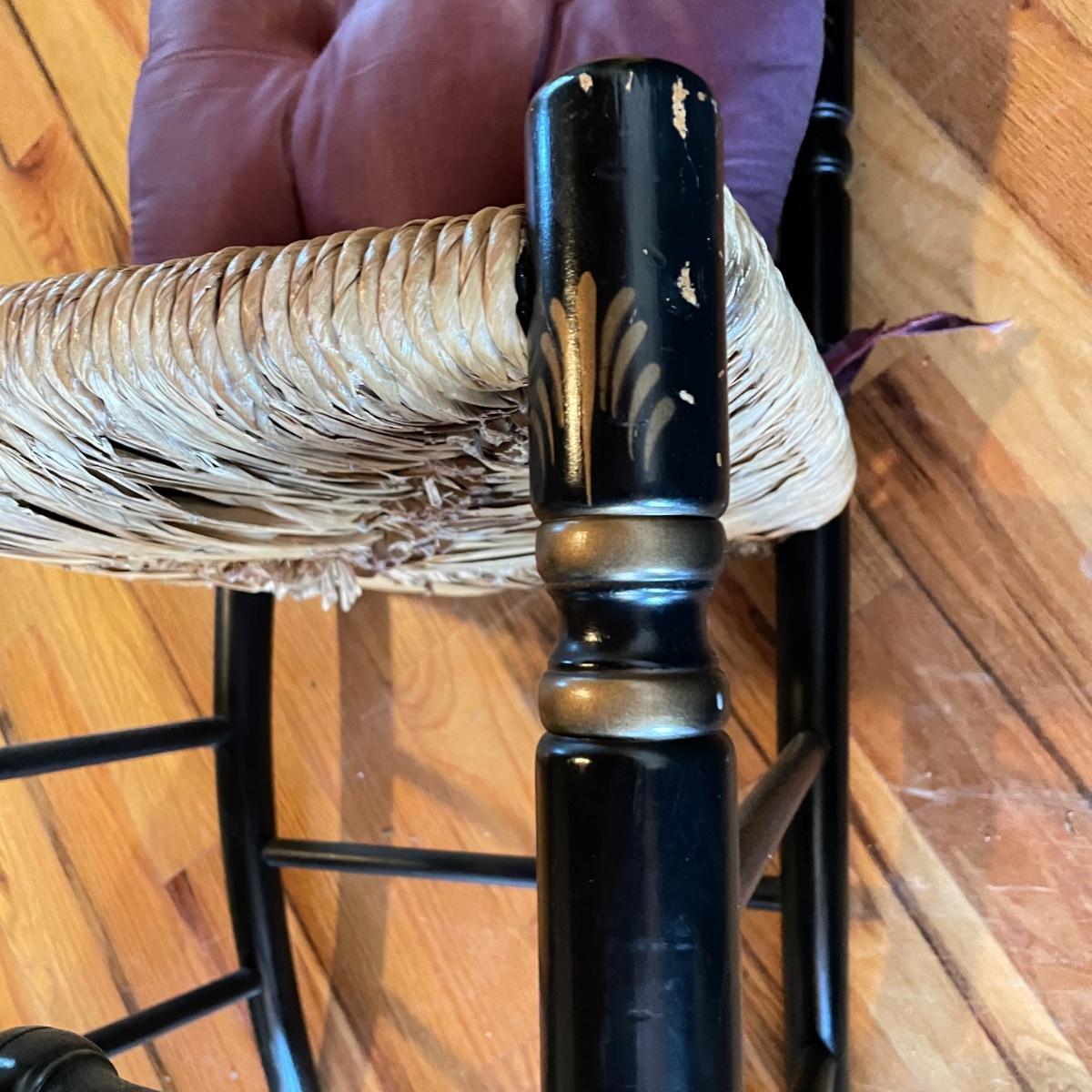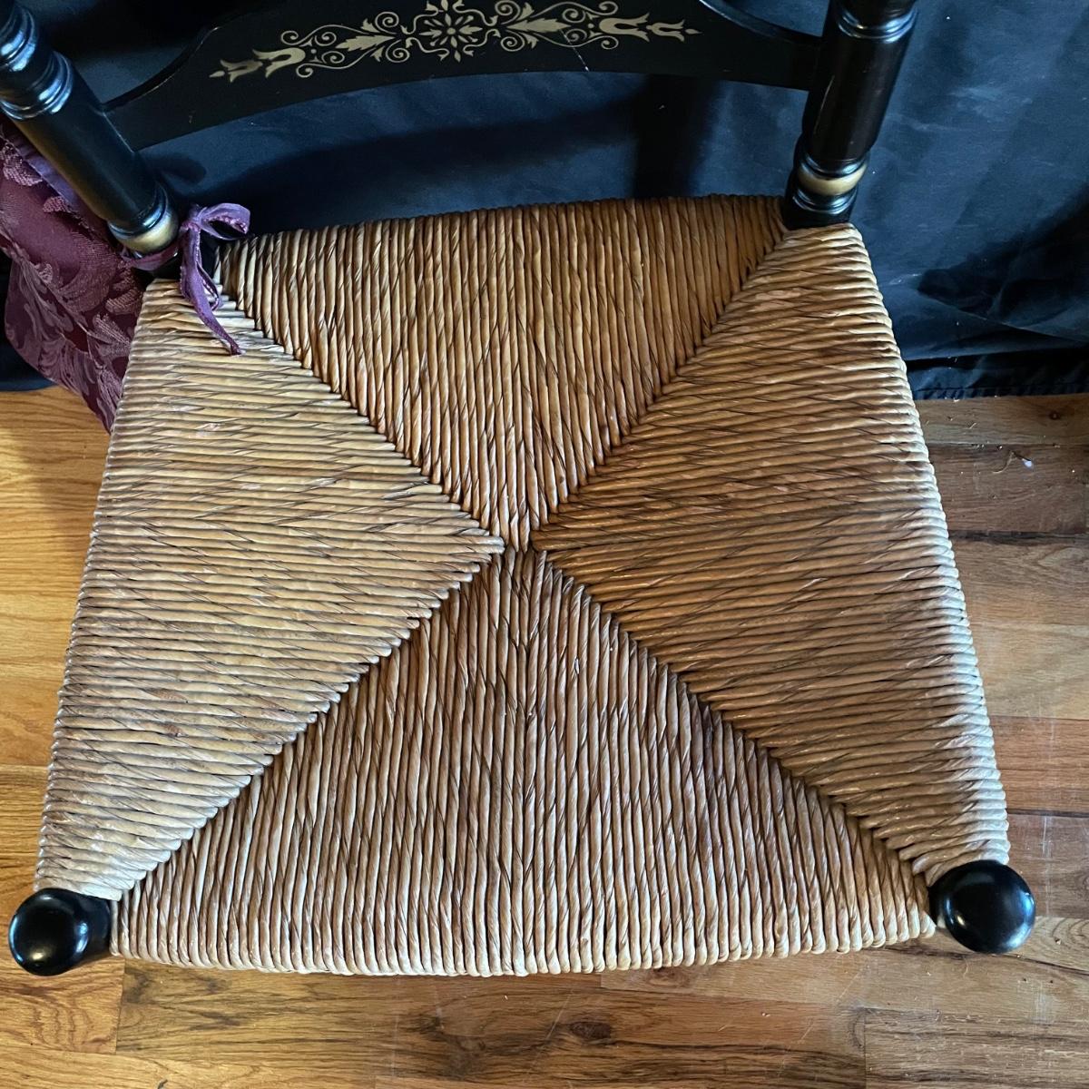 A beautiful Hitchcock style ladderback chair measures 19.5” x 17” x 41” with a seat height at 18”. This chair has a nice rush seat and golden accents. A couple dings noted in images. Chair is paired with a pretty gold framed still life floral oil painting. Art is professionally framed, the wooden frame measures approximately 23” x 19.5”. There is a blemish on the art in the lower right corner, it appears to be a superficial scrape, leaving the paint underneath showing through. See images. Local pick up only.