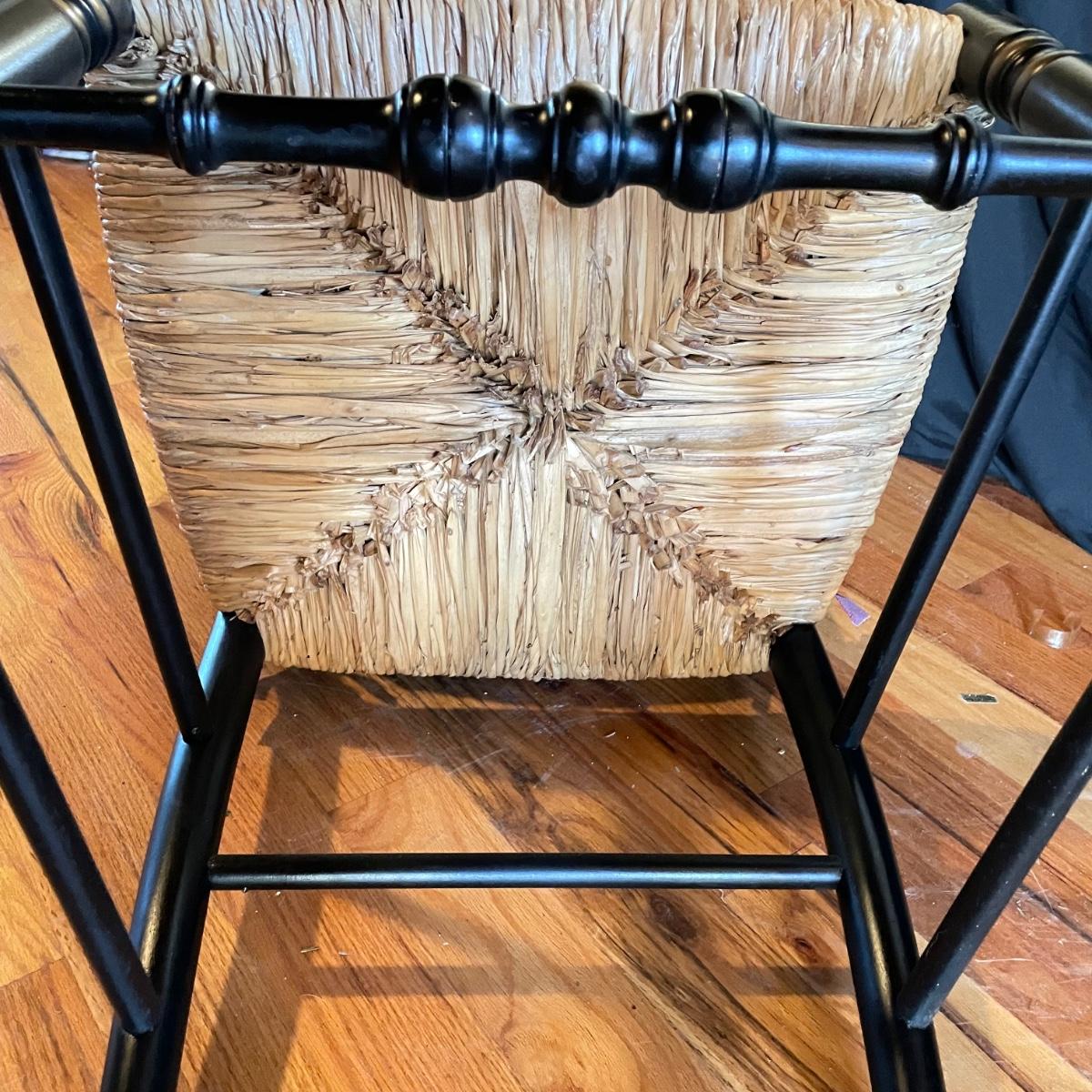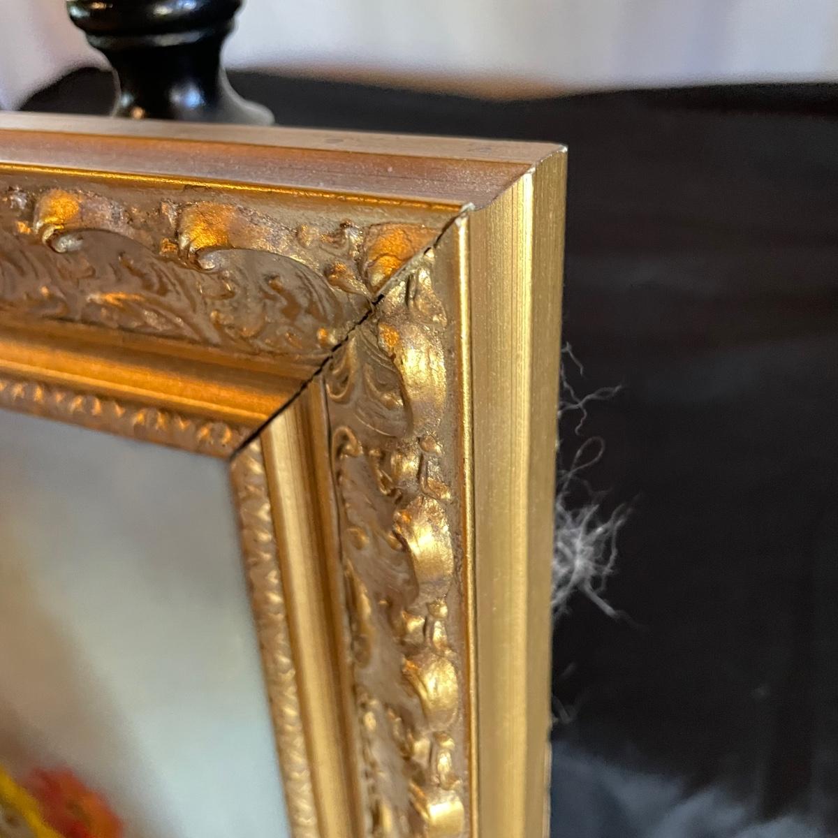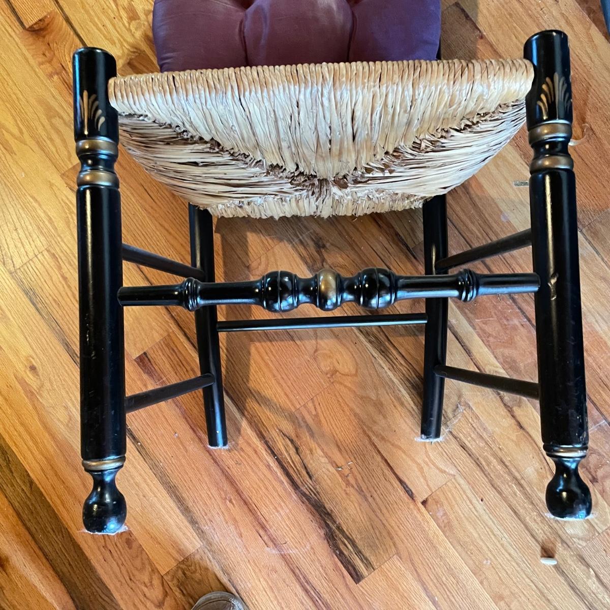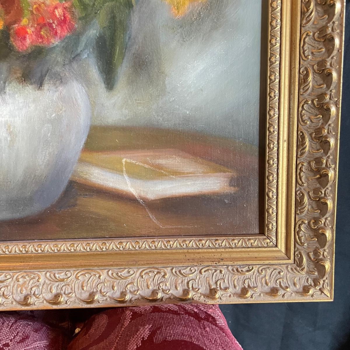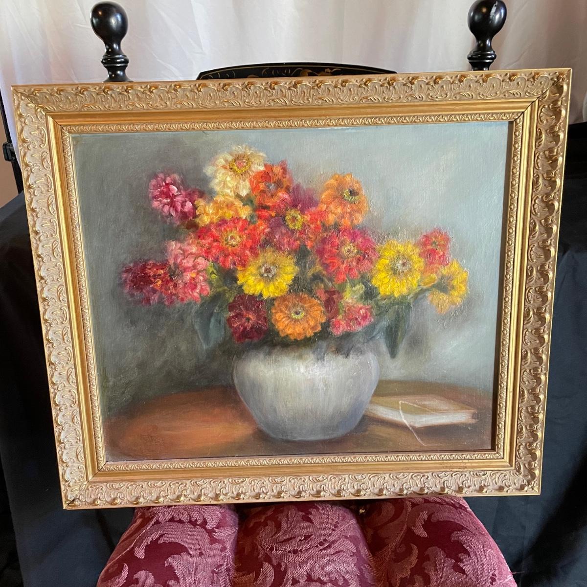 A beautiful Hitchcock style ladderback chair measures 19.5” x 17” x 41” with a seat height at 18”. This chair has a nice rush seat and golden accents. A couple dings noted in images. Chair is paired with a pretty gold framed still life floral oil painting. Art is professionally framed, the wooden frame measures approximately 23” x 19.5”. There is a blemish on the art in the lower right corner, it appears to be a superficial scrape, leaving the paint underneath showing through. See images. Local pick up only.