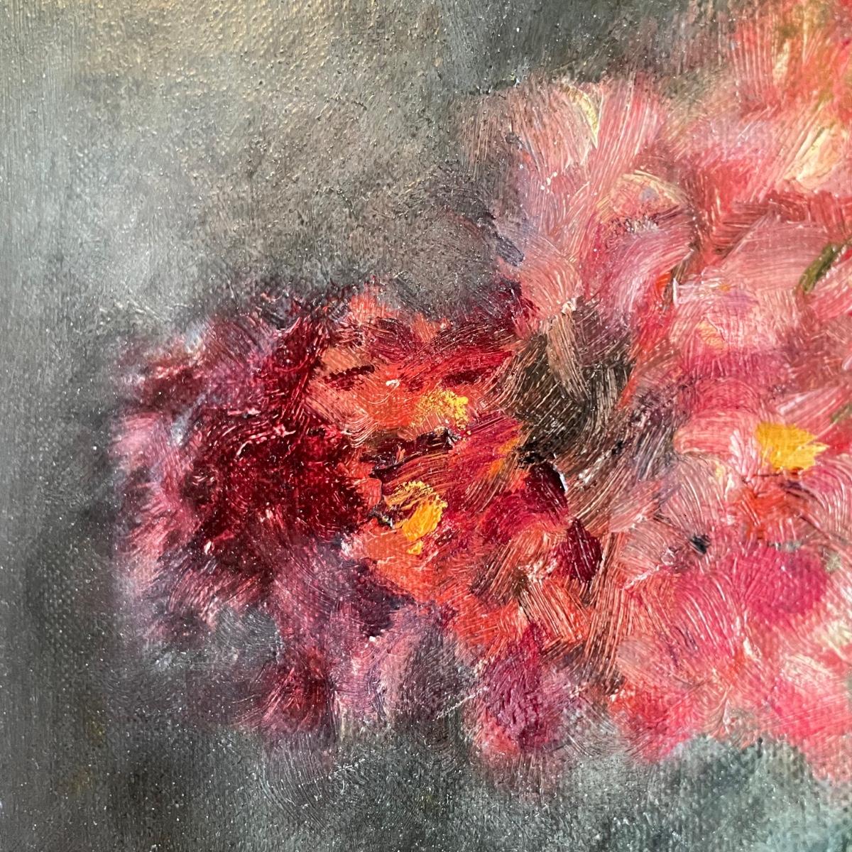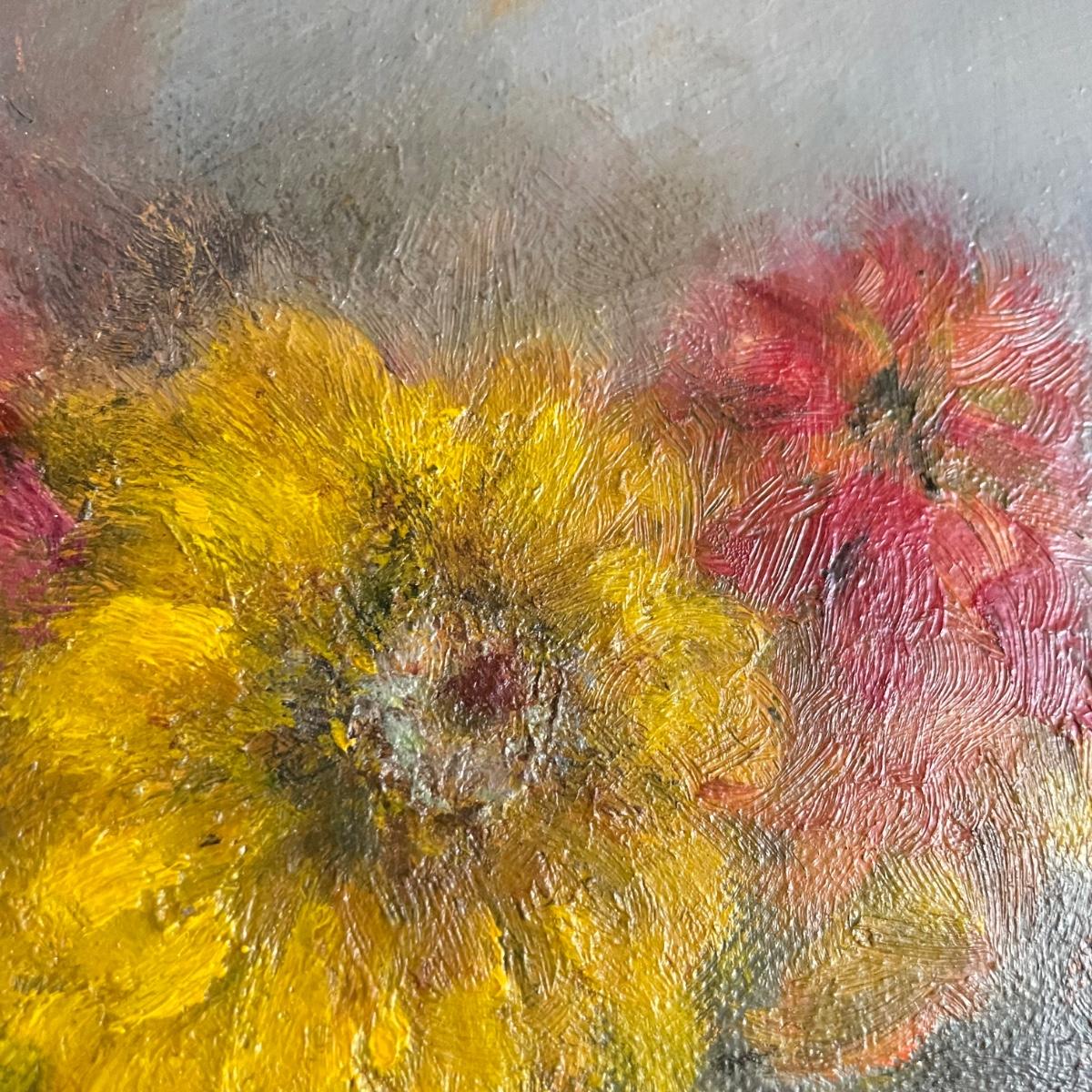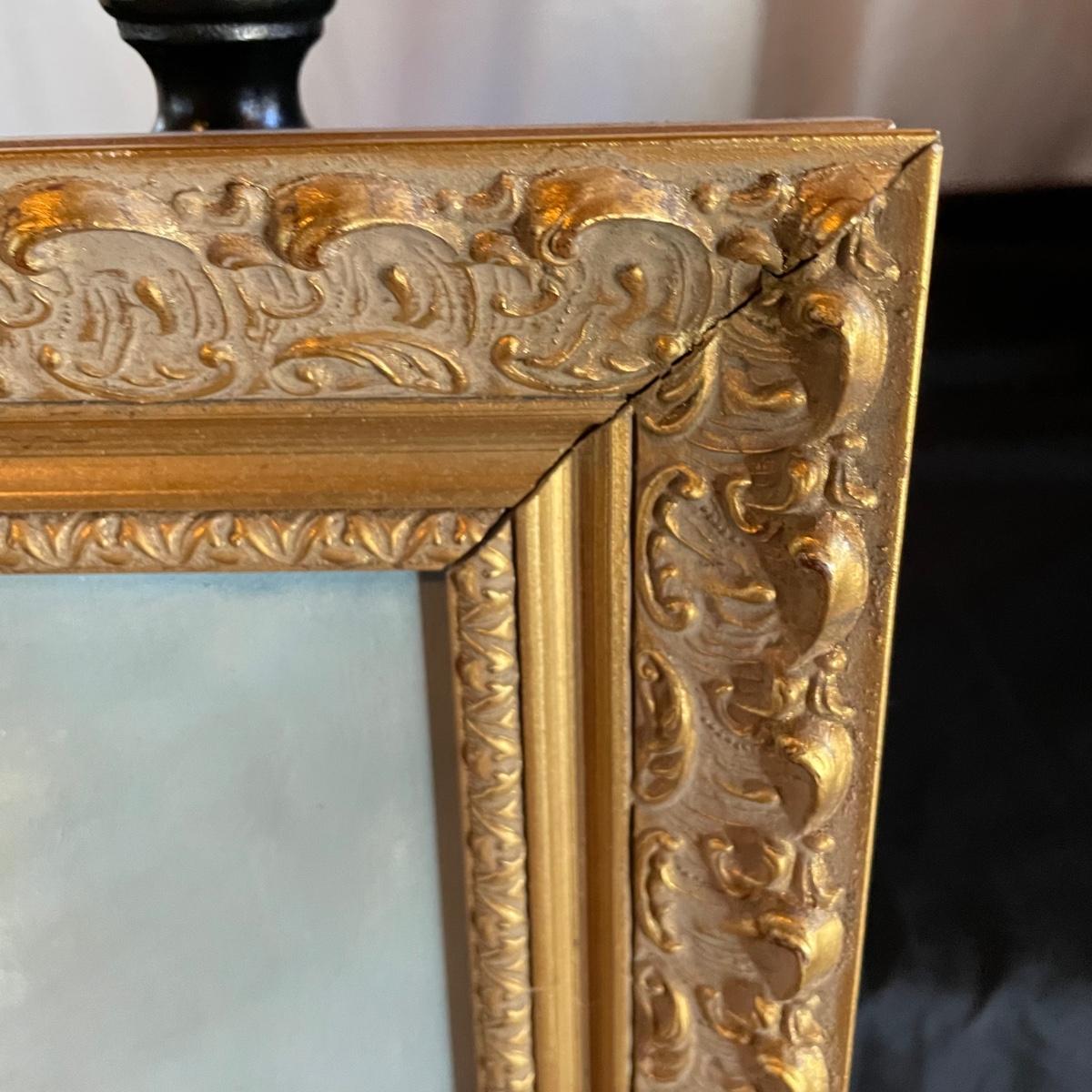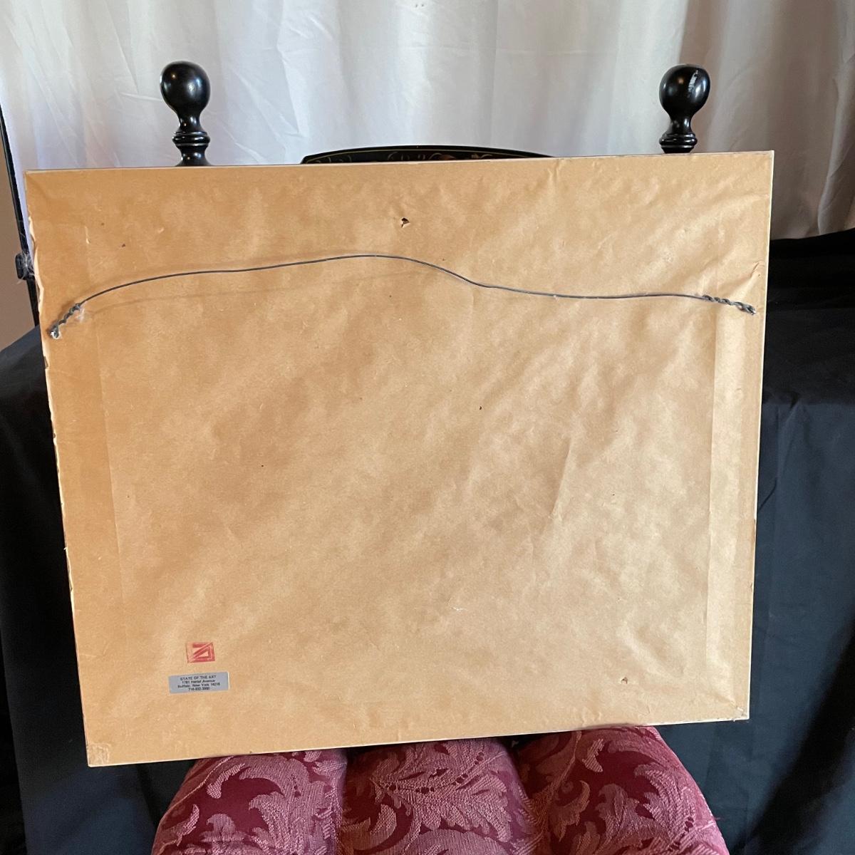 A beautiful Hitchcock style ladderback chair measures 19.5” x 17” x 41” with a seat height at 18”. This chair has a nice rush seat and golden accents. A couple dings noted in images. Chair is paired with a pretty gold framed still life floral oil painting. Art is professionally framed, the wooden frame measures approximately 23” x 19.5”. There is a blemish on the art in the lower right corner, it appears to be a superficial scrape, leaving the paint underneath showing through. See images. Local pick up only.