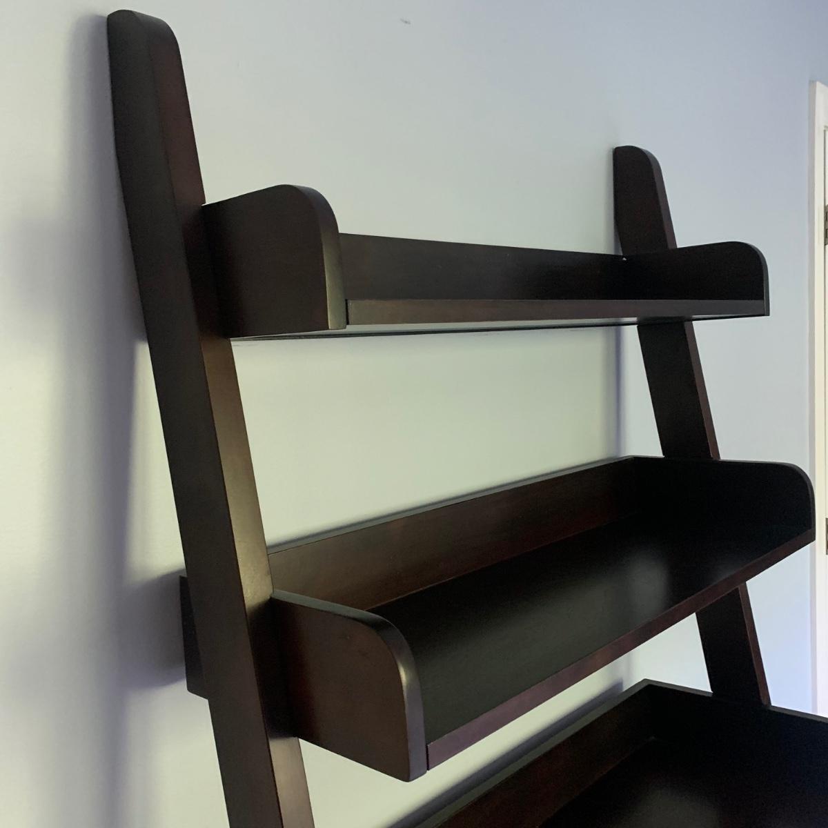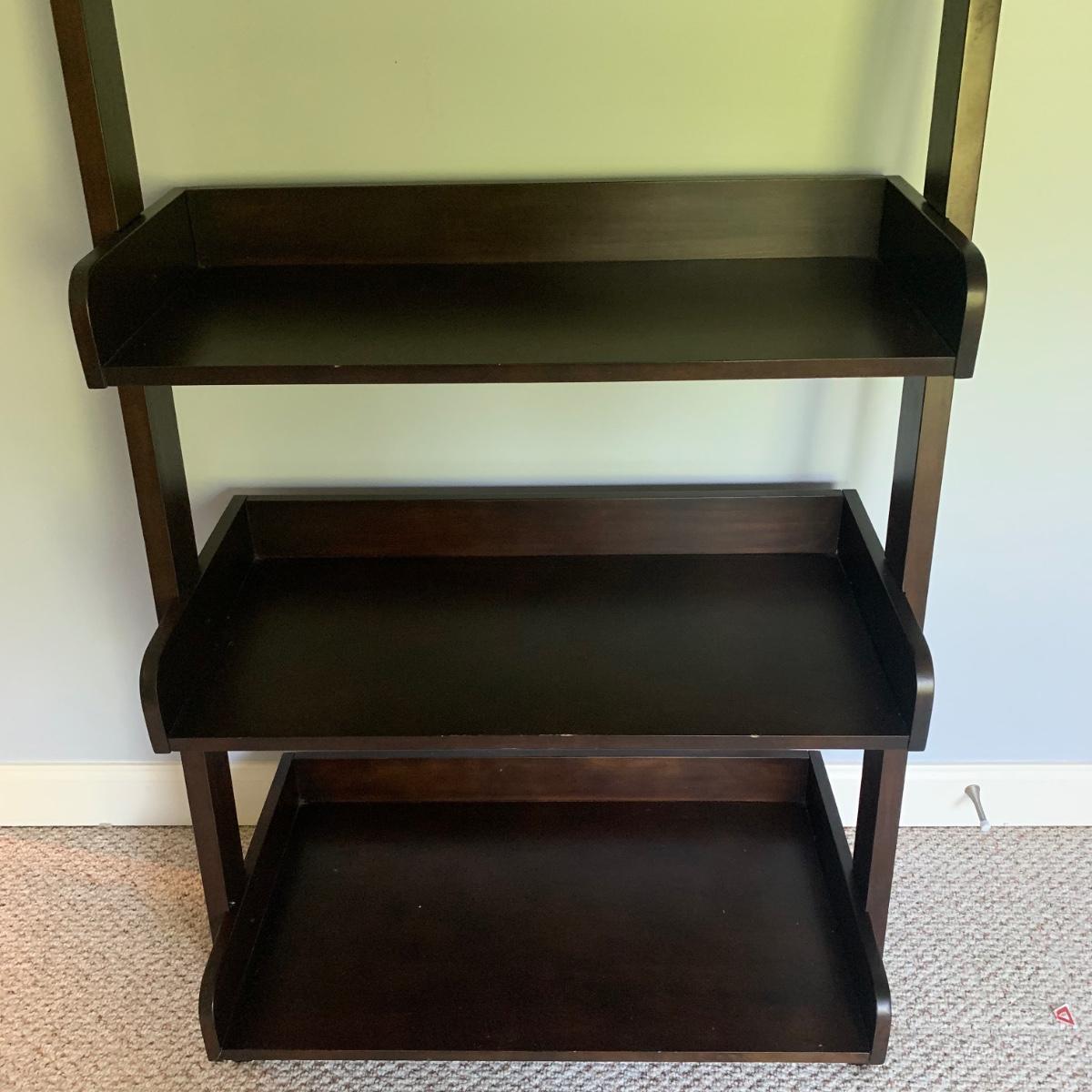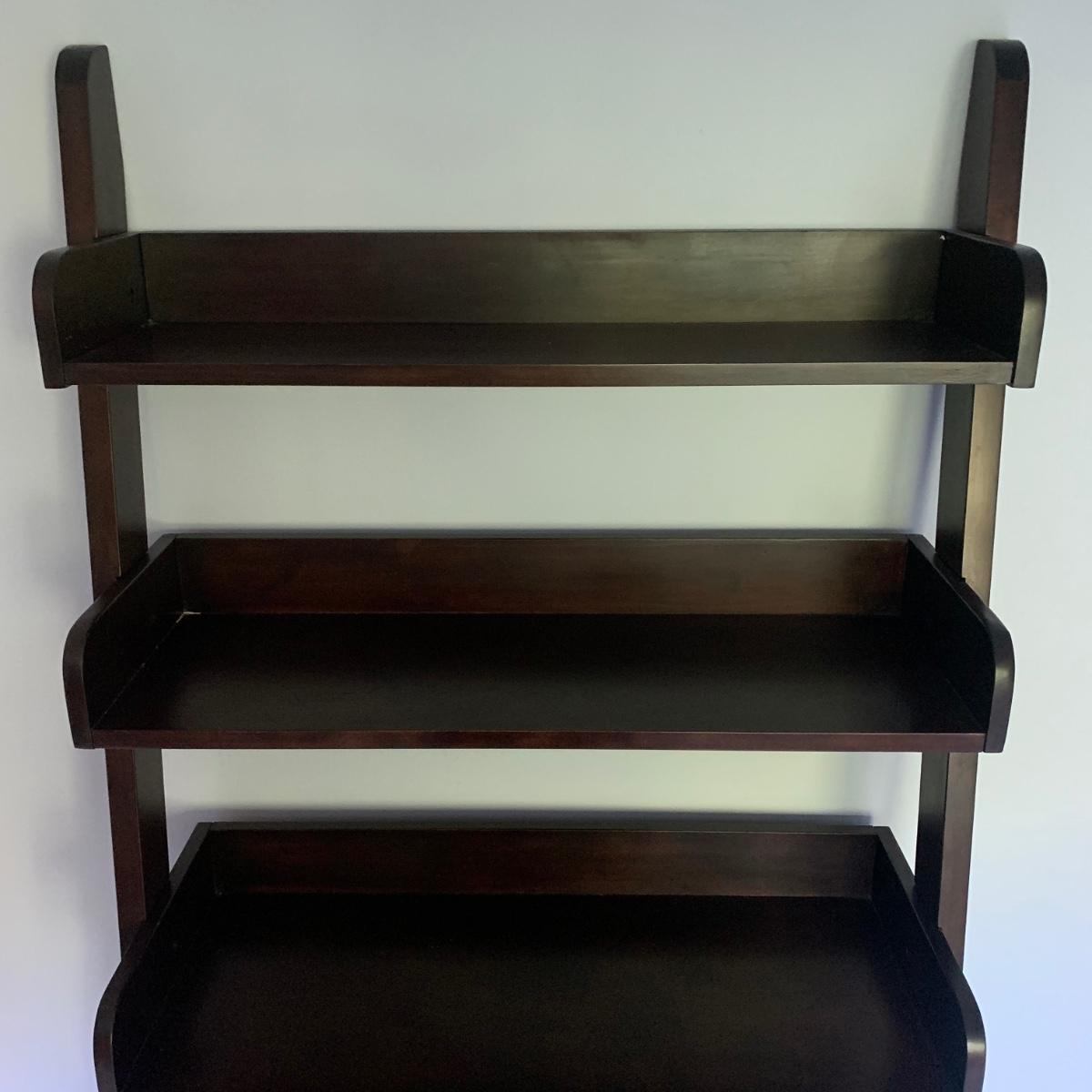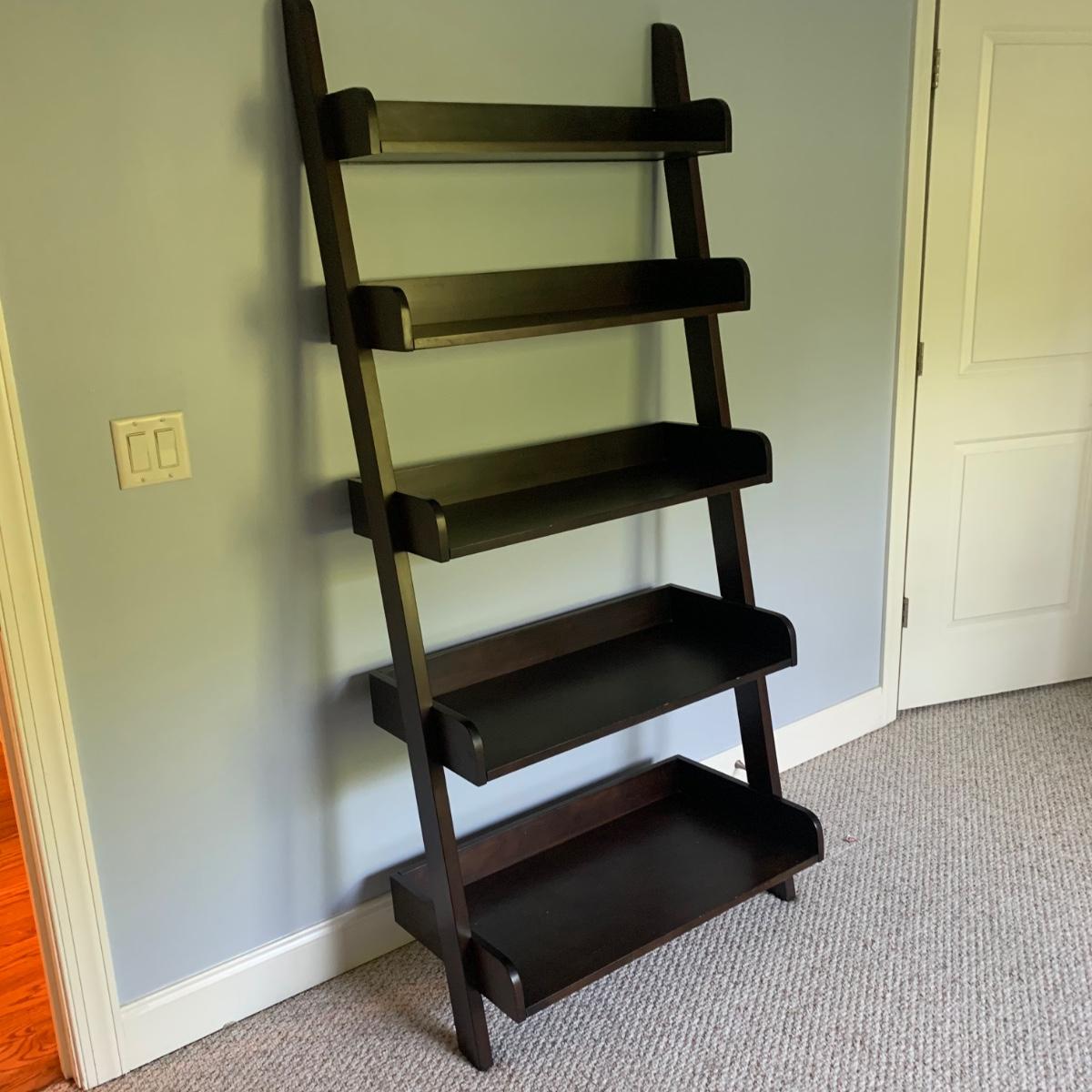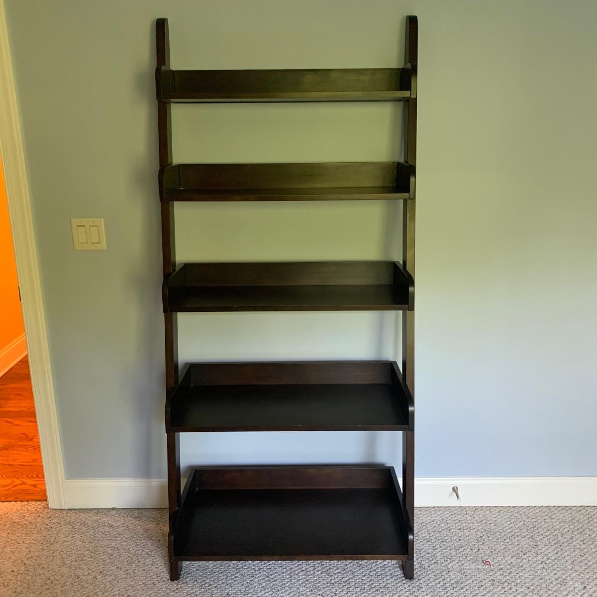 Ladder style bookshelf with five shelves. Unit is made of dark stained wood and measures approximately 33.5” x 18” x 74”H. Please see photos for more details. Please note that a few shelves could use tightening. Local pickup only. Winning bidder must bring assistance to help move and load this item due to its weight and/or size. Shelf will need to be moved down a flight of stairs and throughout the home to the exit.