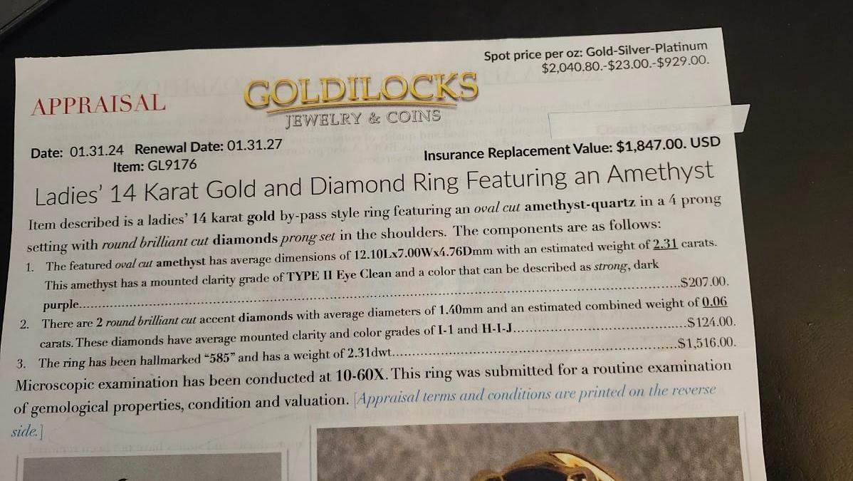 This lovely ring has been appraised at $ 1847.00. A portion of the appraisal can be seen in photo 4.