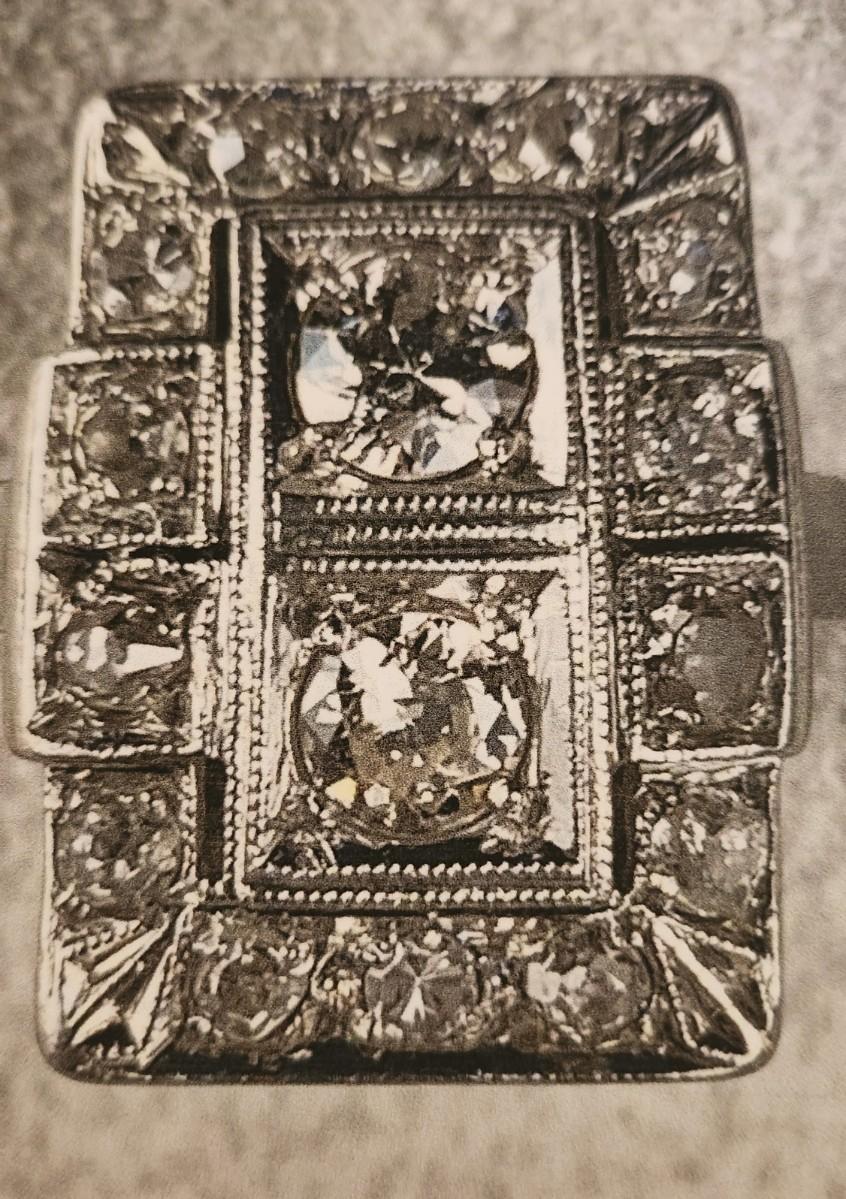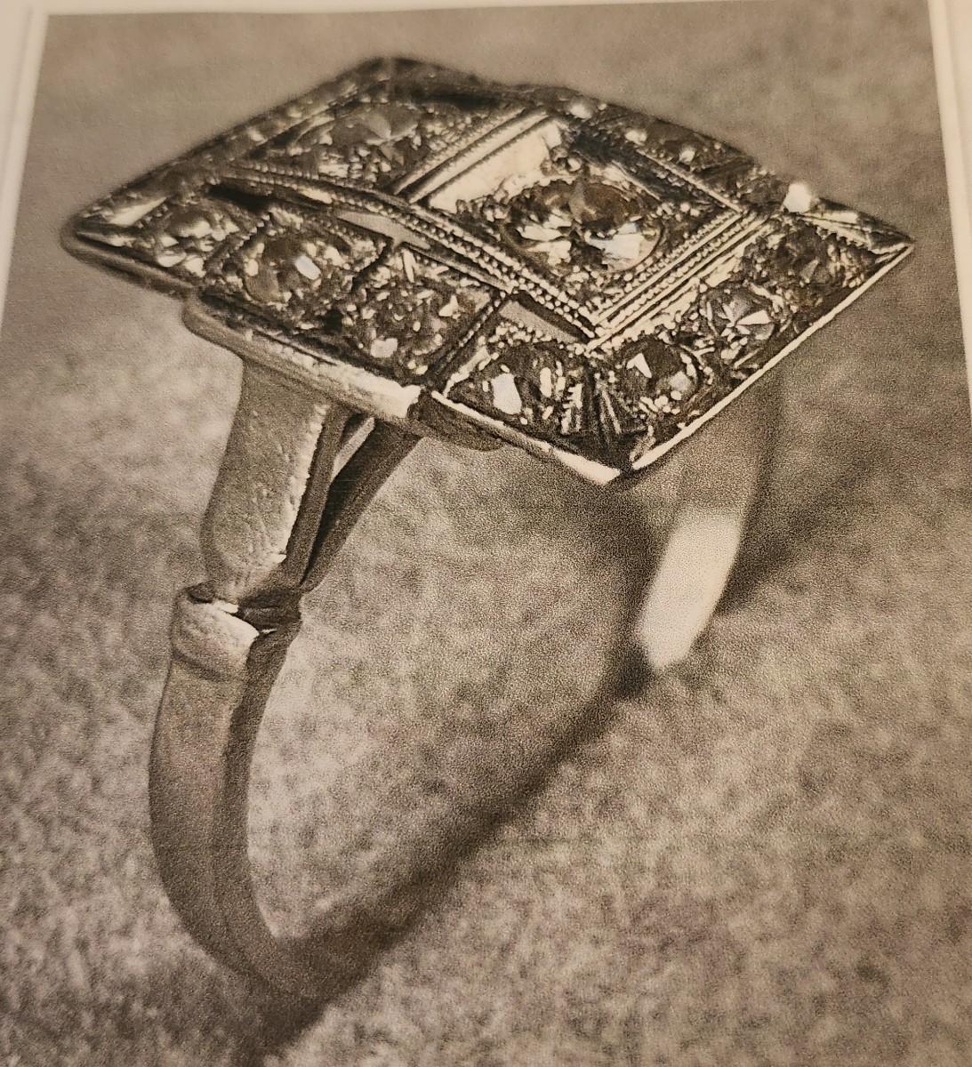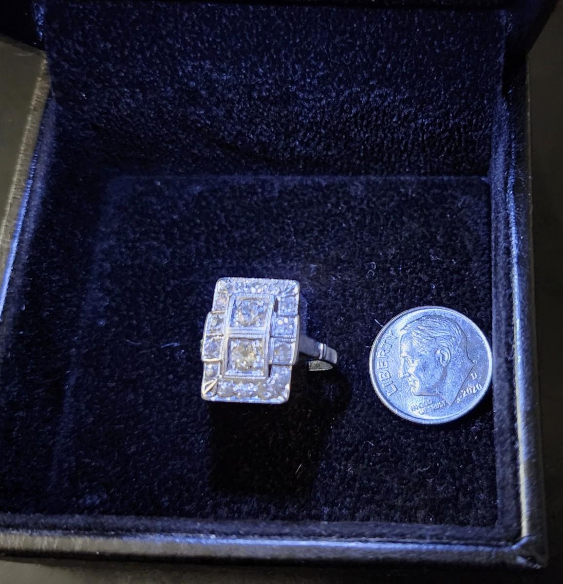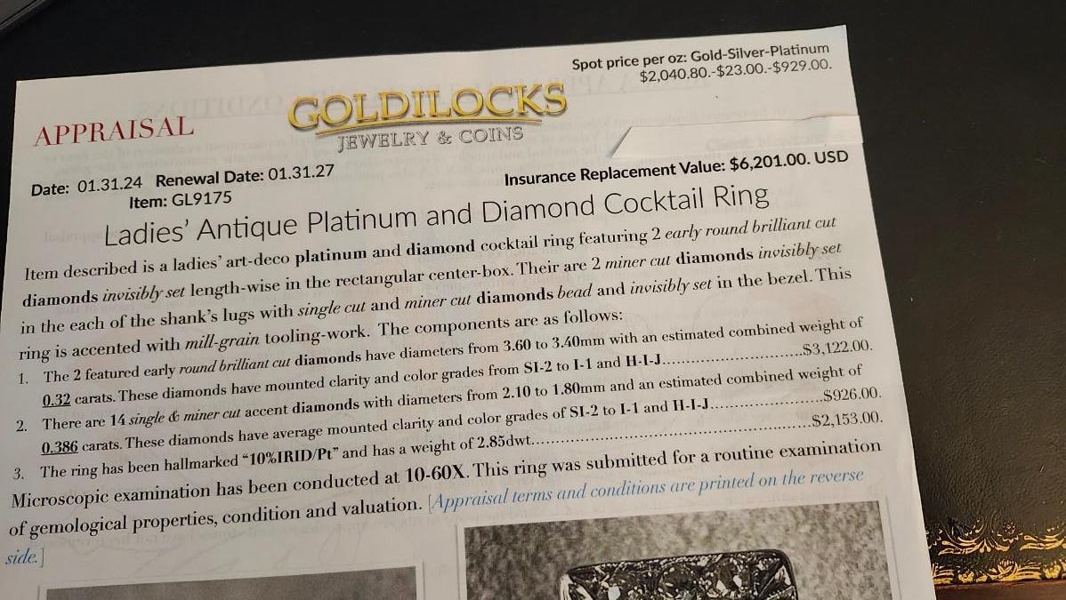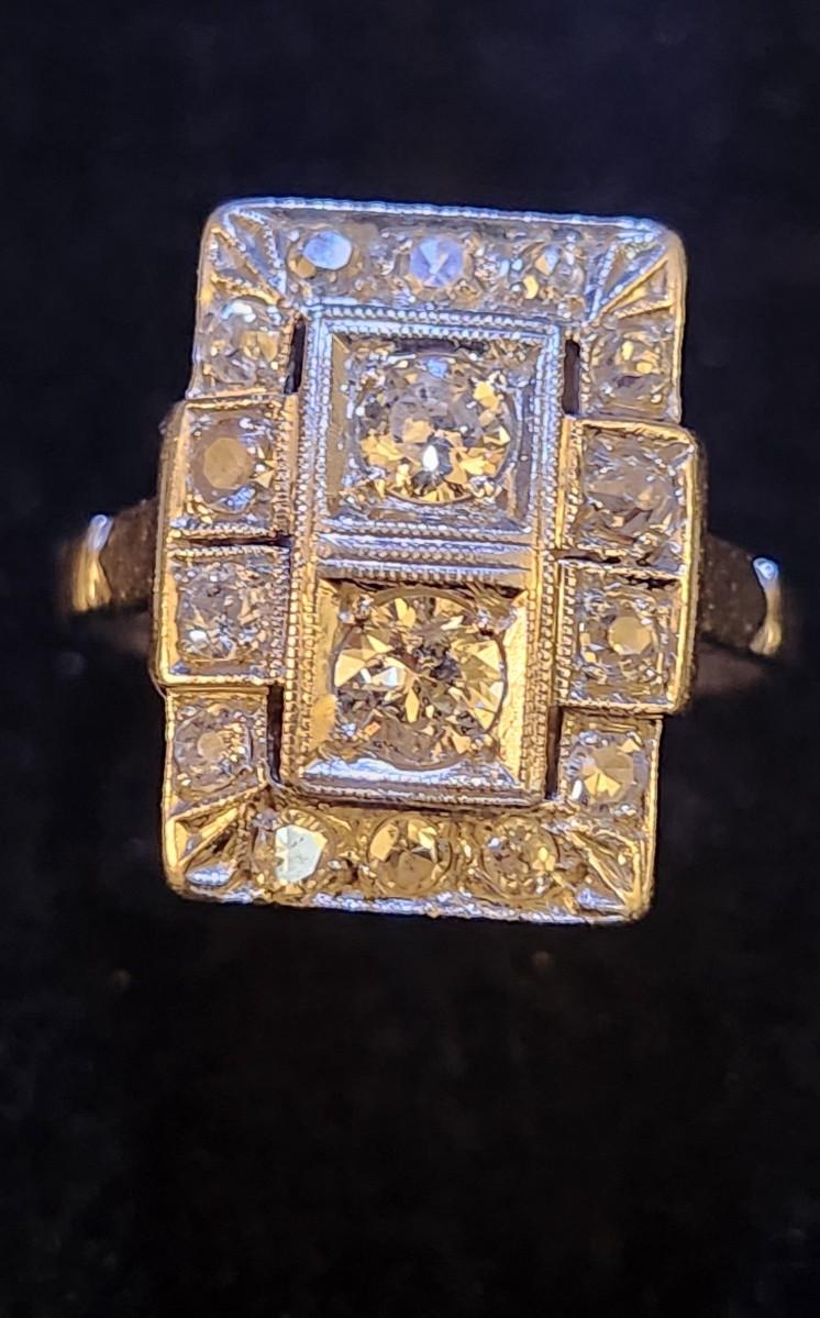 This lovely ring has been appraised at $6201.00, a portion of that appraisal is shown in photo 4. This ring features 2 early round brilliant cut diamonds invisibly set length-wise in the rectangular center-box. There are 2 miner cut diamonds invisibly set in each of the shank's lugs with single-cut and miner-cut diamonds bead and invisibly set in the bezel. This ring is accented with mill-grain tooling-work.