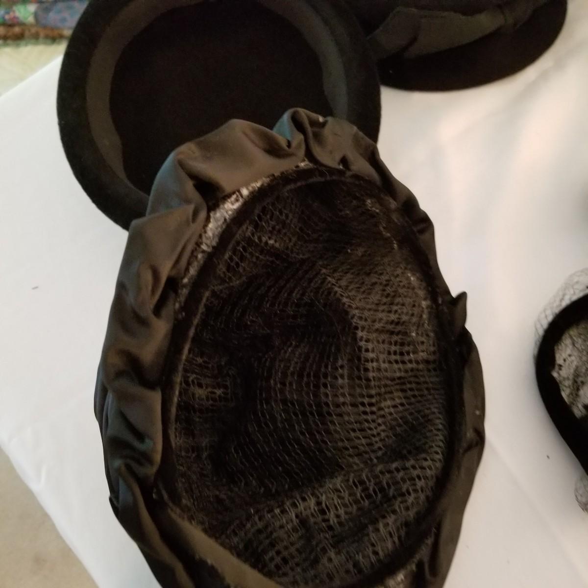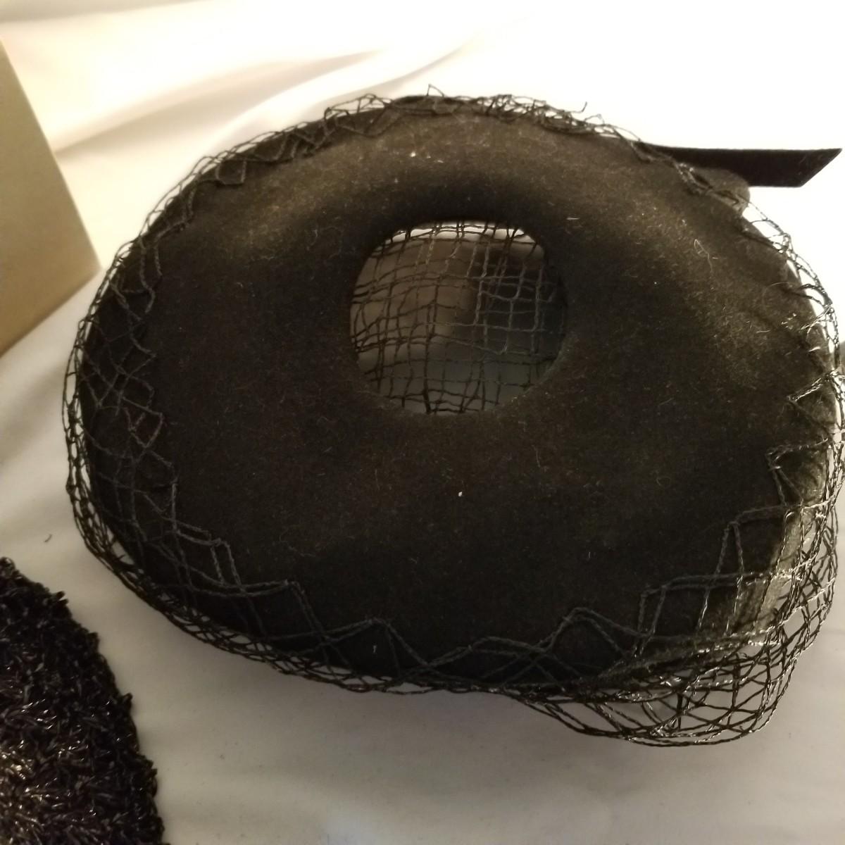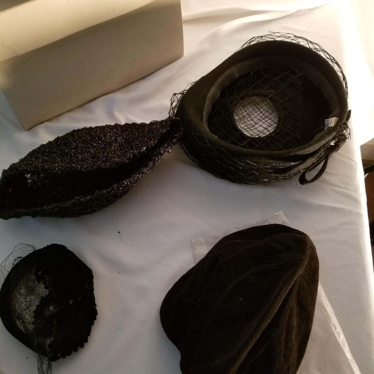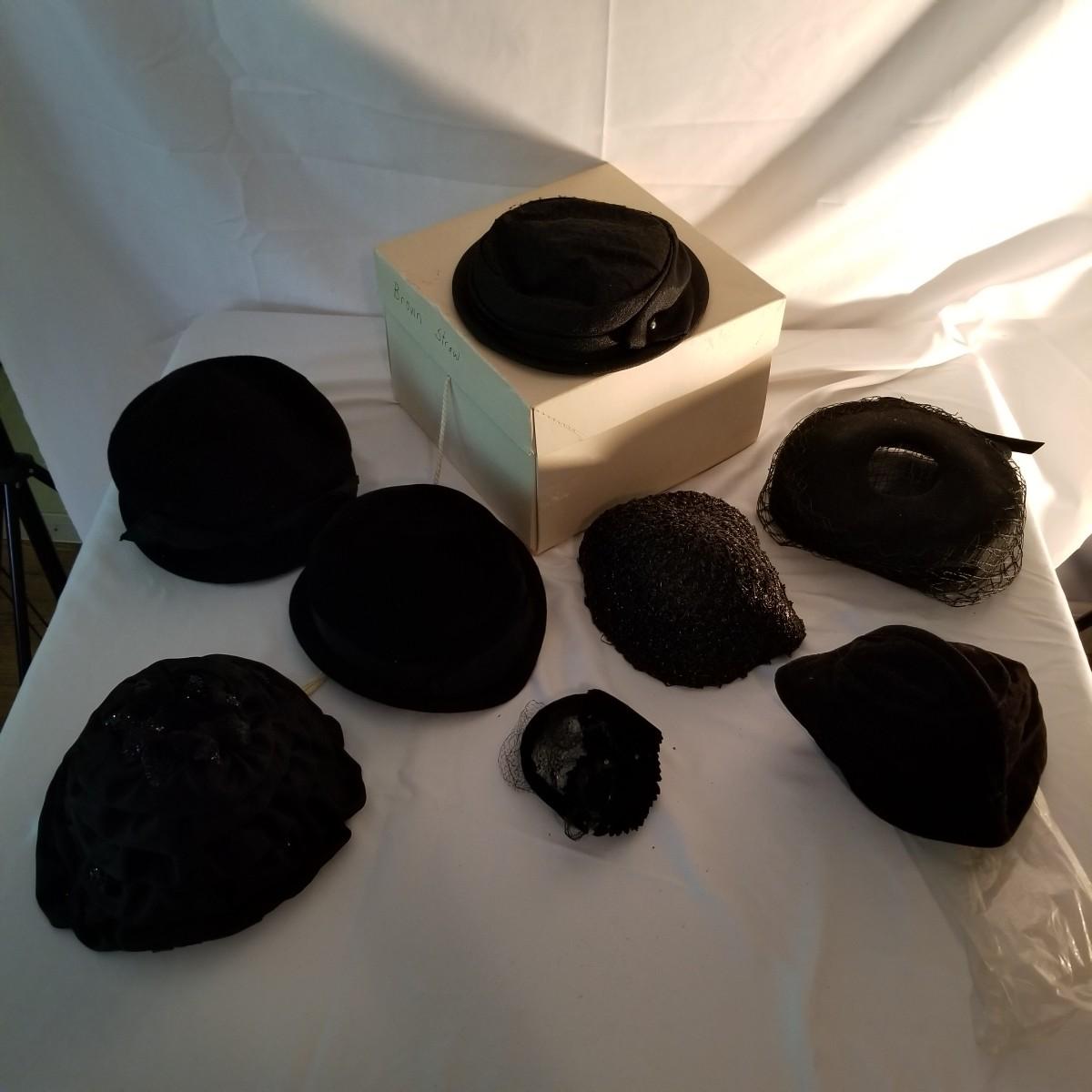 Seven ladies black hats, various styles. One wool, one velour, others assorted materials. With older Belk hatbox. See photos for detail. Shipping available.