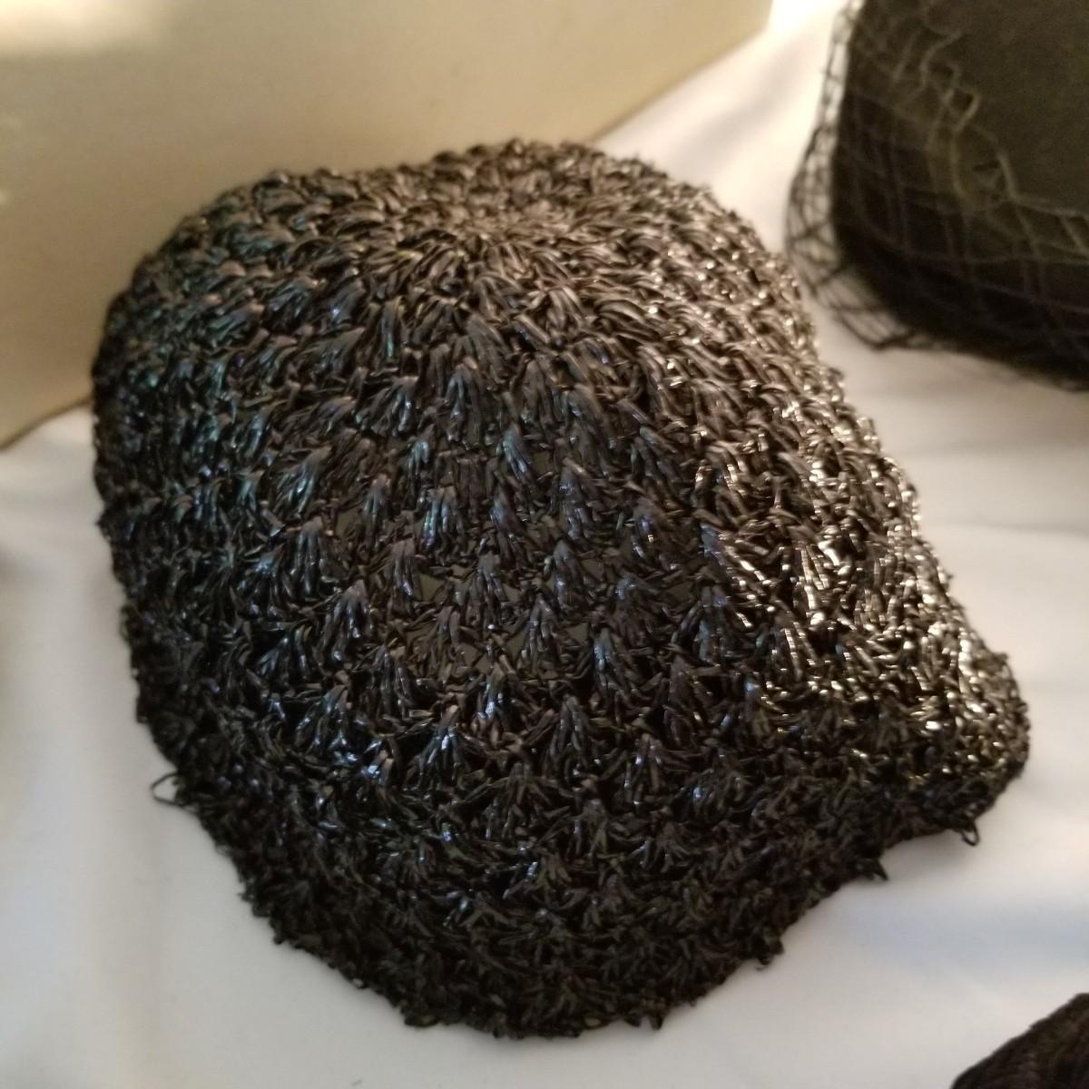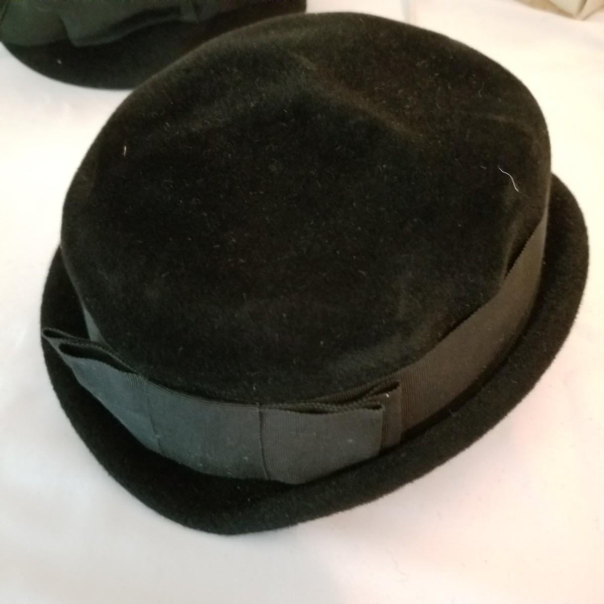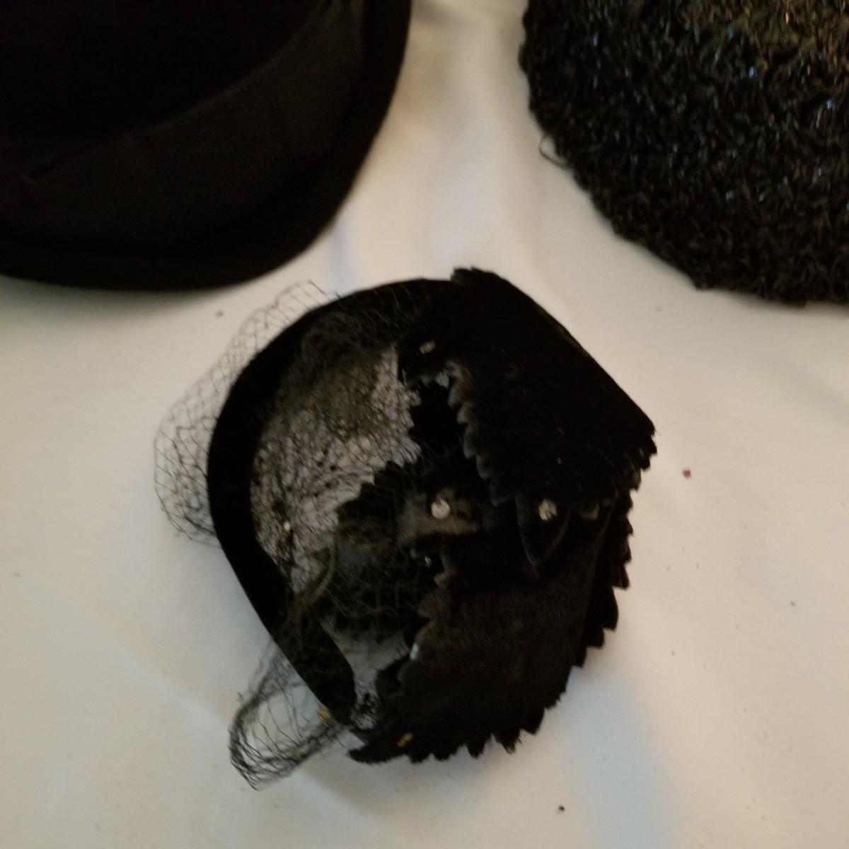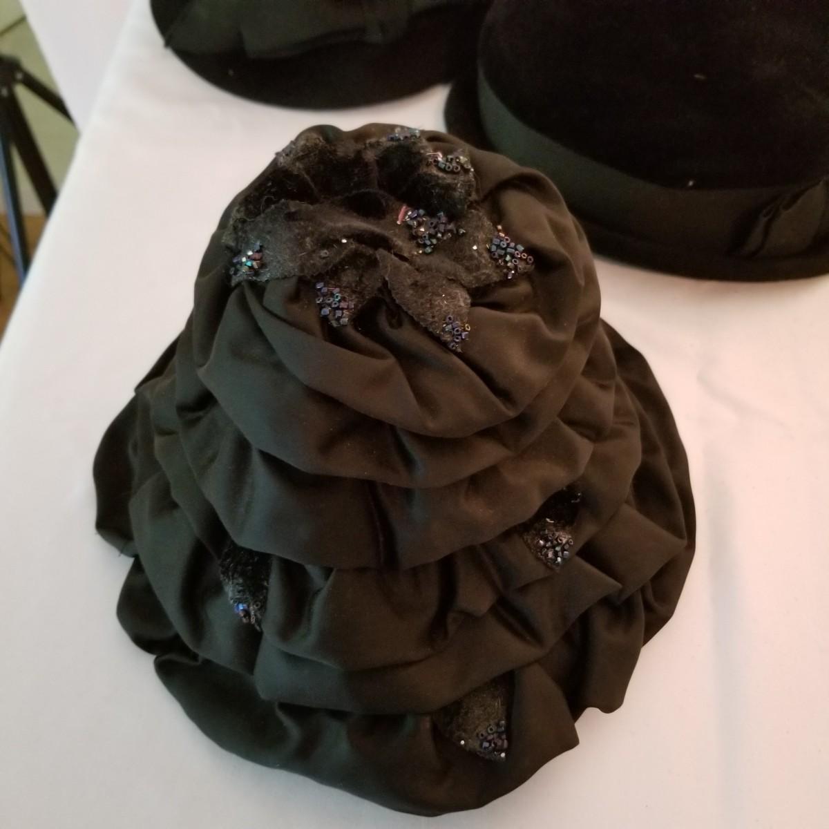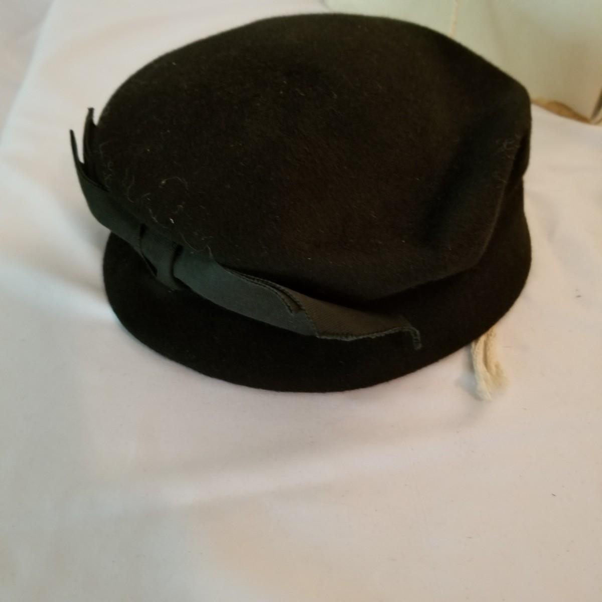 Seven ladies black hats, various styles. One wool, one velour, others assorted materials. With older Belk hatbox. See photos for detail. Shipping available.