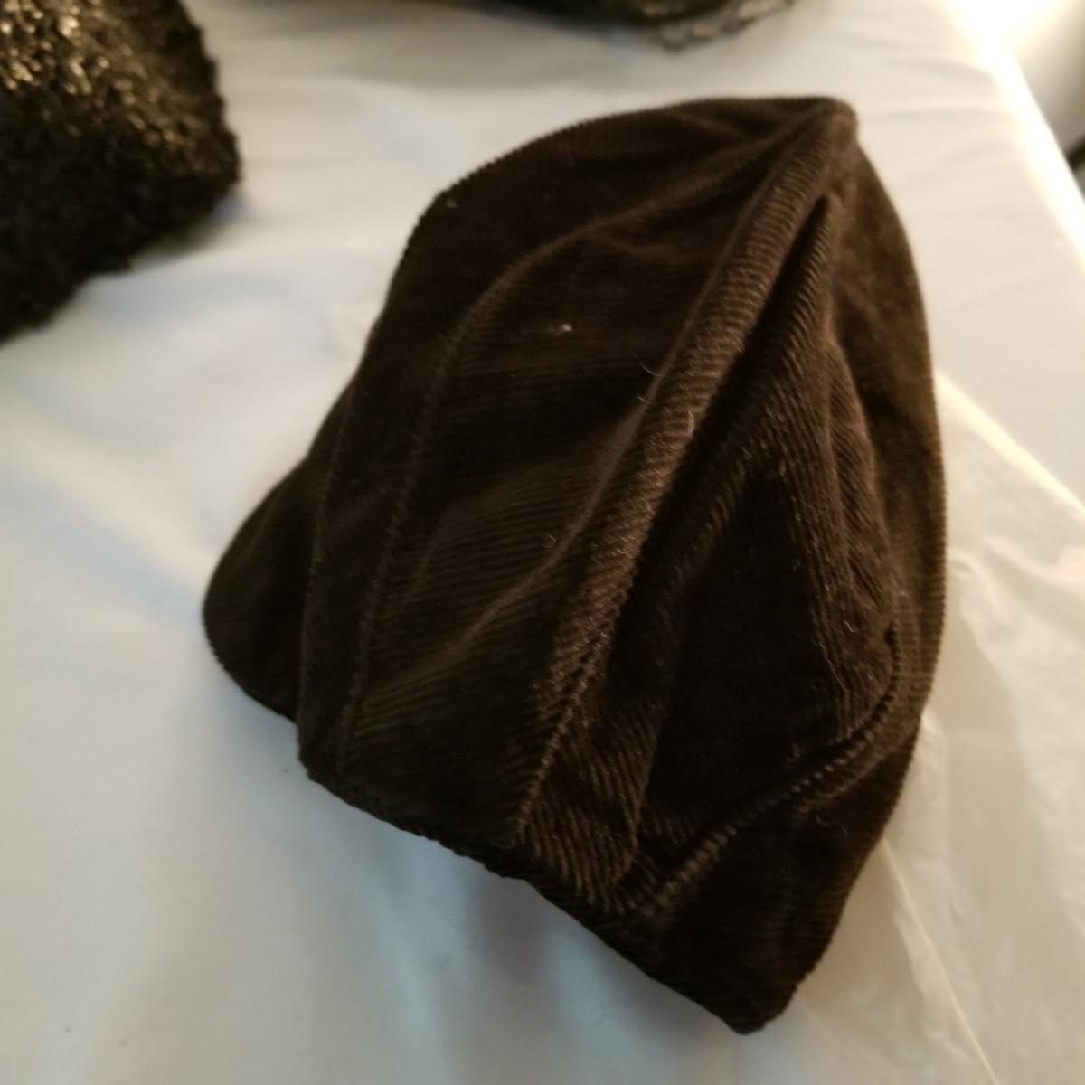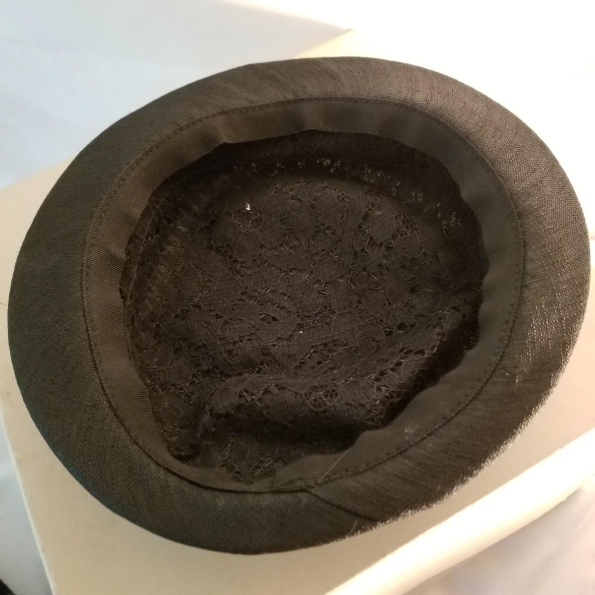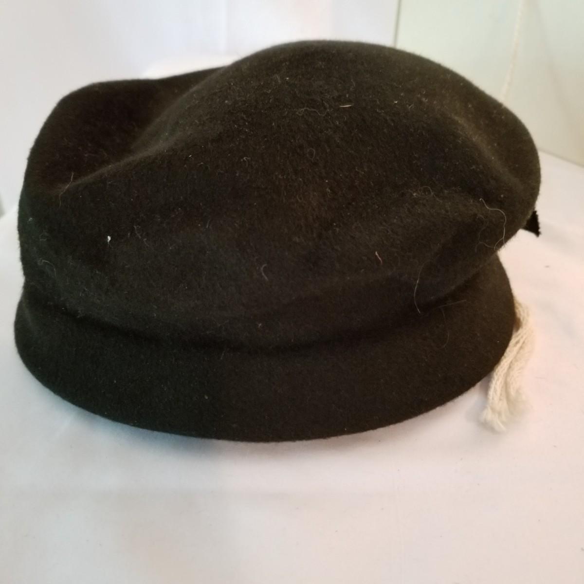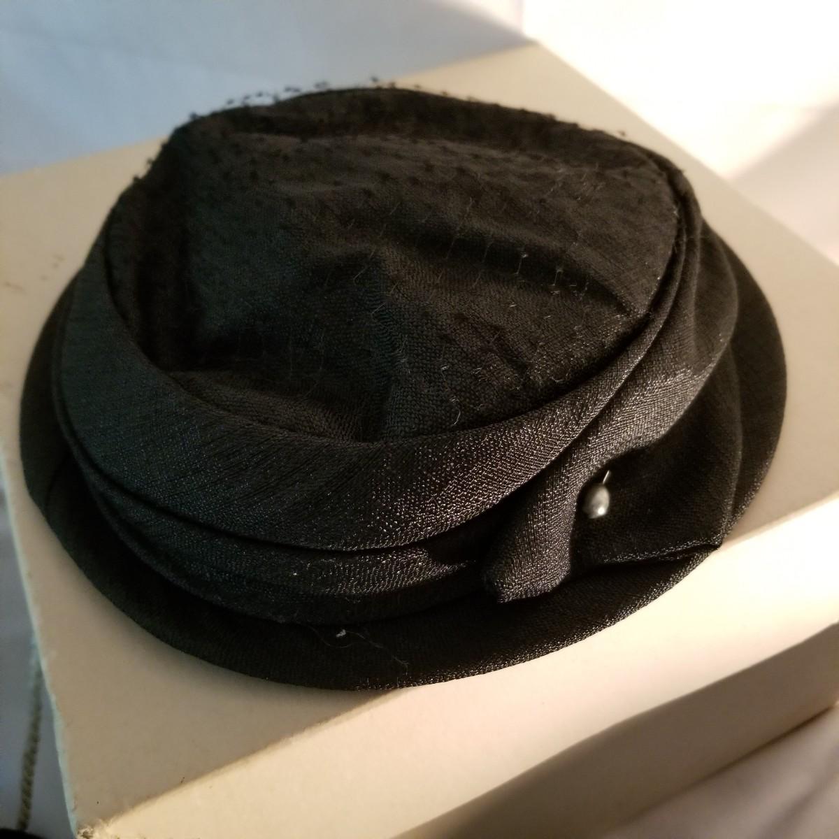 Seven ladies black hats, various styles. One wool, one velour, others assorted materials. With older Belk hatbox. See photos for detail. Shipping available.