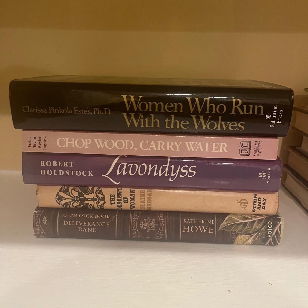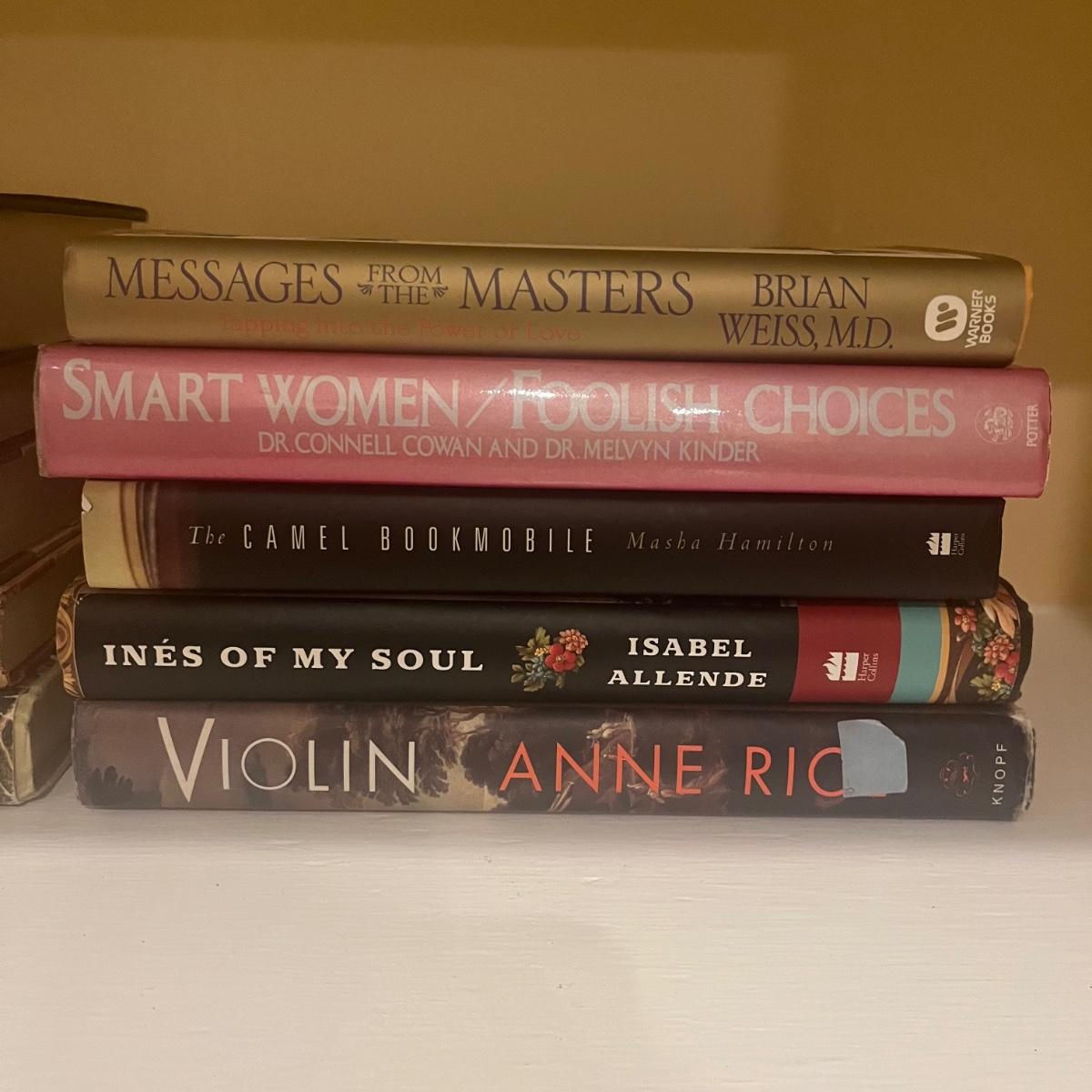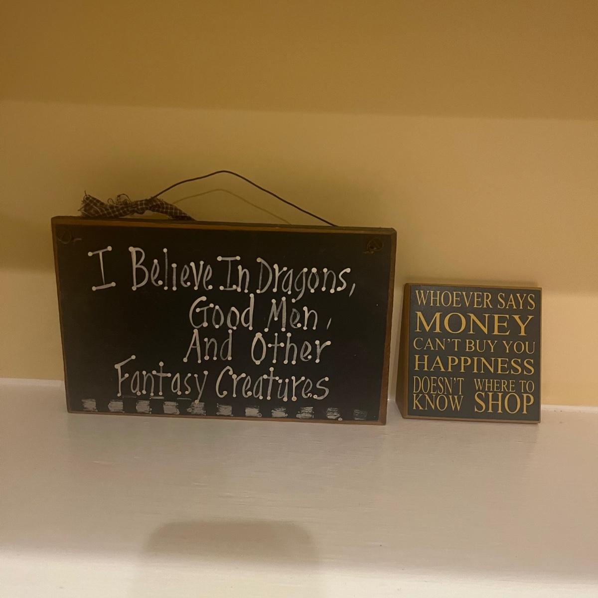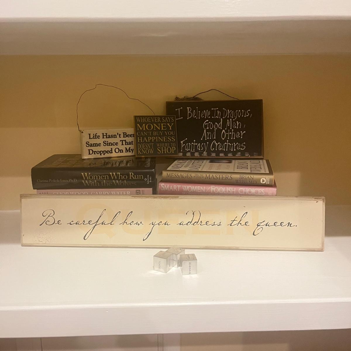 Lot includes books by Anne Rice, Katherine Howe, Brian Weiss and more. Also includes two wooden signs and two MDF signs and a set of three metal die.
