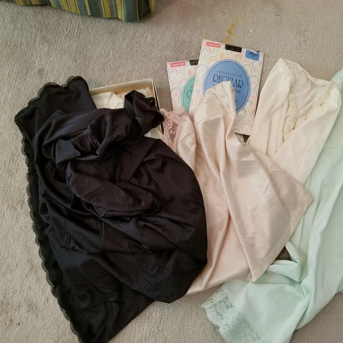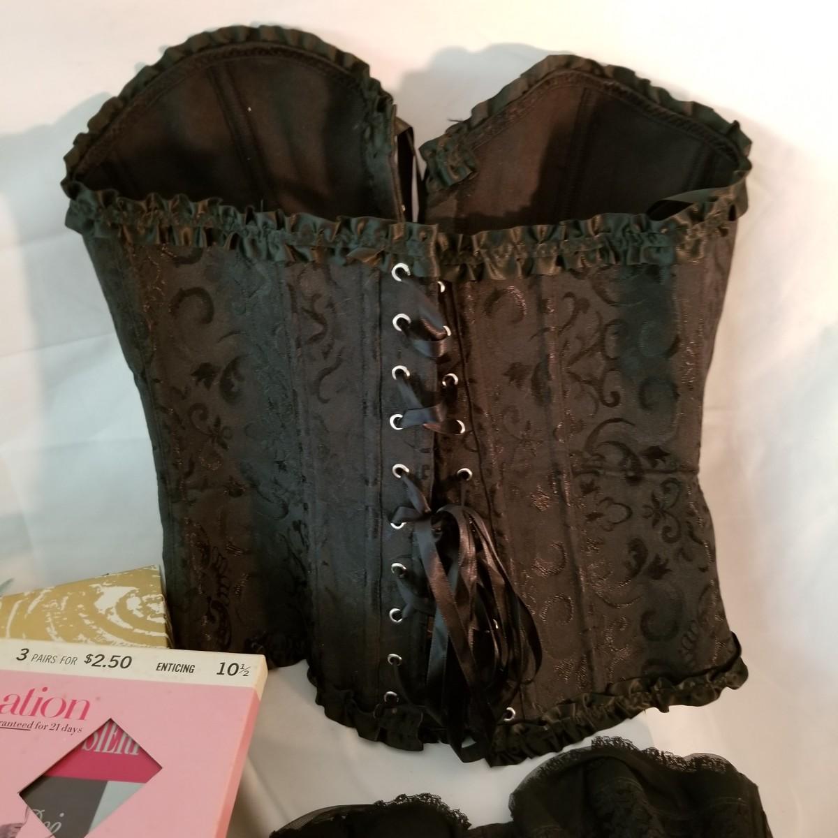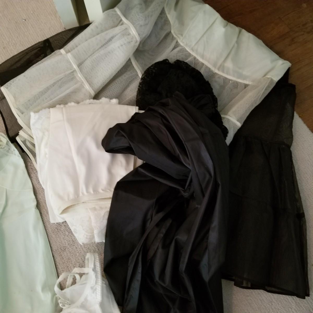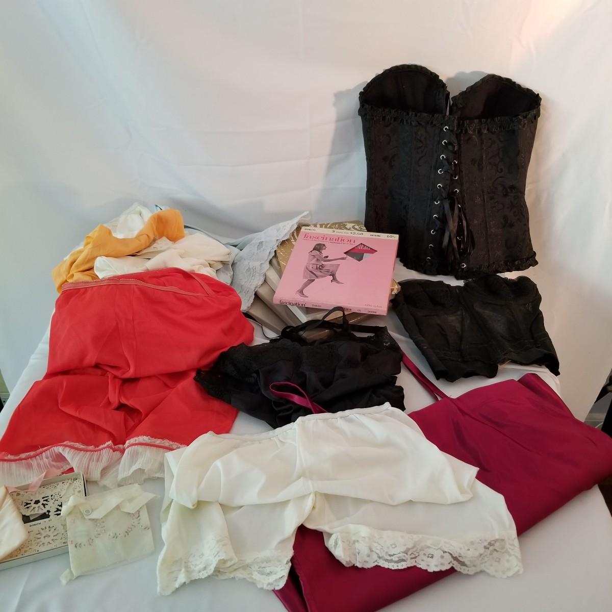A large collection of ladies undergarments sz large. Pants, full and half slips, pantalettes in several colors, hosiery, etc. Two older basque style support garments/corsets. Also several pair of new Hanes hosiery. Over forty-five pieces in all. See photos for detail. Shipping available.