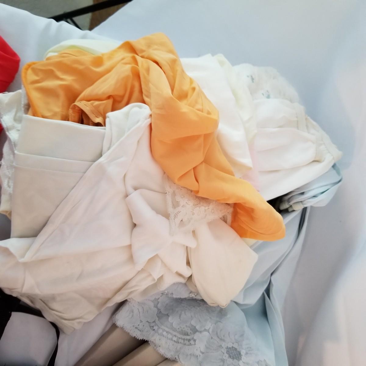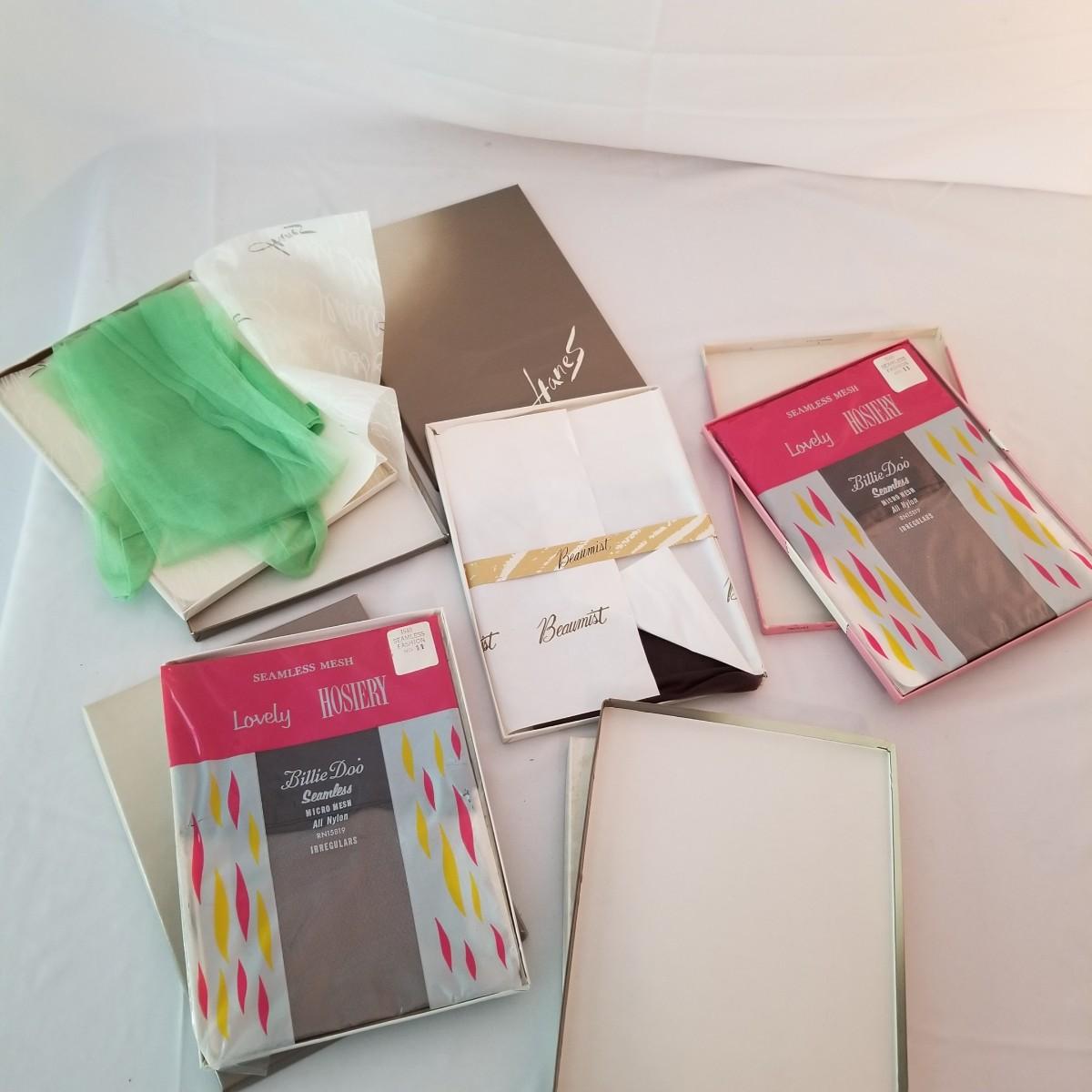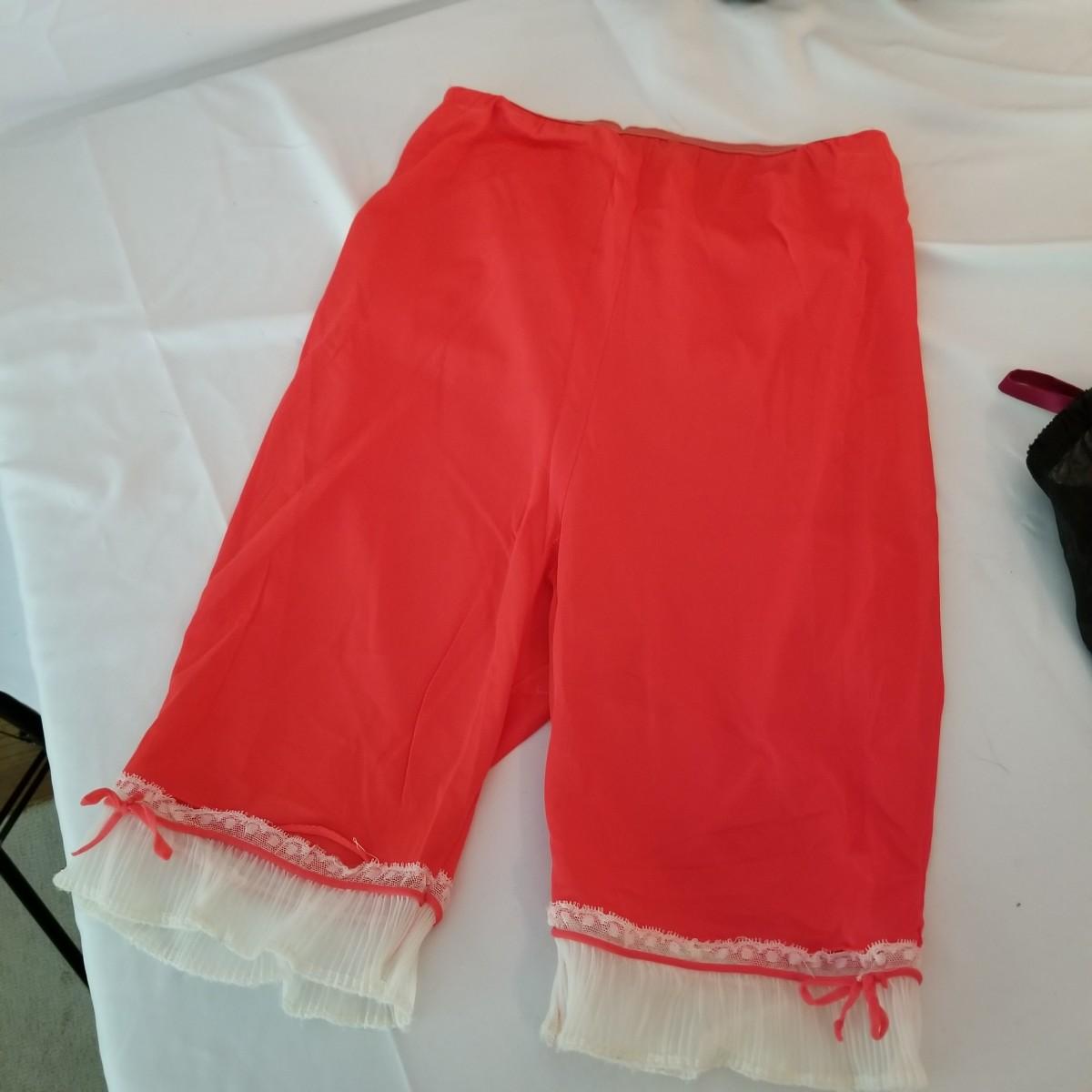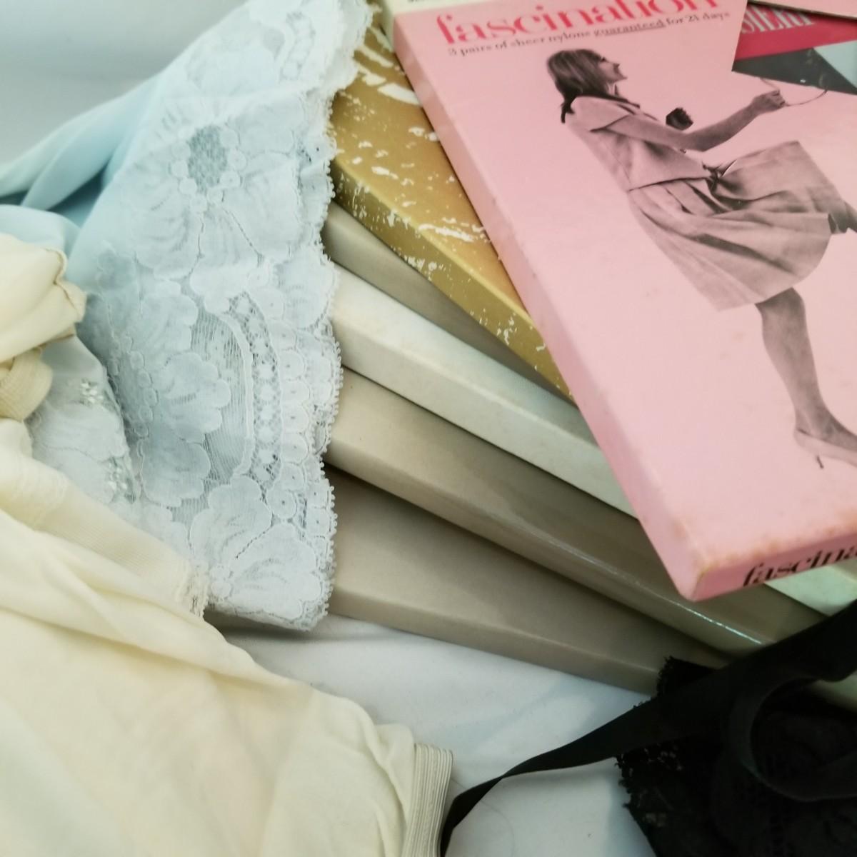 A large collection of ladies undergarments sz large. Pants, full and half slips, pantalettes in several colors, hosiery, etc. Two older basque style support garments/corsets. Also several pair of new Hanes hosiery. Over forty-five pieces in all. See photos for detail. Shipping available.