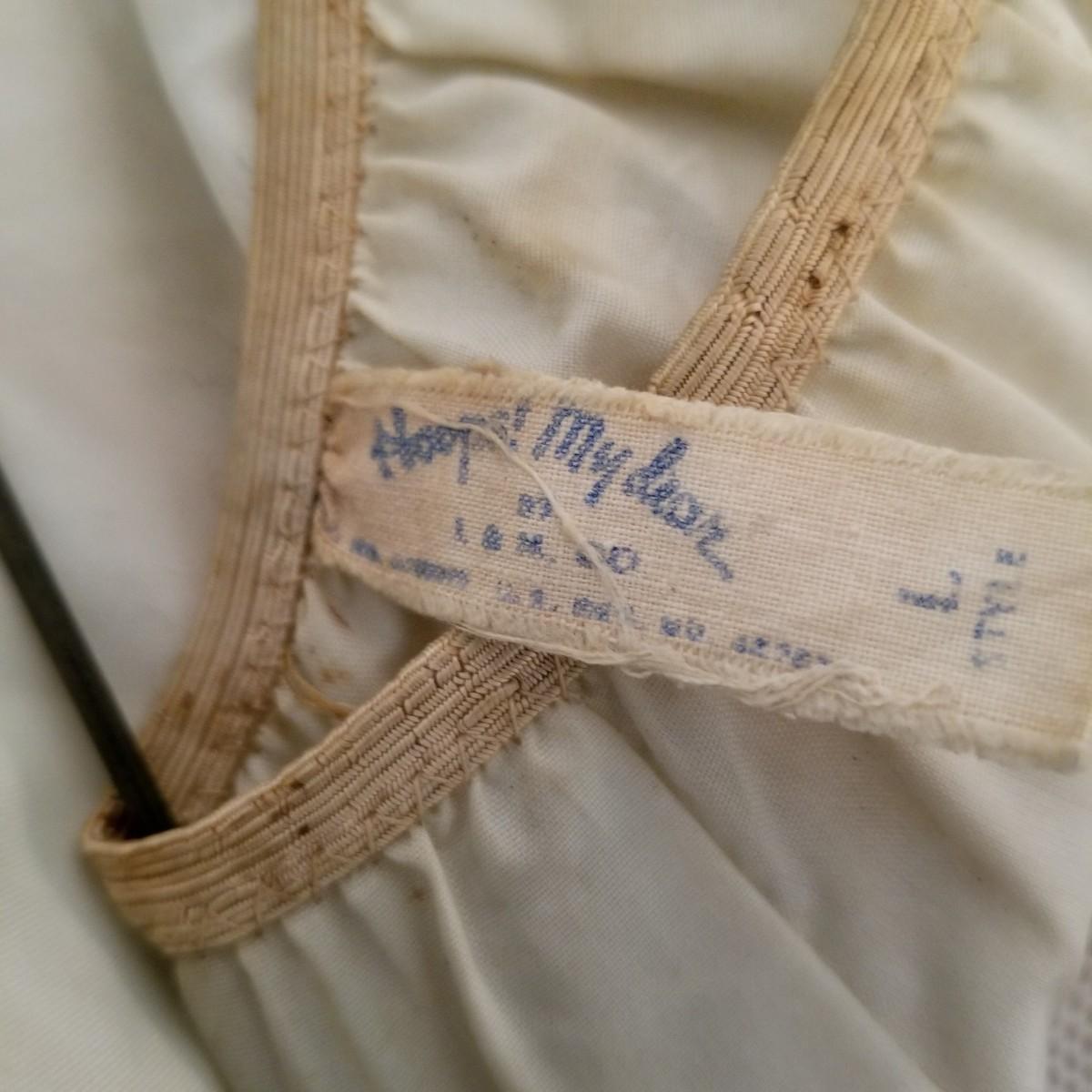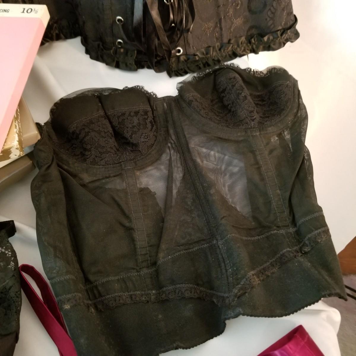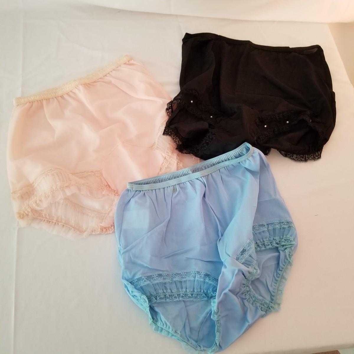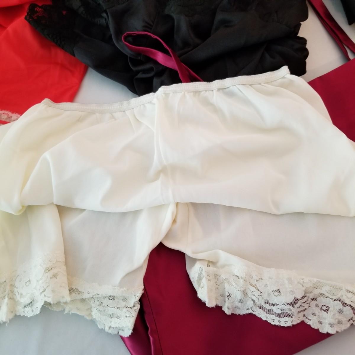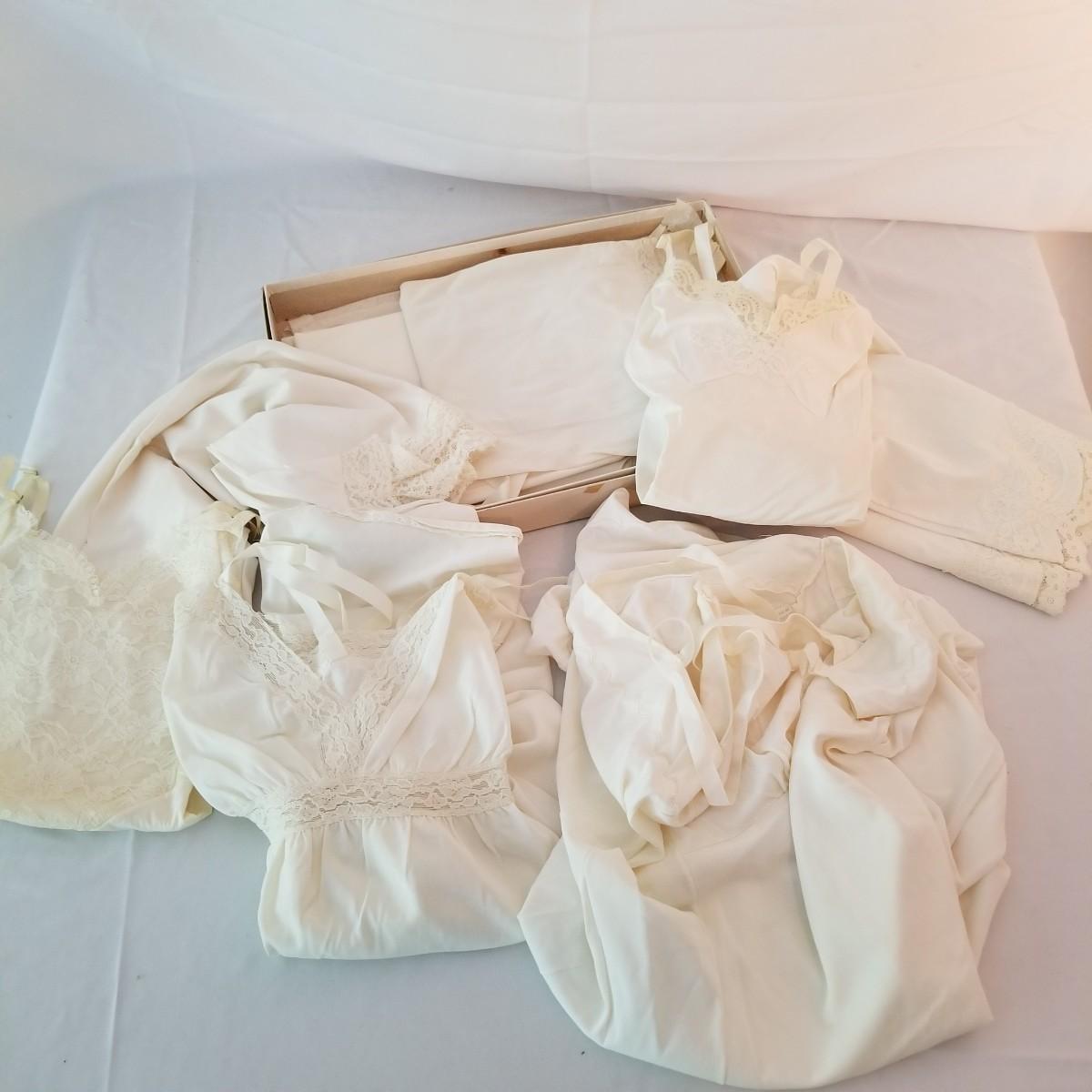 A large collection of ladies undergarments sz large. Pants, full and half slips, pantalettes in several colors, hosiery, etc. Two older basque style support garments/corsets. Also several pair of new Hanes hosiery. Over forty-five pieces in all. See photos for detail. Shipping available.