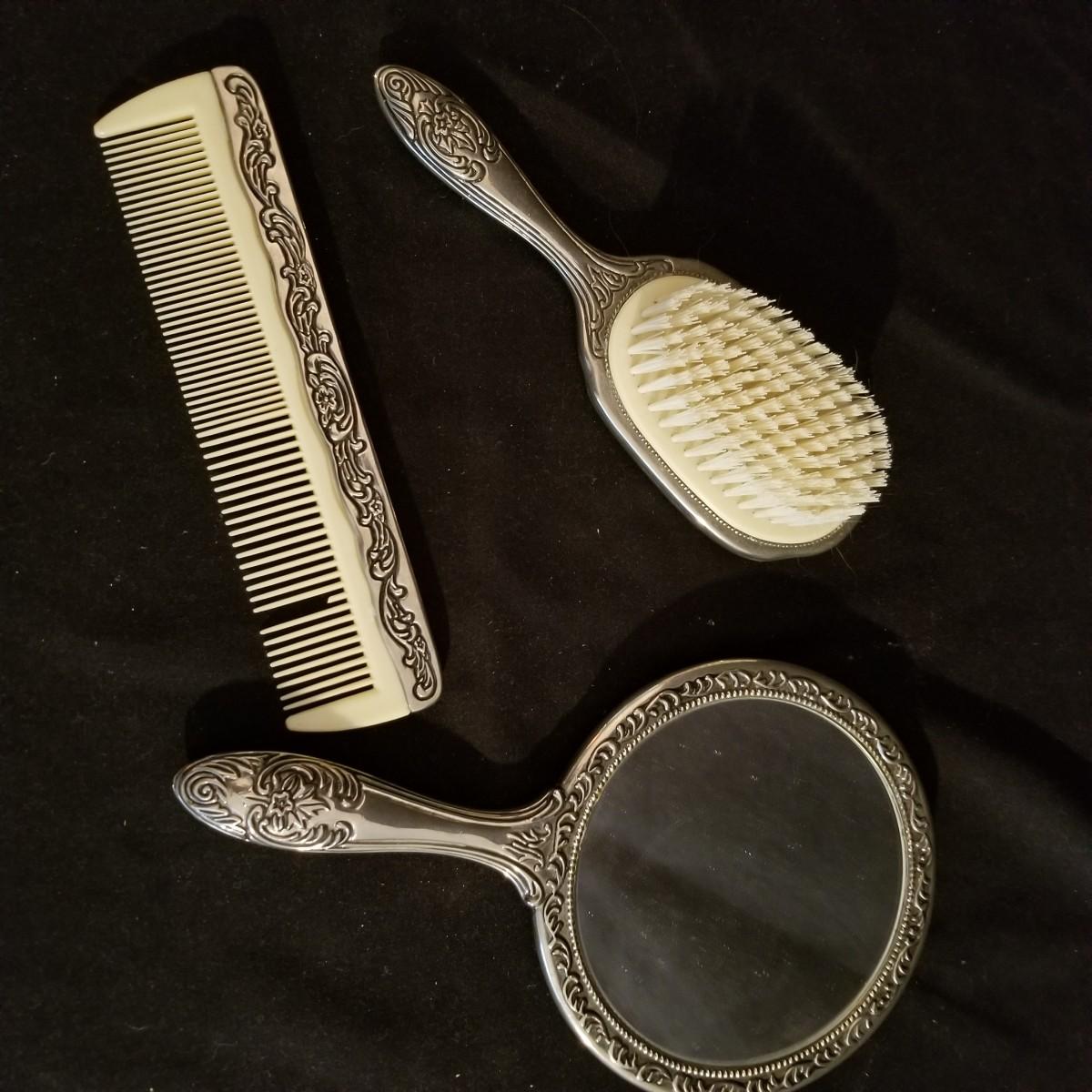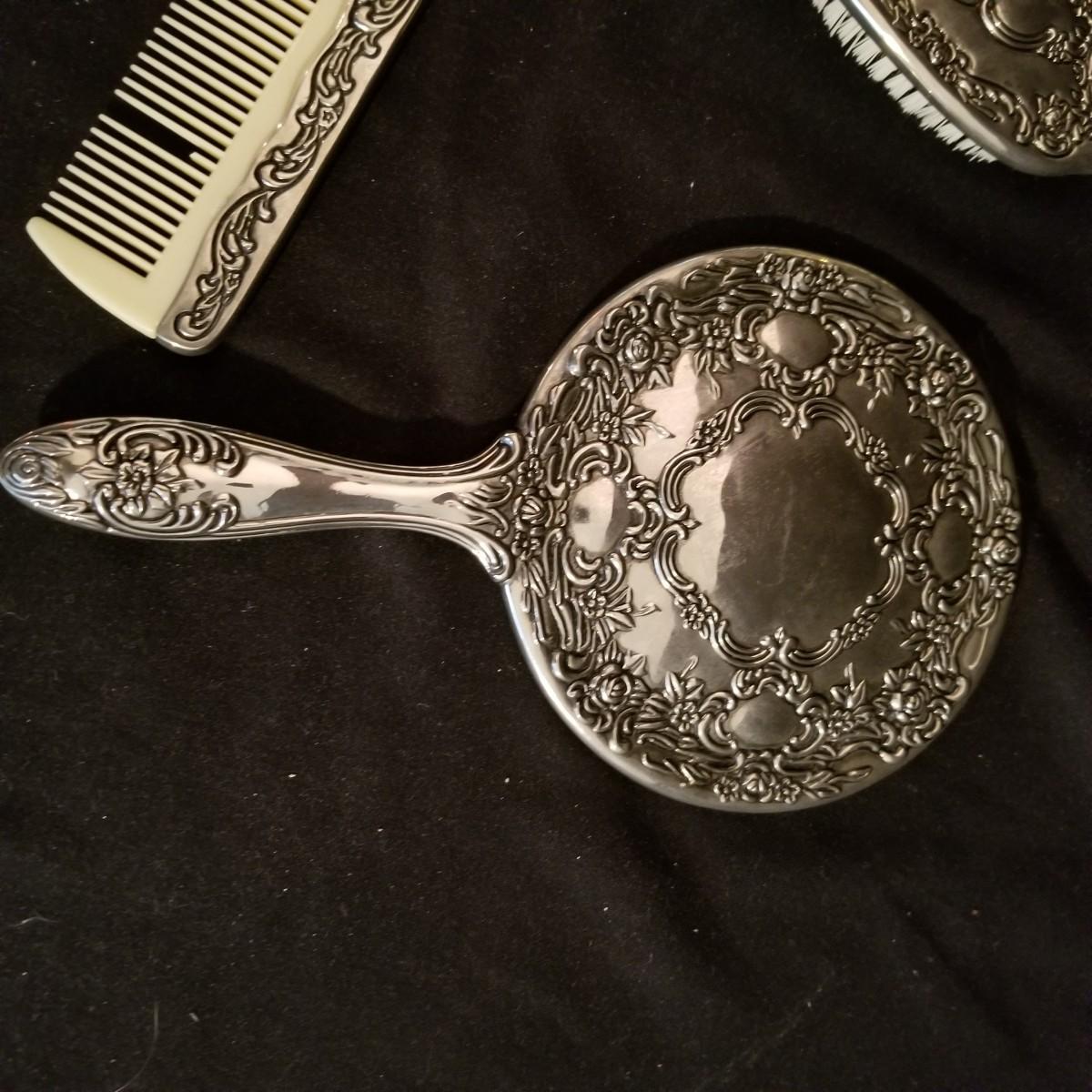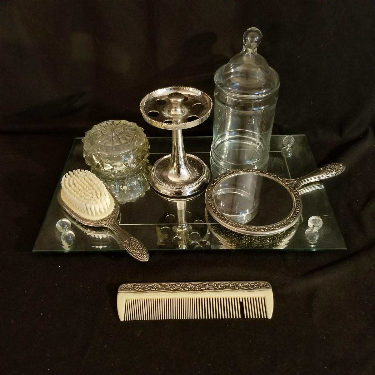 A desktop set of ladies care items. 16" x 10" mirror tray, 8" glass jar with top, 5" silver toothbrush holder, small 4"d glass bowl. Also a three piece set with silver-colored metal hand mirror, hair brush, and comb. Hand mirror is 9" long. See photos for detail. Shipping available.