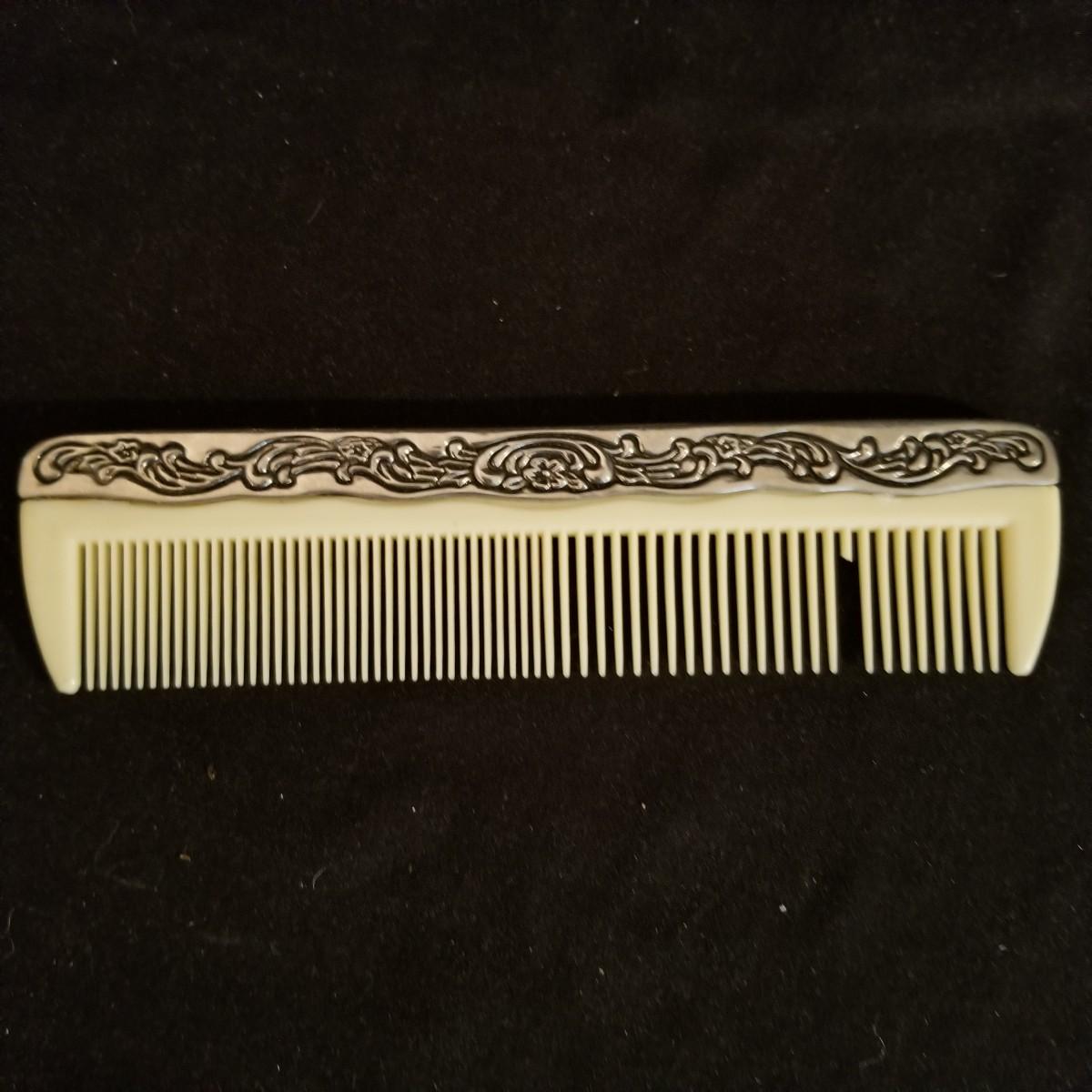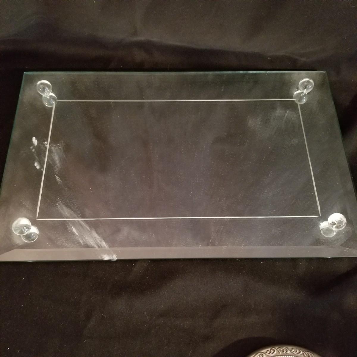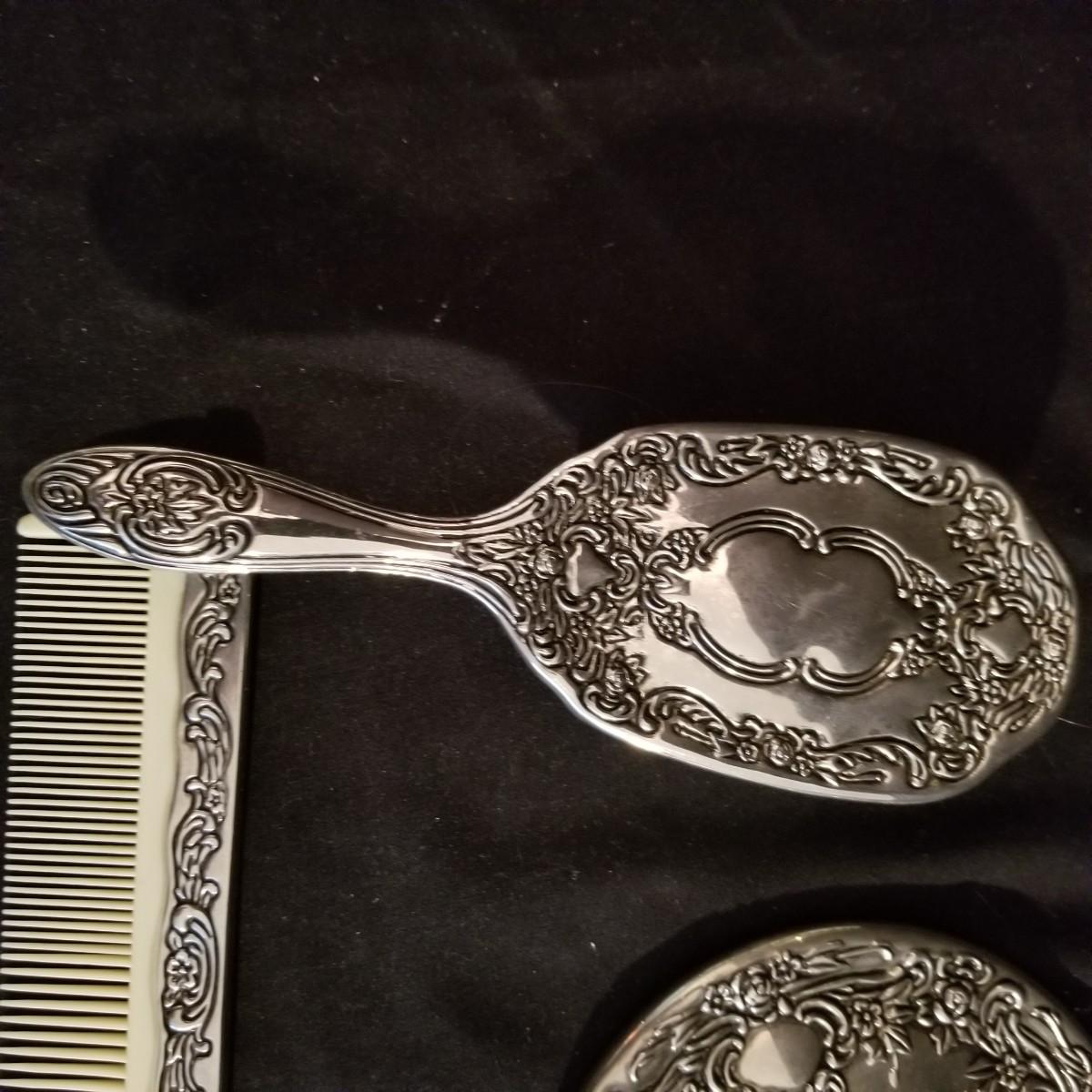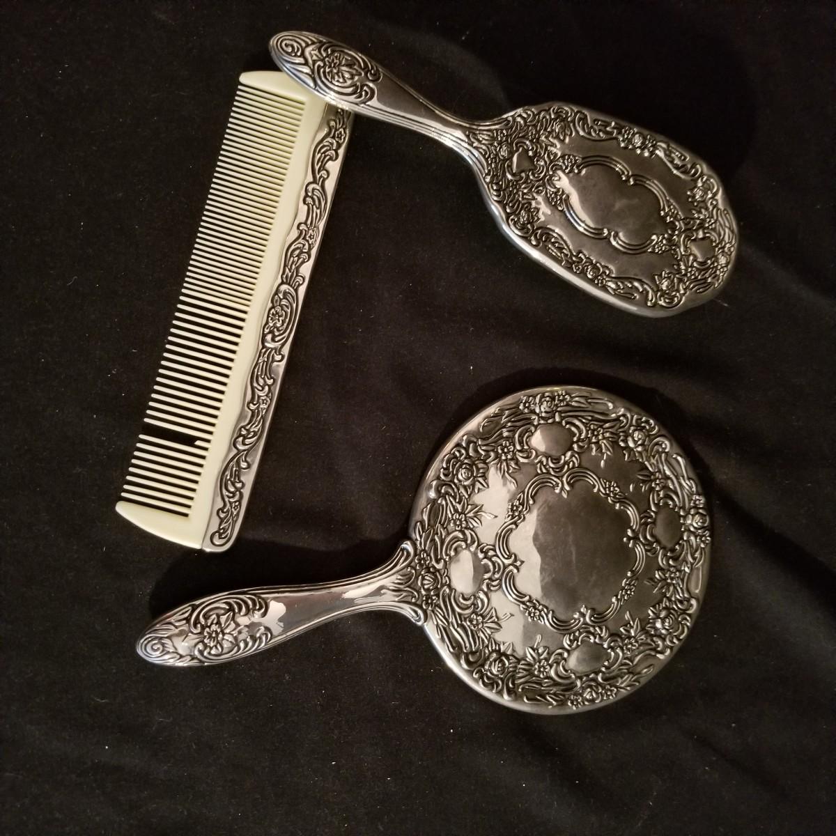 A desktop set of ladies care items. 16" x 10" mirror tray, 8" glass jar with top, 5" silver toothbrush holder, small 4"d glass bowl. Also a three piece set with silver-colored metal hand mirror, hair brush, and comb. Hand mirror is 9" long. See photos for detail. Shipping available.