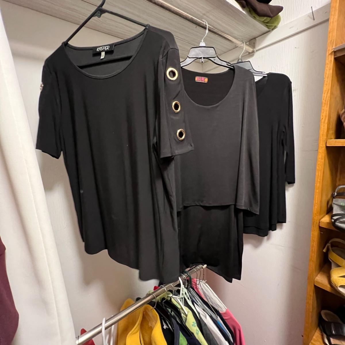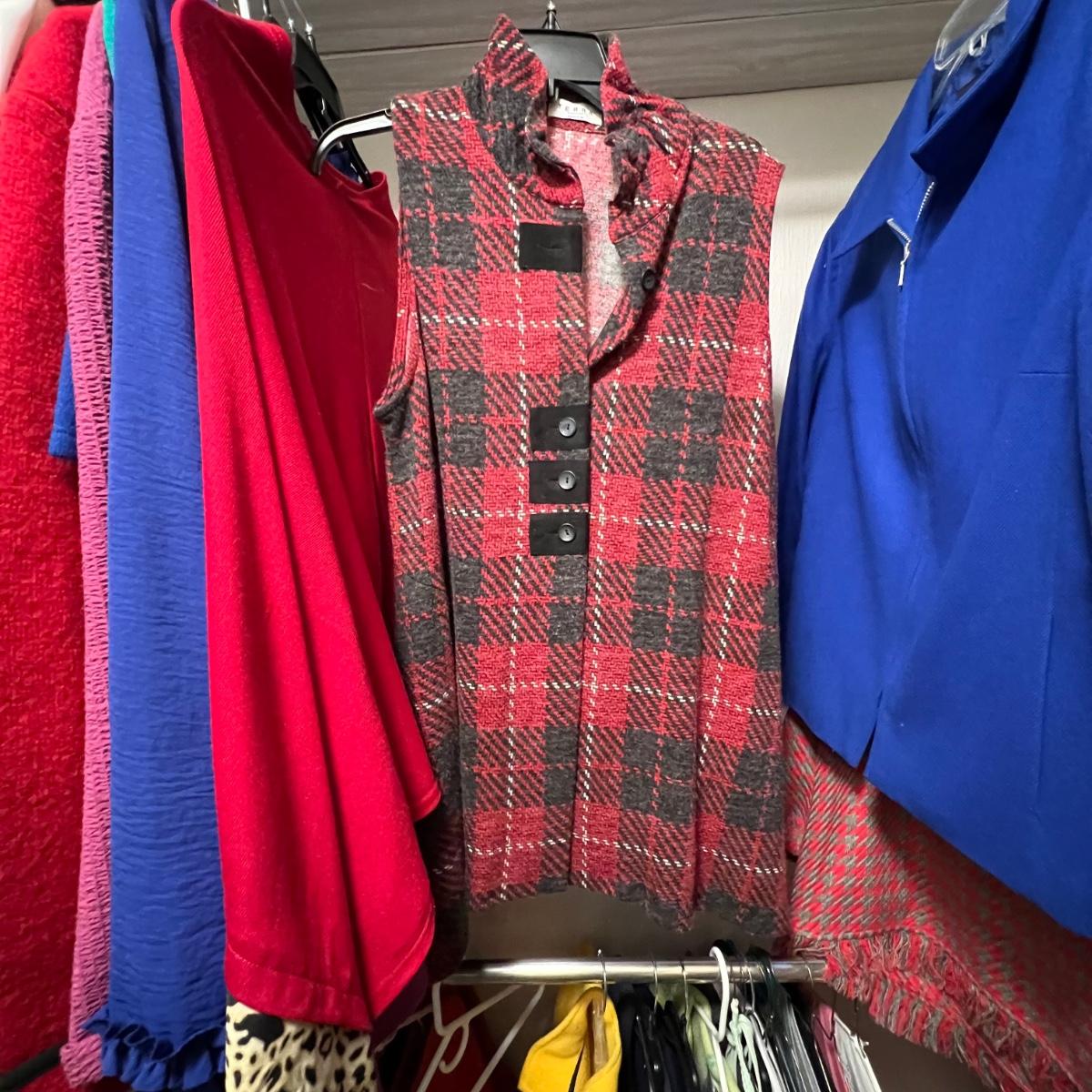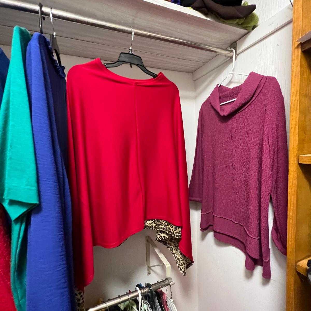 A great assortment of 20+ skirts, tops and jackets that are mostly size medium with some size large. The blazers are all size 10 or 12 and are all wool with the exception of the Cynthia Max, see image. The red Teddi fleece jacket is size small but appears to run on the larger side. The black Isle top is a built in two piece.