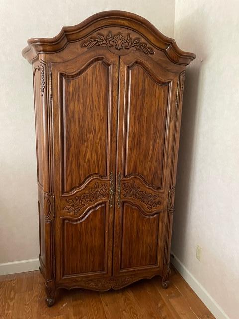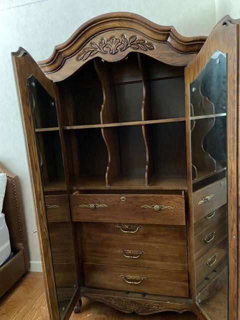 Ladies Clothing Armoire by Unique Furniture Makers. Unsual interior space configuration has 6 clothing cubby-holes, 3 deep drawers, and even an electrical plug in the bottom right cubby!