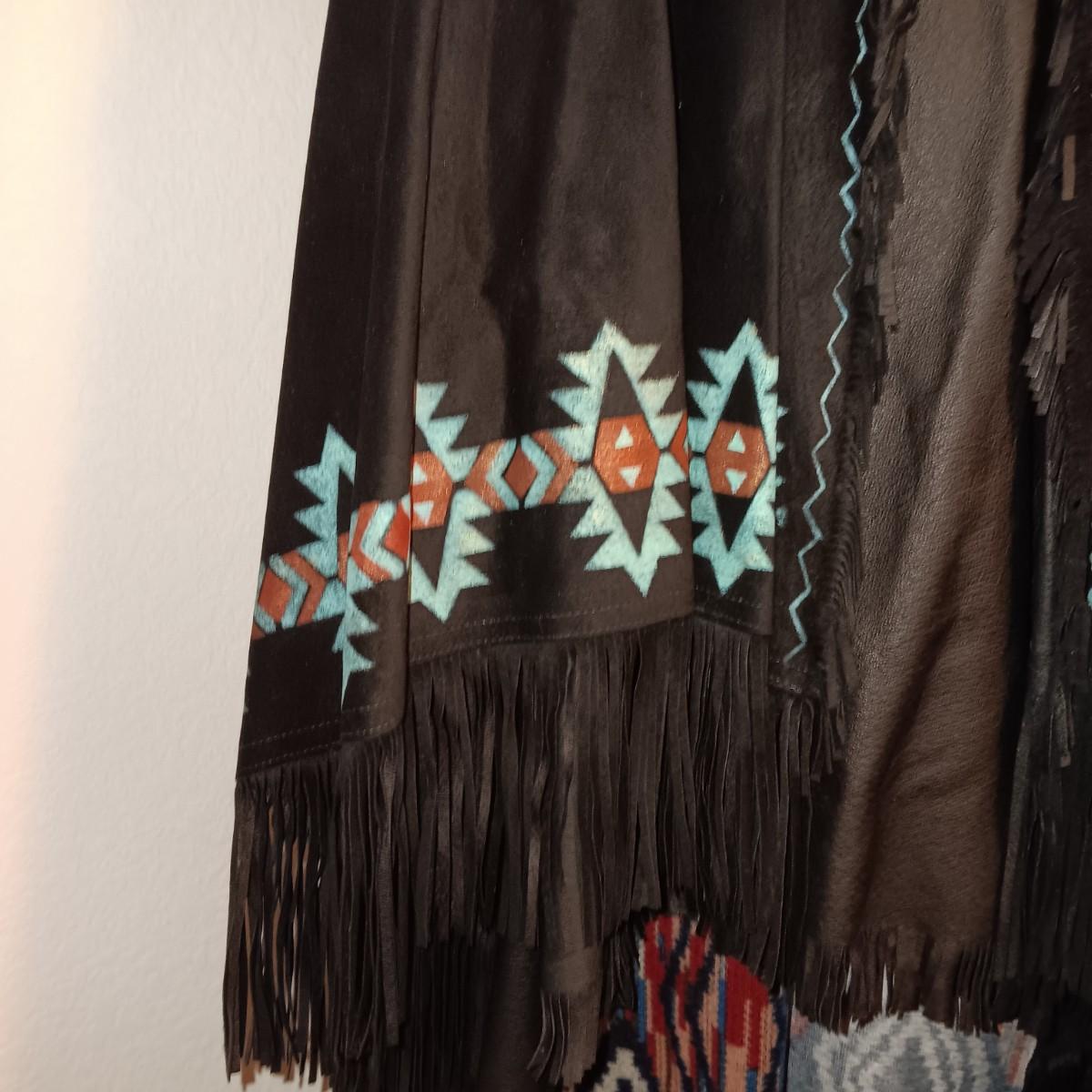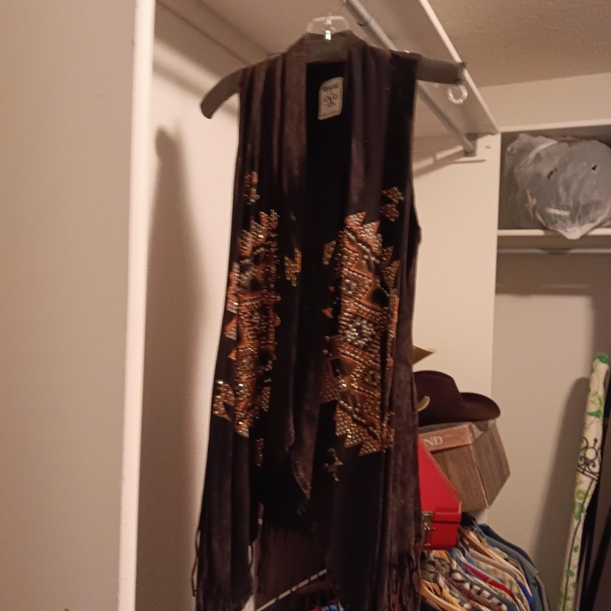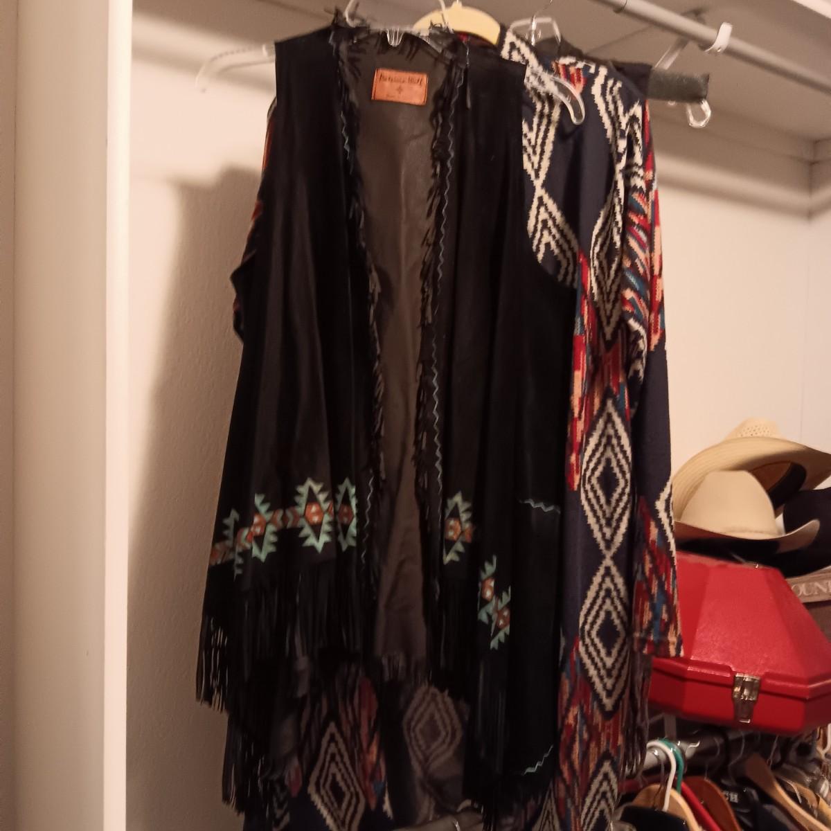 LADIES COWGIRL JACKET (M) PATRICIA WOLF LONG LEATHER VEST AND LONG SWEATER (L)