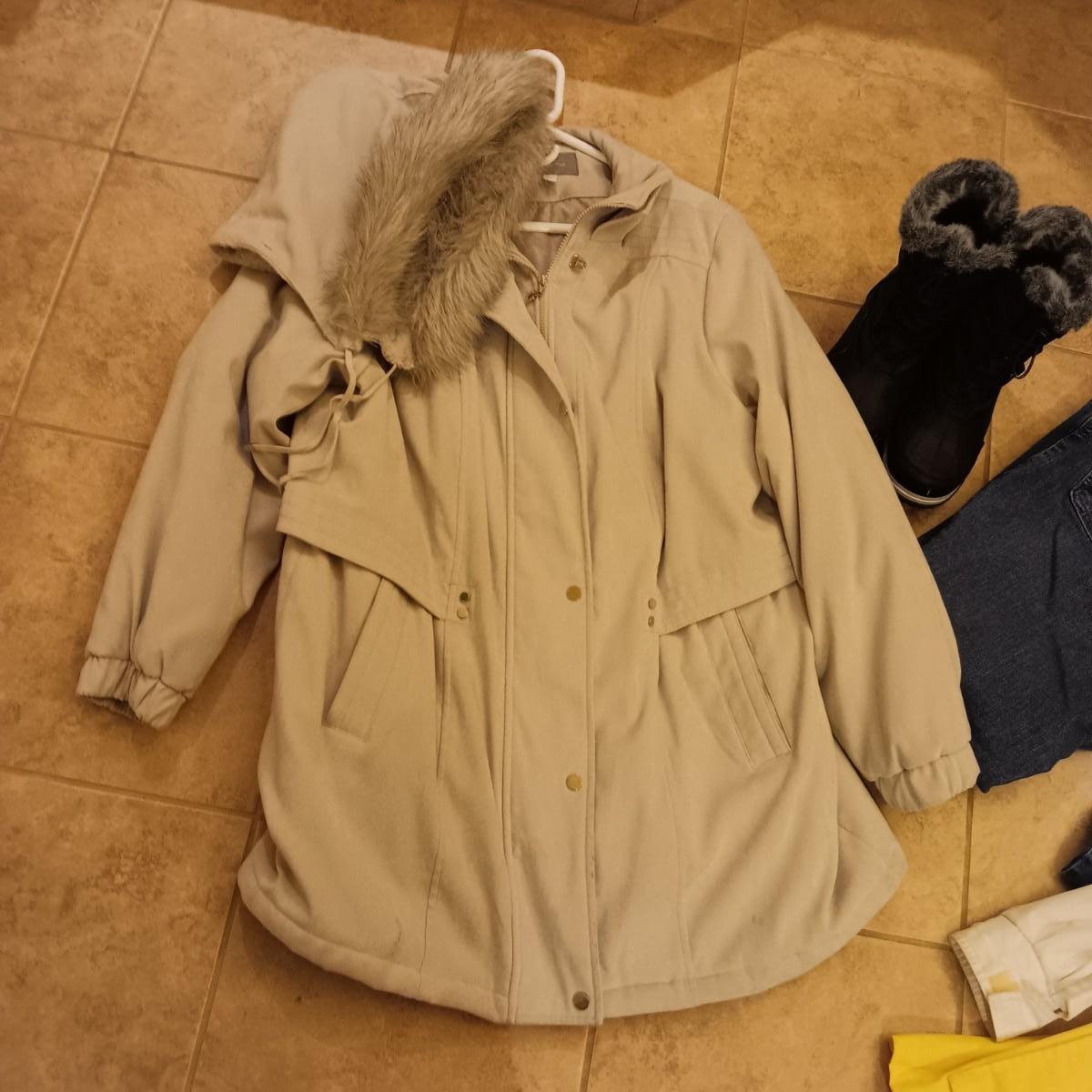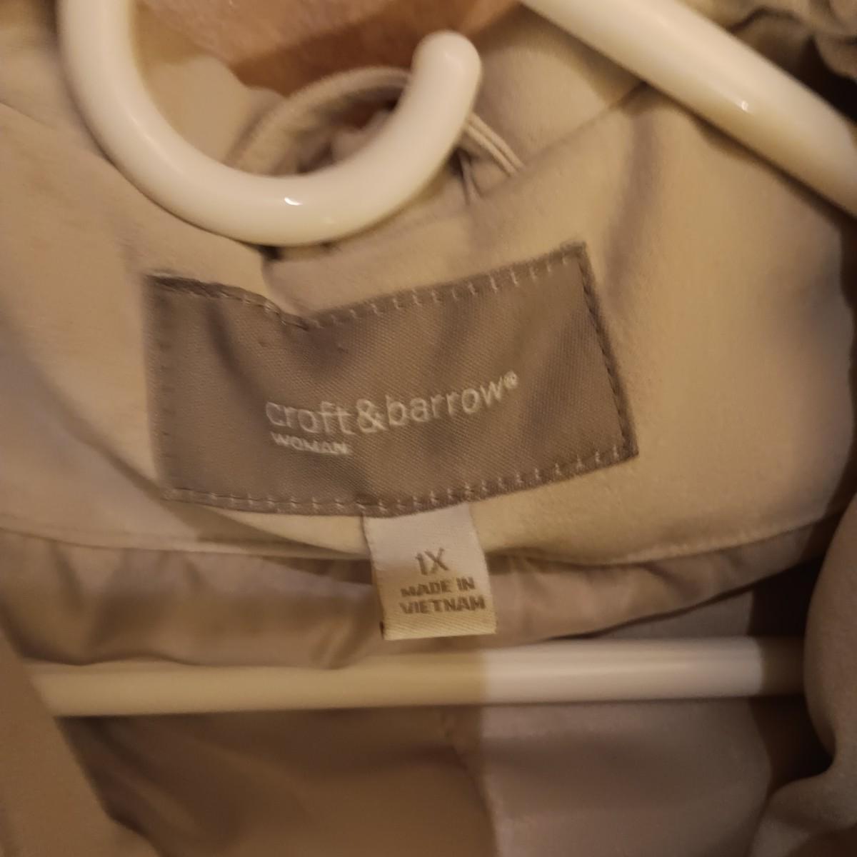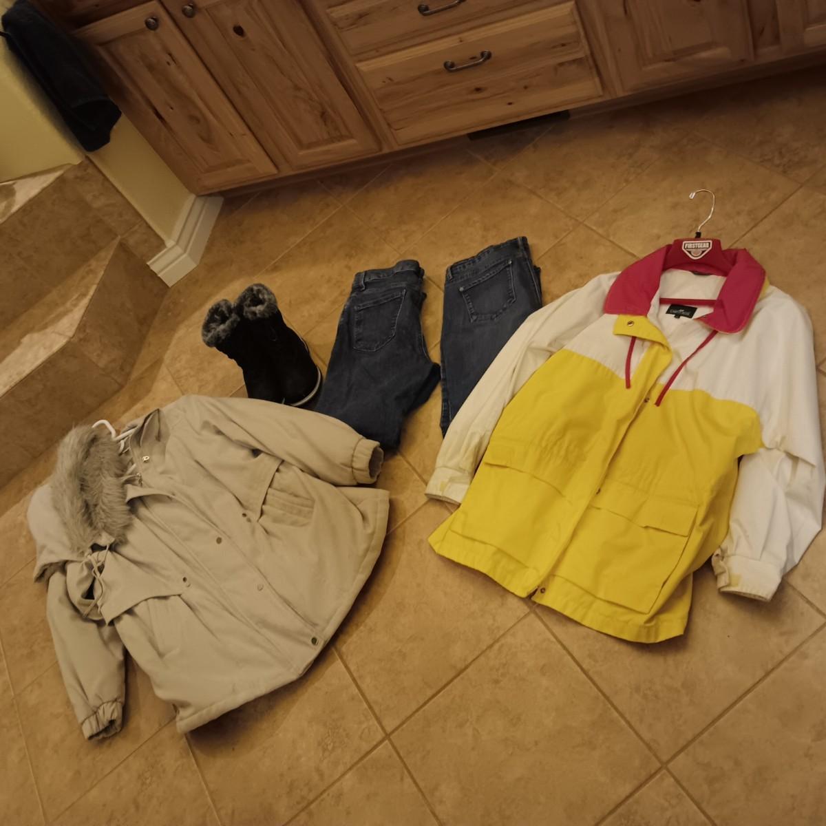LADIES CROFT & BARROW WINTER COAT (1X), CABIN CREEK RAIN COAT (L) WINTER BOOTS (9) AND JEANS (12 & 14)
