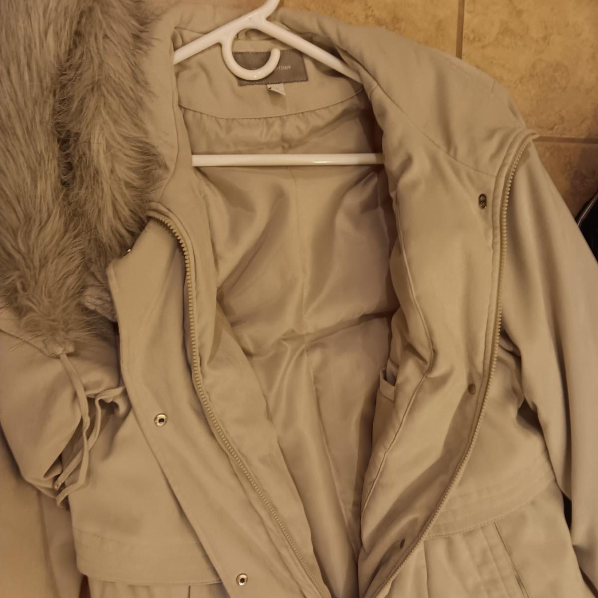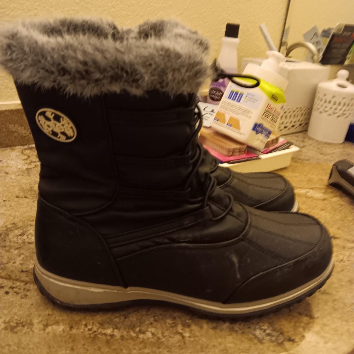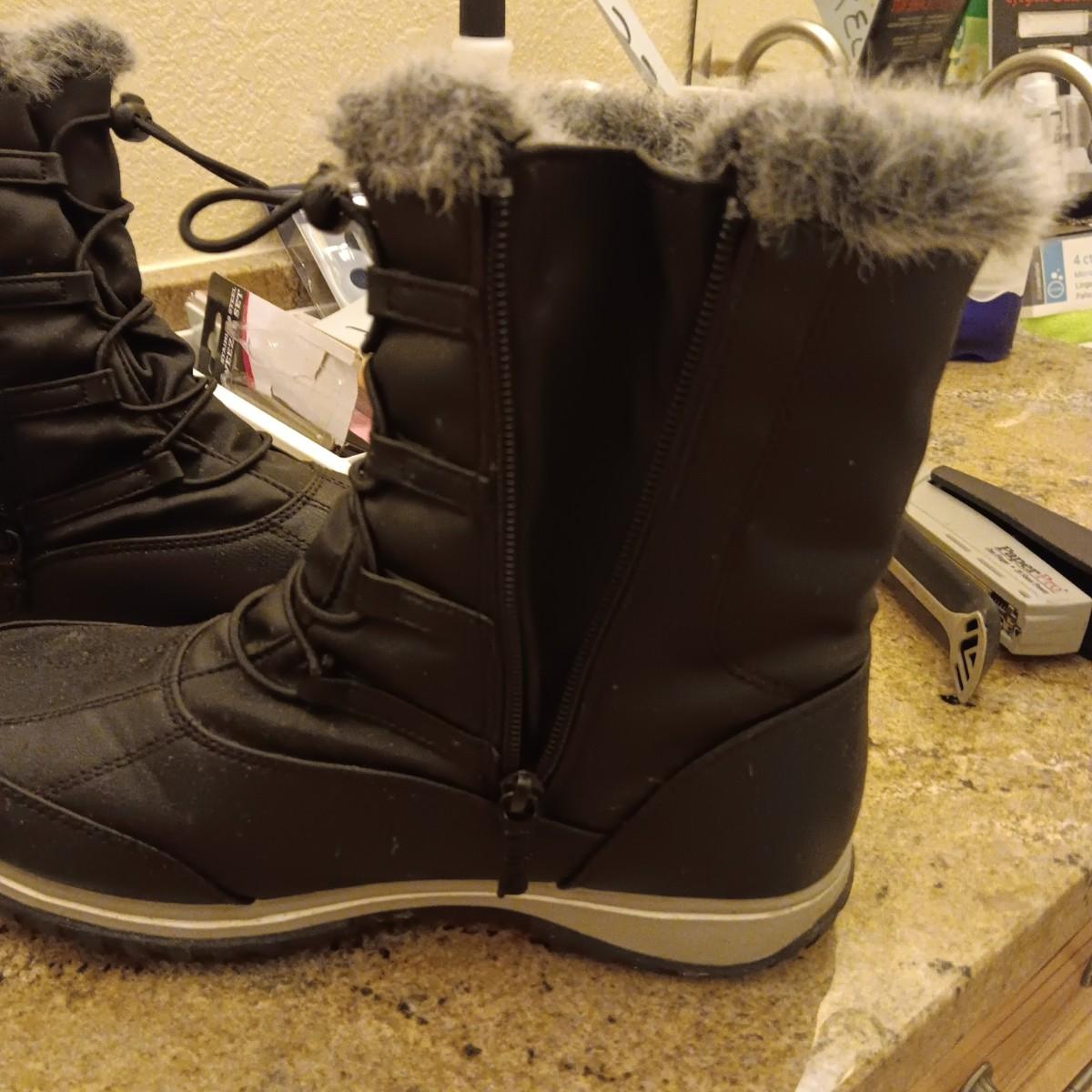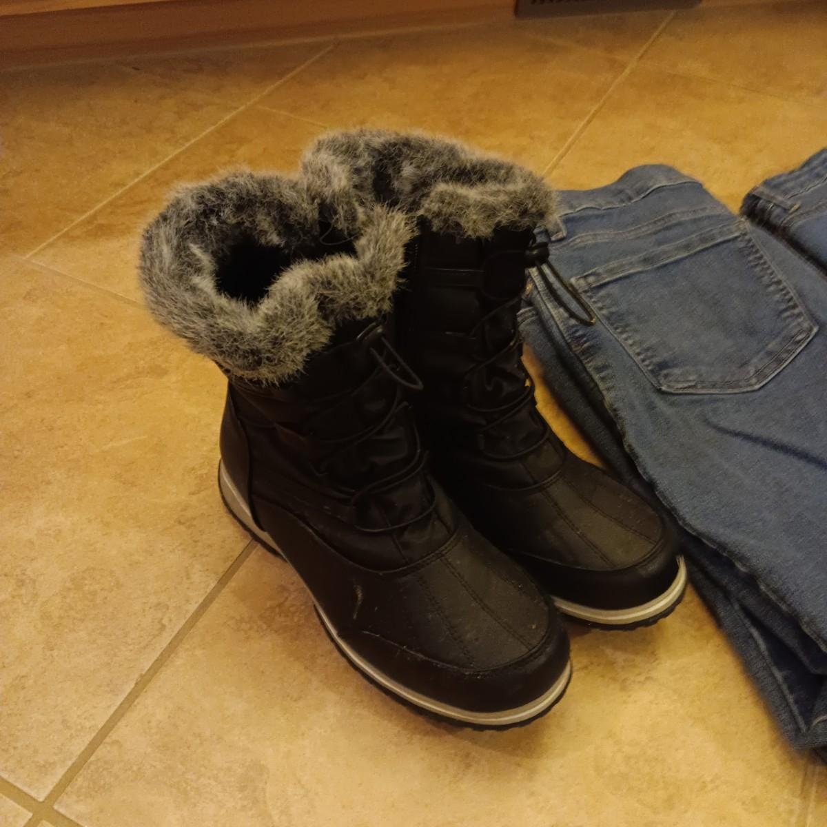 LADIES CROFT & BARROW WINTER COAT (1X), CABIN CREEK RAIN COAT (L) WINTER BOOTS (9) AND JEANS (12 & 14)