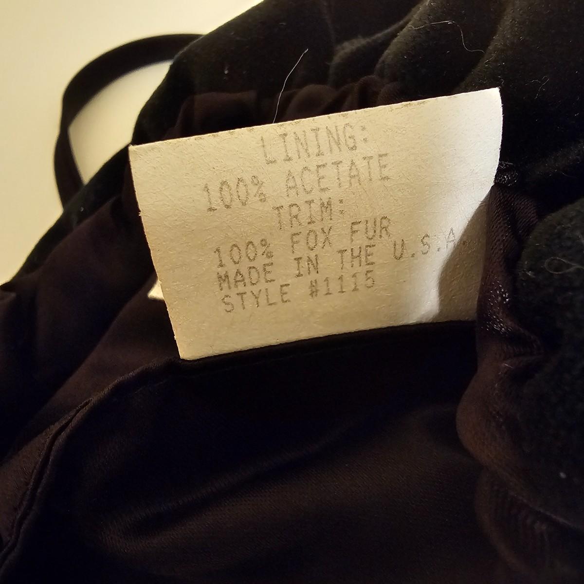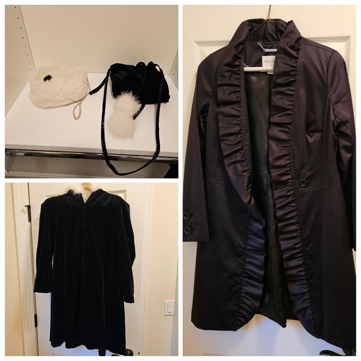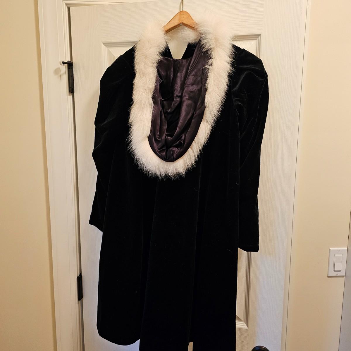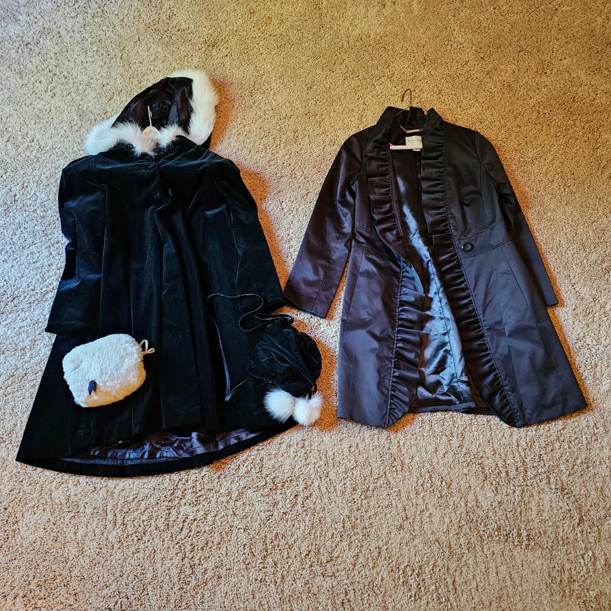 A pair of black ladies coats for evening wear or other. Item with ruffled collar and lapels is by WhiteHouse/Black Market, is a size 6 and is 100% polyester. Single button front. Other item is for colder weather by Helena, is a size 10 and comes with a matching hand muffin. Coat has a full hood, is cotton velvet outside and acetate lining. White trim is fox fur. Two button at top near collar. Also included is another hand muff, possibly rabbit with a strap and accent chevron of front. Inside has some discoloration and staining. See photos for details. Shipping available.