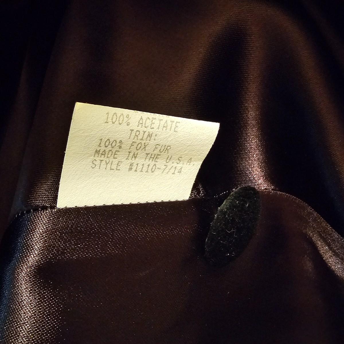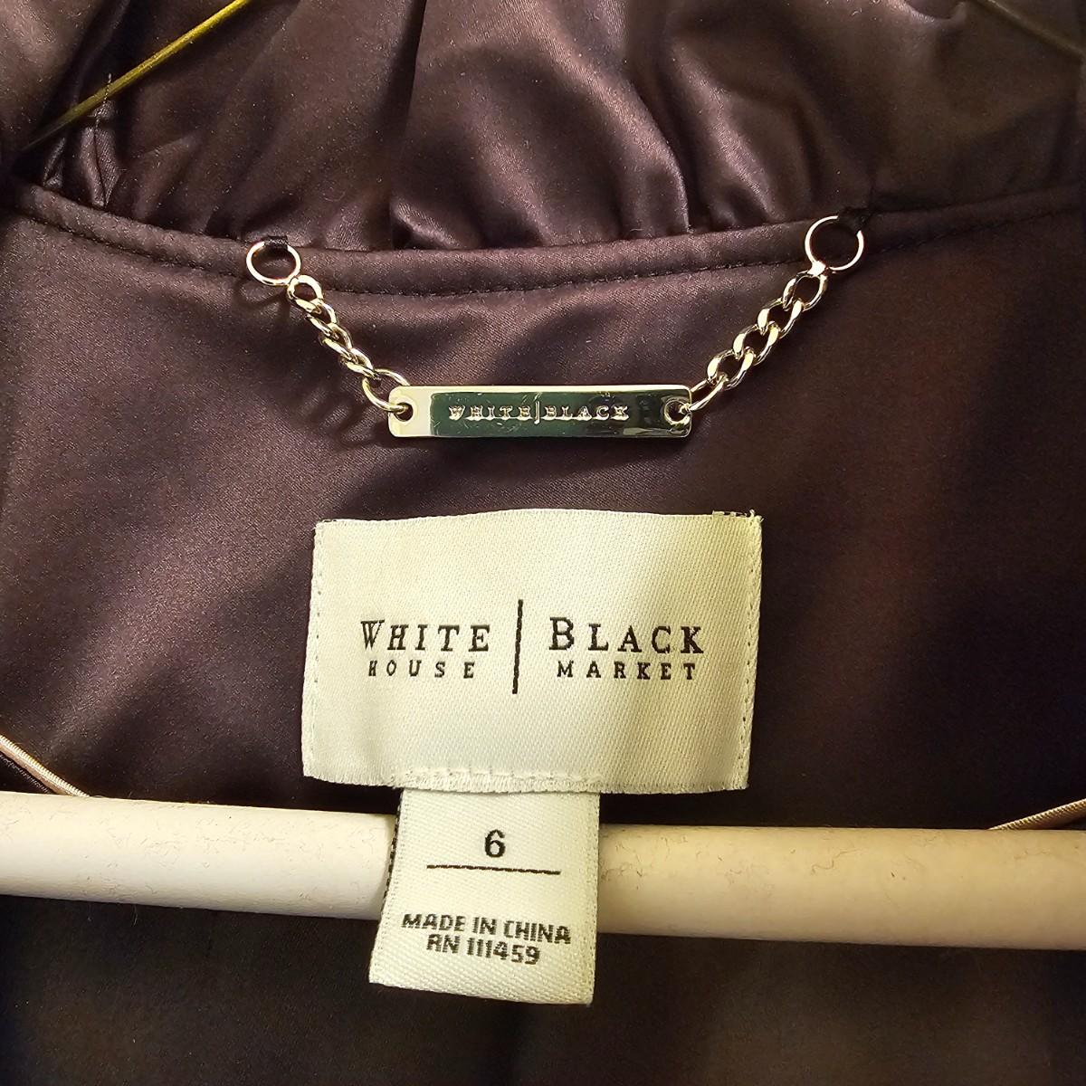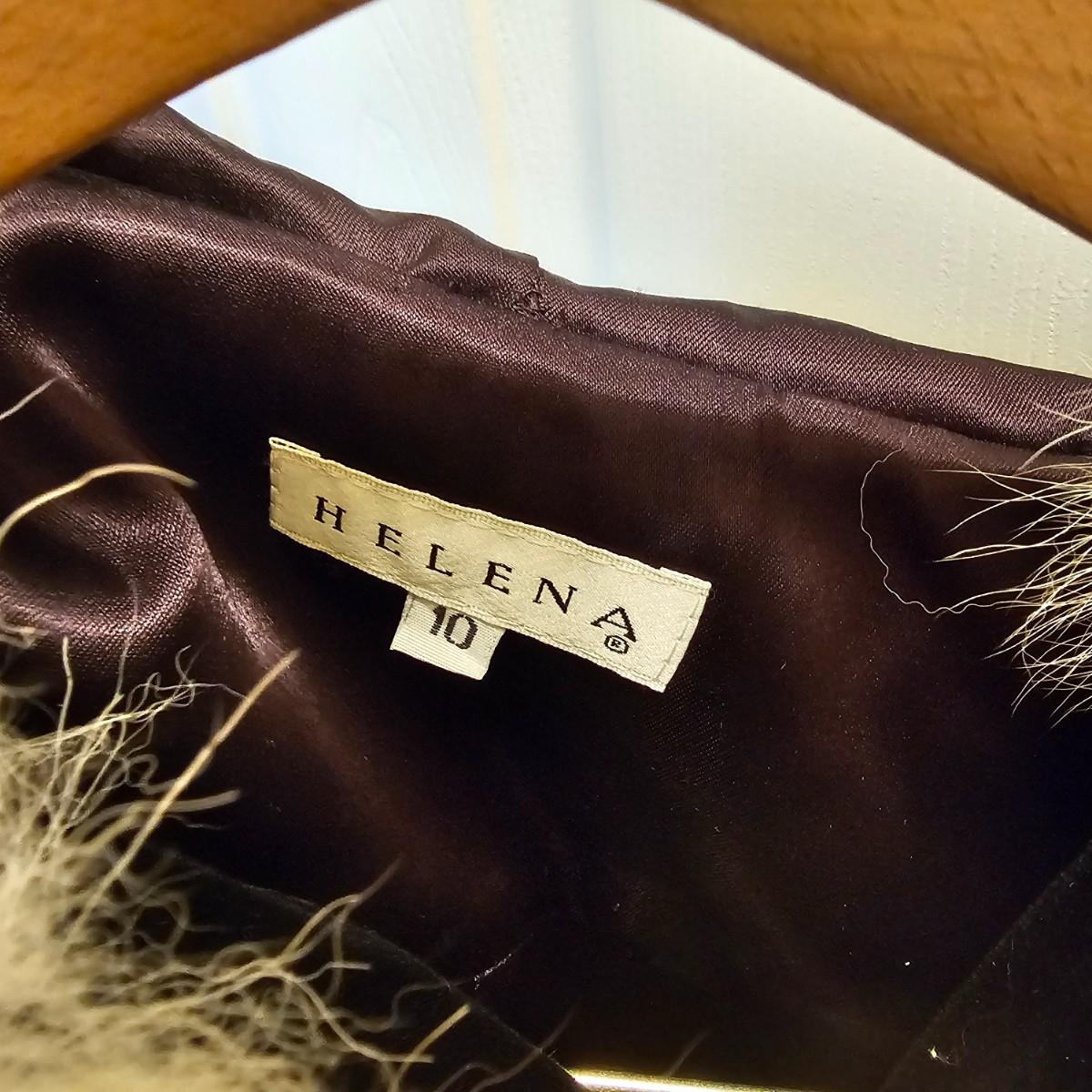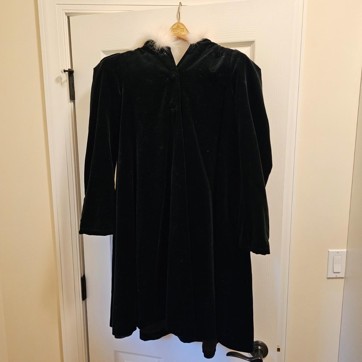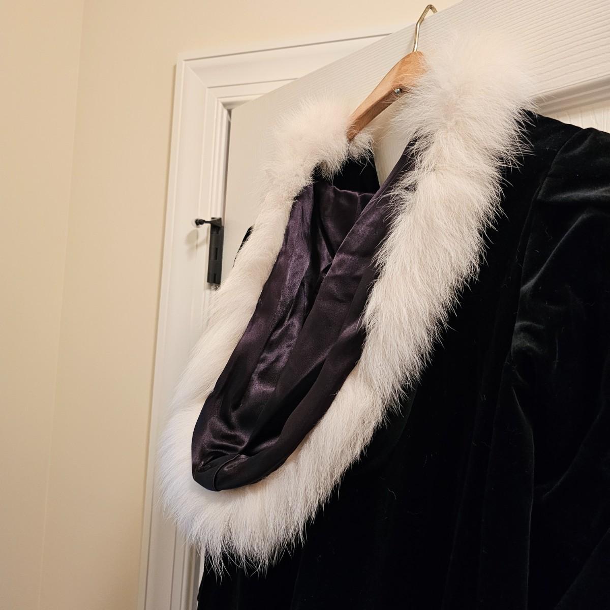 A pair of black ladies coats for evening wear or other. Item with ruffled collar and lapels is by WhiteHouse/Black Market, is a size 6 and is 100% polyester. Single button front. Other item is for colder weather by Helena, is a size 10 and comes with a matching hand muffin. Coat has a full hood, is cotton velvet outside and acetate lining. White trim is fox fur. Two button at top near collar. Also included is another hand muff, possibly rabbit with a strap and accent chevron of front. Inside has some discoloration and staining. See photos for details. Shipping available.