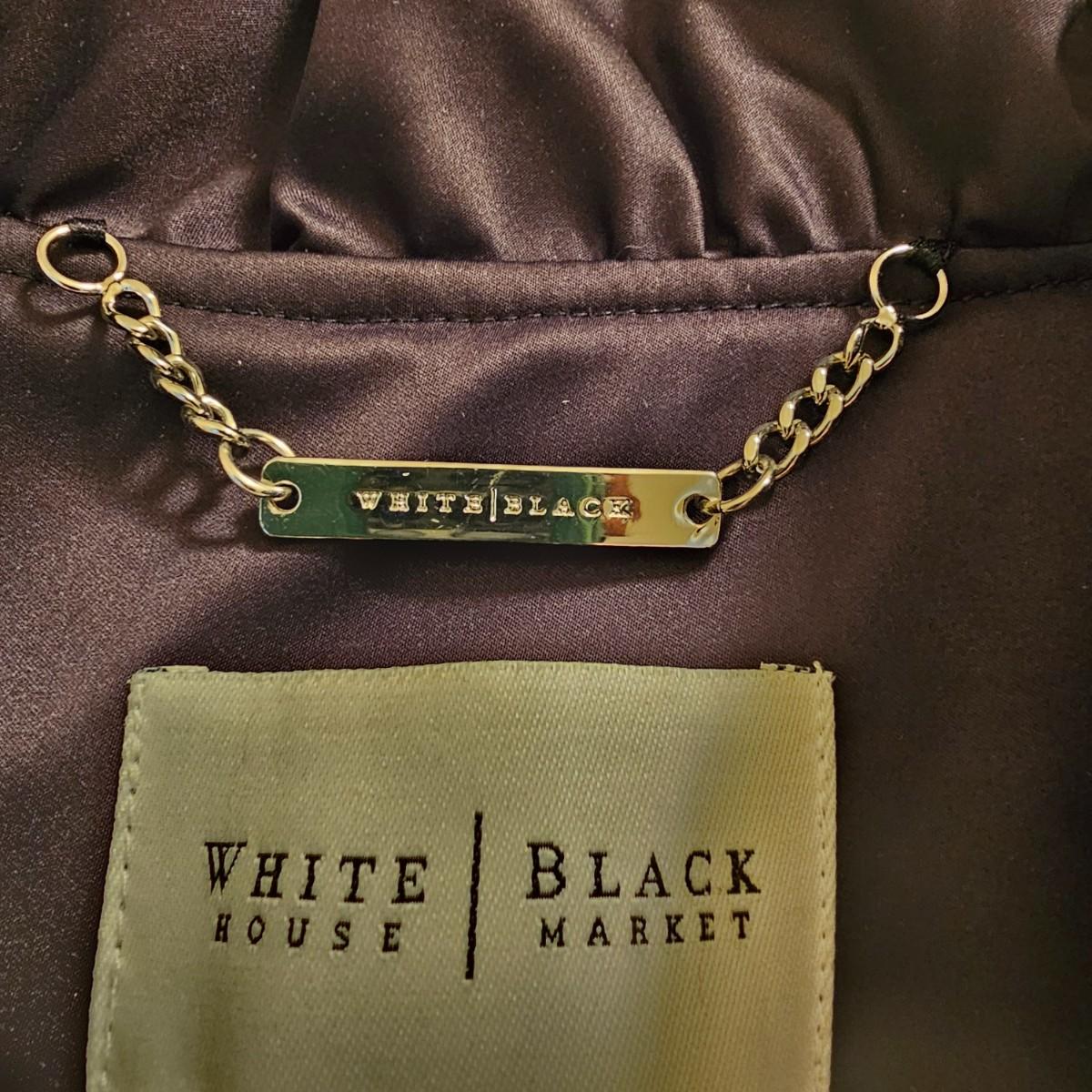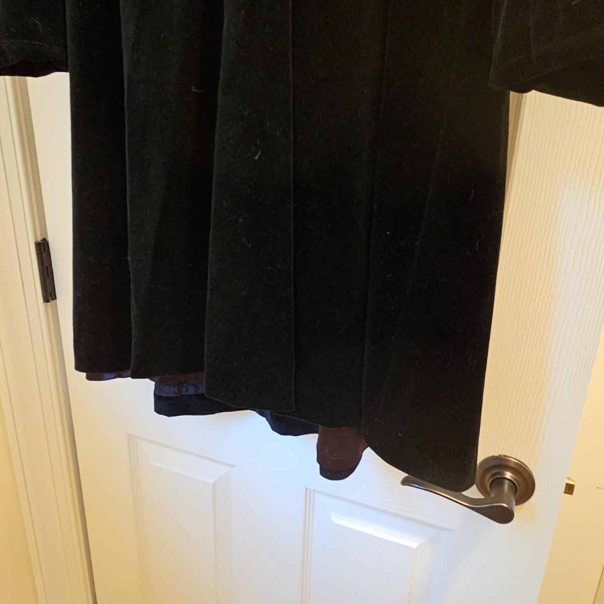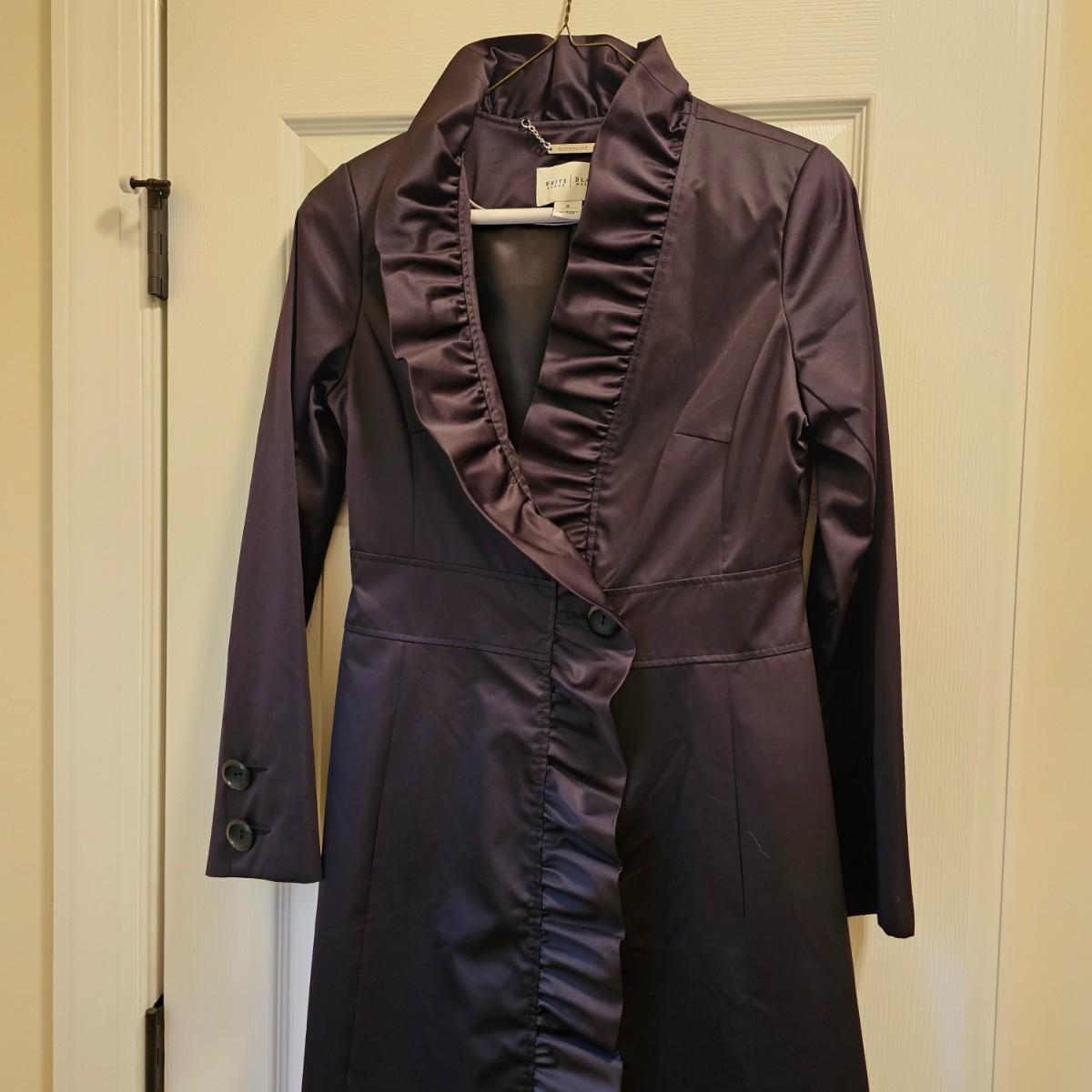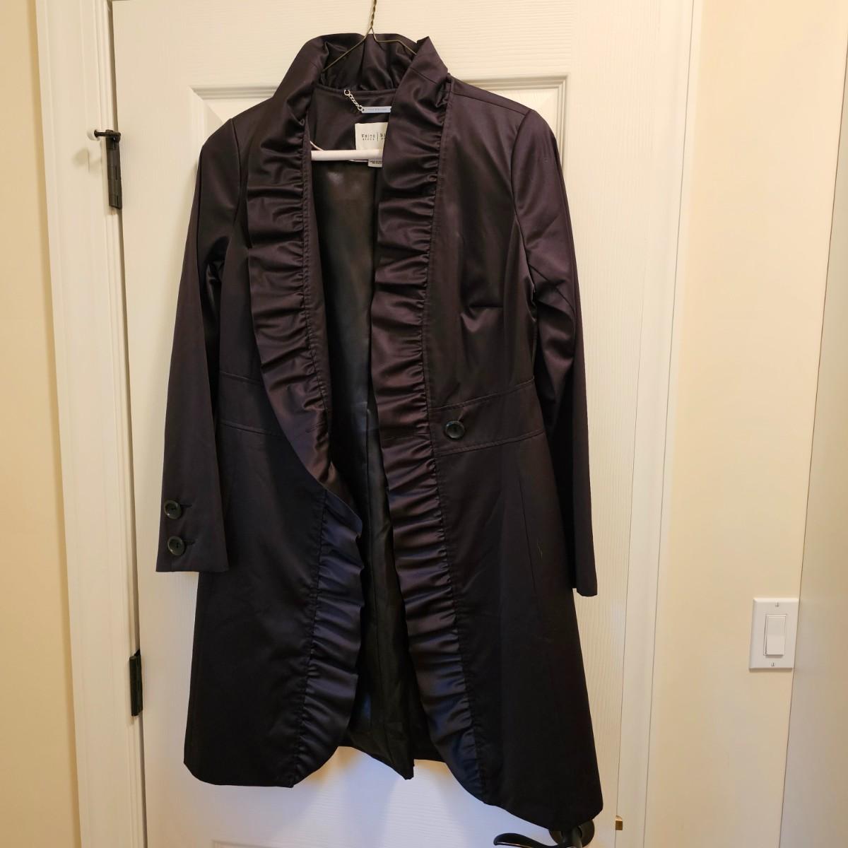A pair of black ladies coats for evening wear or other. Item with ruffled collar and lapels is by WhiteHouse/Black Market, is a size 6 and is 100% polyester. Single button front. Other item is for colder weather by Helena, is a size 10 and comes with a matching hand muffin. Coat has a full hood, is cotton velvet outside and acetate lining. White trim is fox fur. Two button at top near collar. Also included is another hand muff, possibly rabbit with a strap and accent chevron of front. Inside has some discoloration and staining. See photos for details. Shipping available.