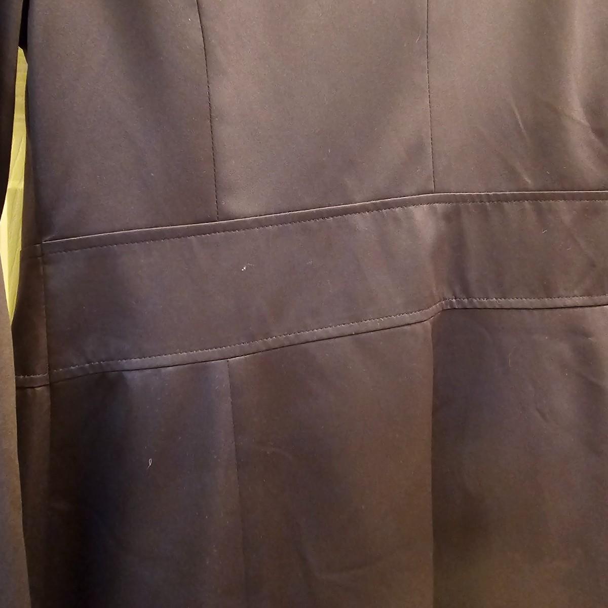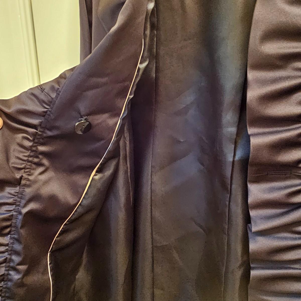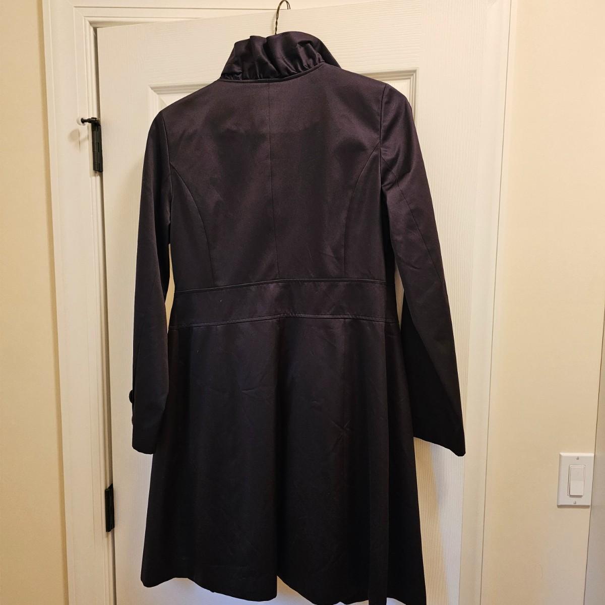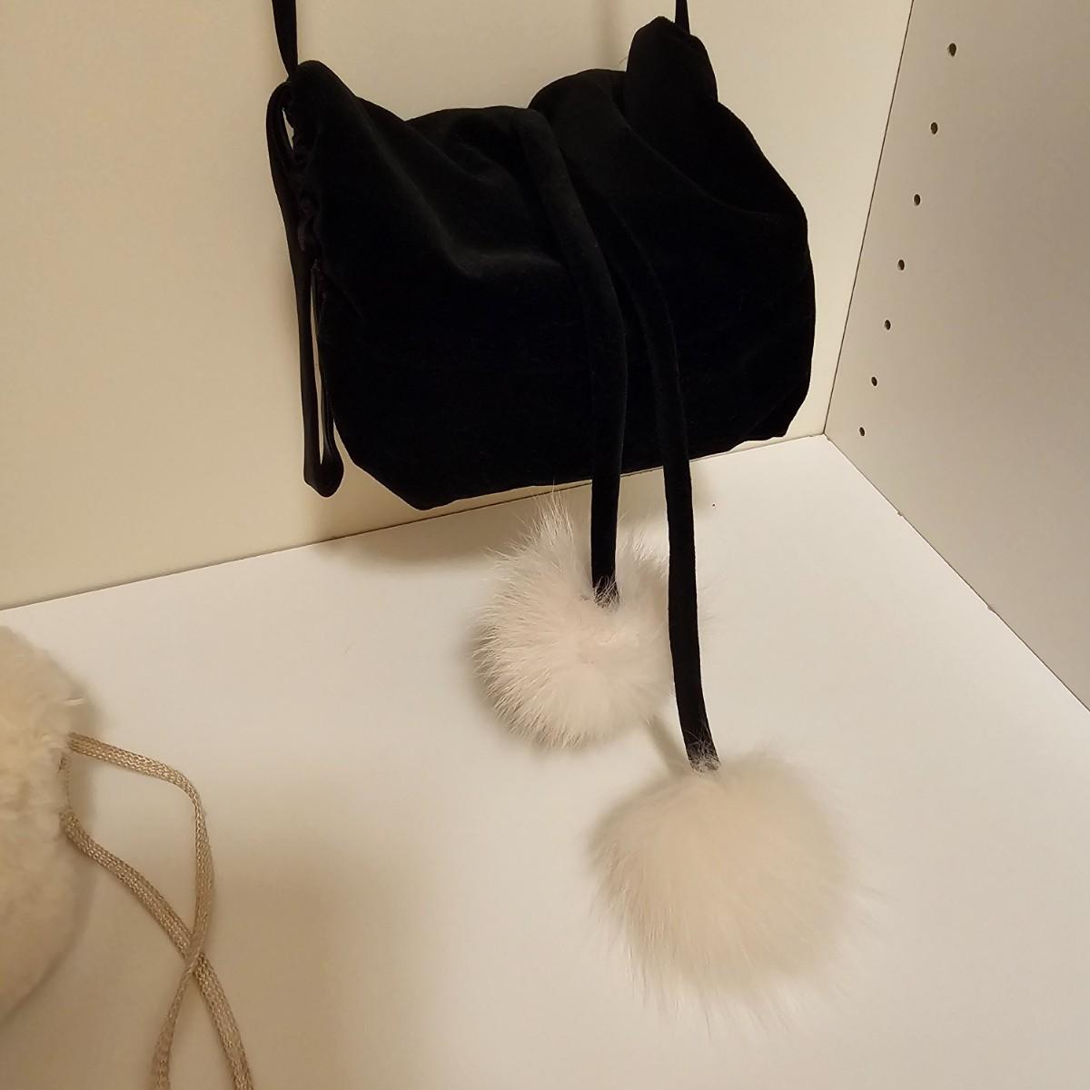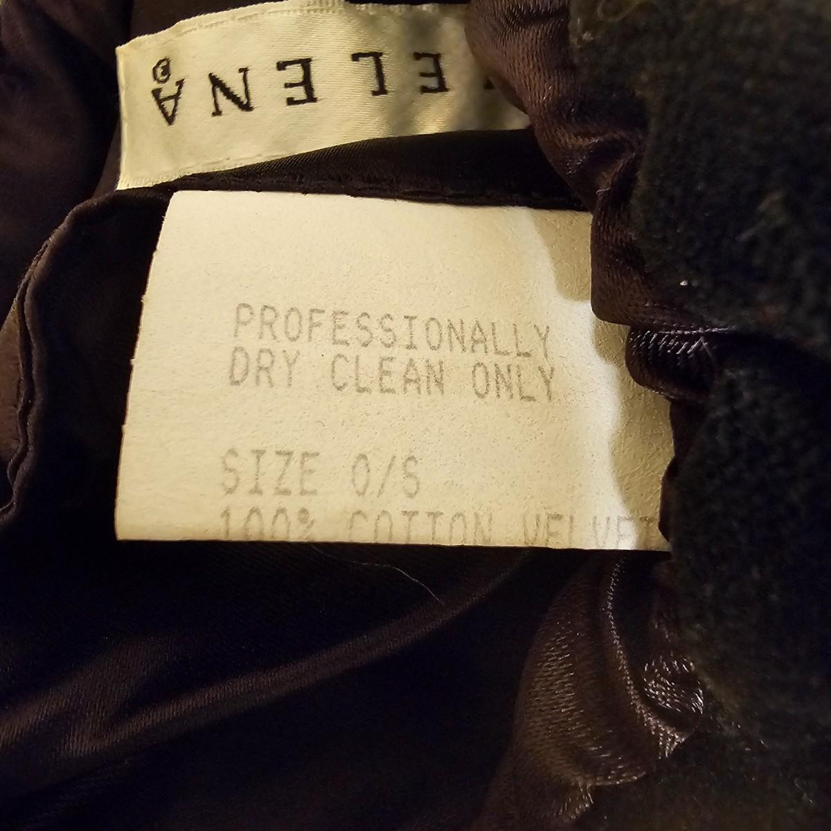 A pair of black ladies coats for evening wear or other. Item with ruffled collar and lapels is by WhiteHouse/Black Market, is a size 6 and is 100% polyester. Single button front. Other item is for colder weather by Helena, is a size 10 and comes with a matching hand muffin. Coat has a full hood, is cotton velvet outside and acetate lining. White trim is fox fur. Two button at top near collar. Also included is another hand muff, possibly rabbit with a strap and accent chevron of front. Inside has some discoloration and staining. See photos for details. Shipping available.