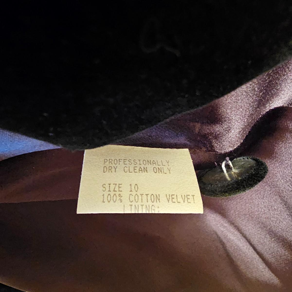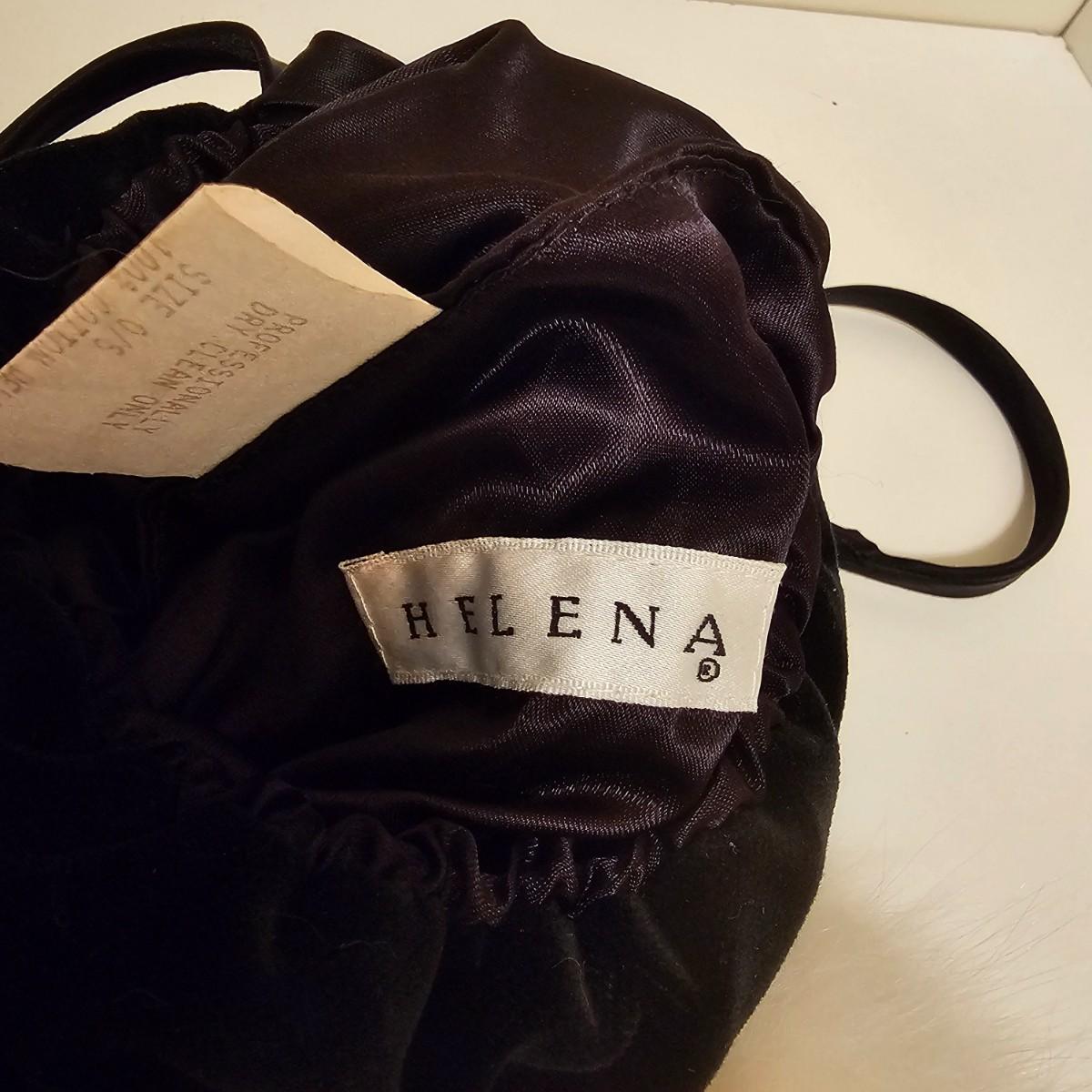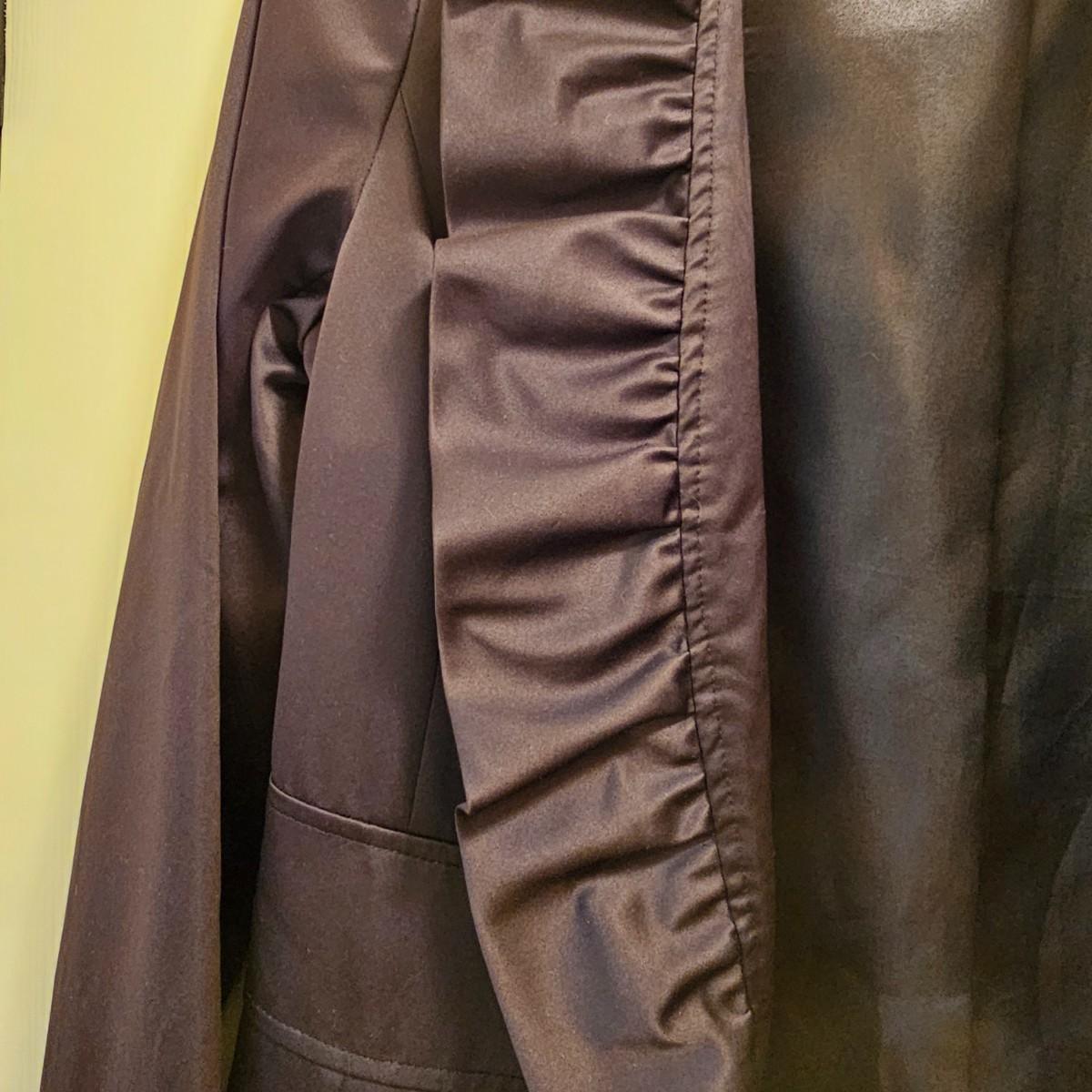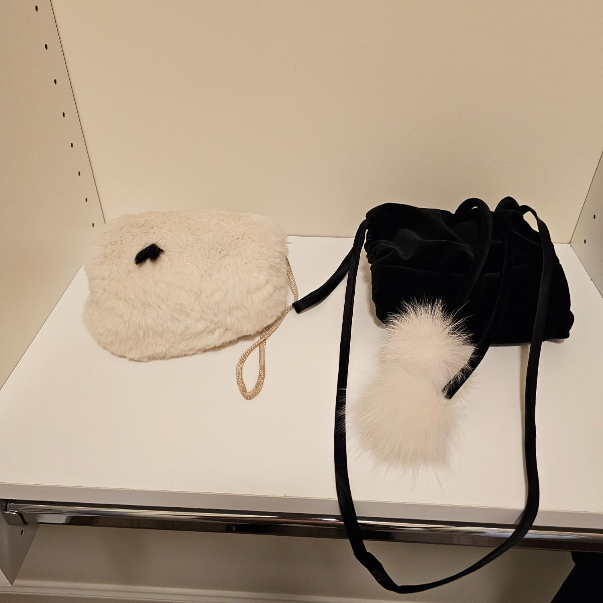 A pair of black ladies coats for evening wear or other. Item with ruffled collar and lapels is by WhiteHouse/Black Market, is a size 6 and is 100% polyester. Single button front. Other item is for colder weather by Helena, is a size 10 and comes with a matching hand muffin. Coat has a full hood, is cotton velvet outside and acetate lining. White trim is fox fur. Two button at top near collar. Also included is another hand muff, possibly rabbit with a strap and accent chevron of front. Inside has some discoloration and staining. See photos for details. Shipping available.