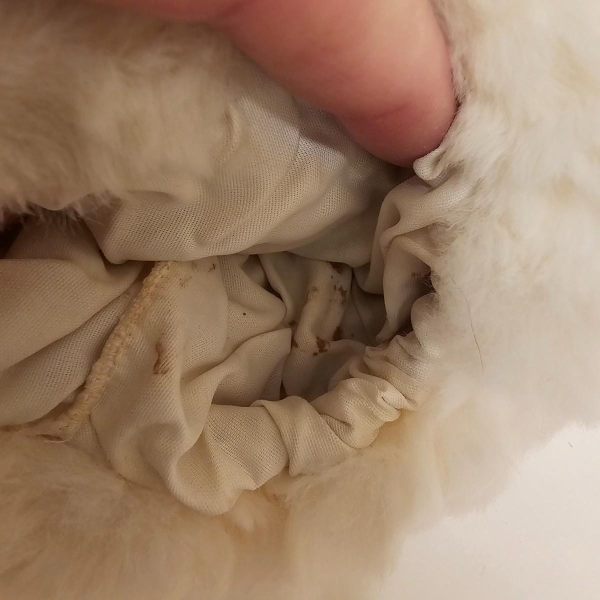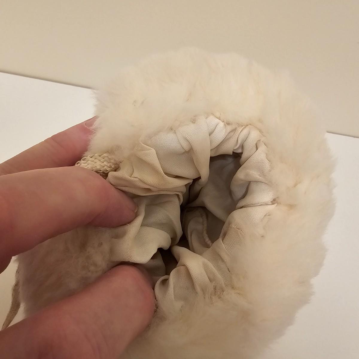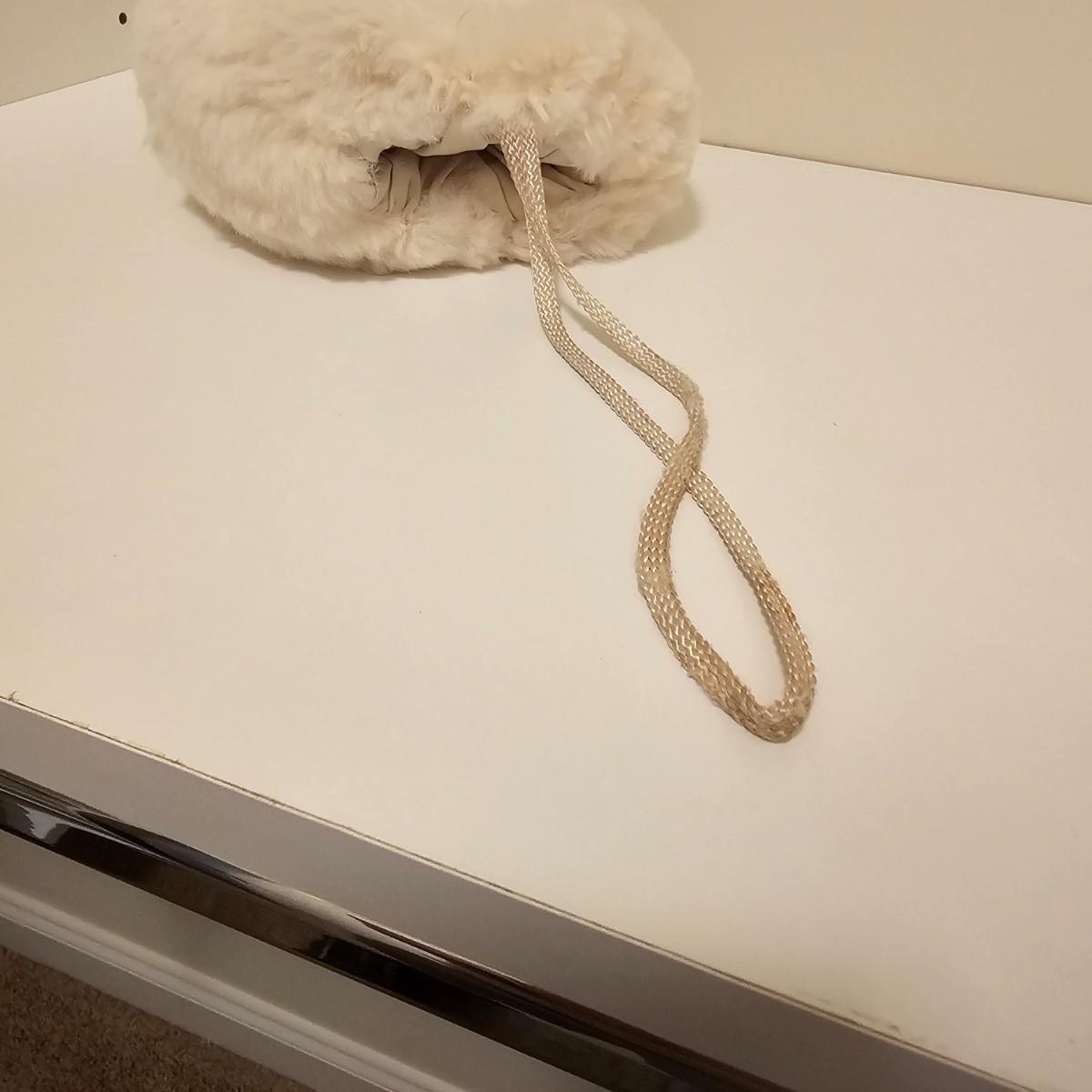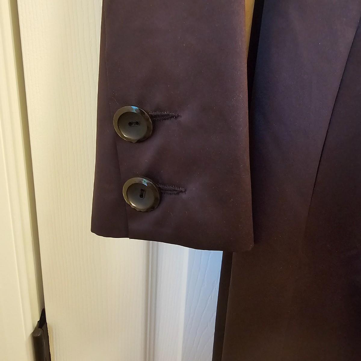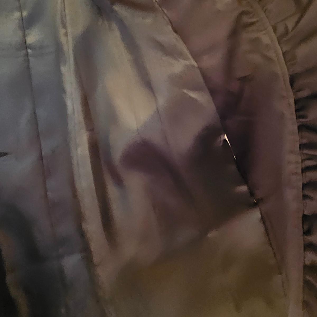 A pair of black ladies coats for evening wear or other. Item with ruffled collar and lapels is by WhiteHouse/Black Market, is a size 6 and is 100% polyester. Single button front. Other item is for colder weather by Helena, is a size 10 and comes with a matching hand muffin. Coat has a full hood, is cotton velvet outside and acetate lining. White trim is fox fur. Two button at top near collar. Also included is another hand muff, possibly rabbit with a strap and accent chevron of front. Inside has some discoloration and staining. See photos for details. Shipping available.