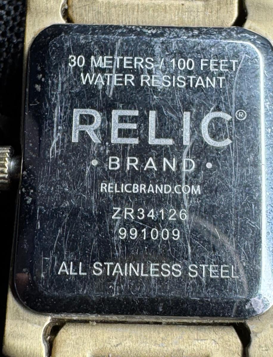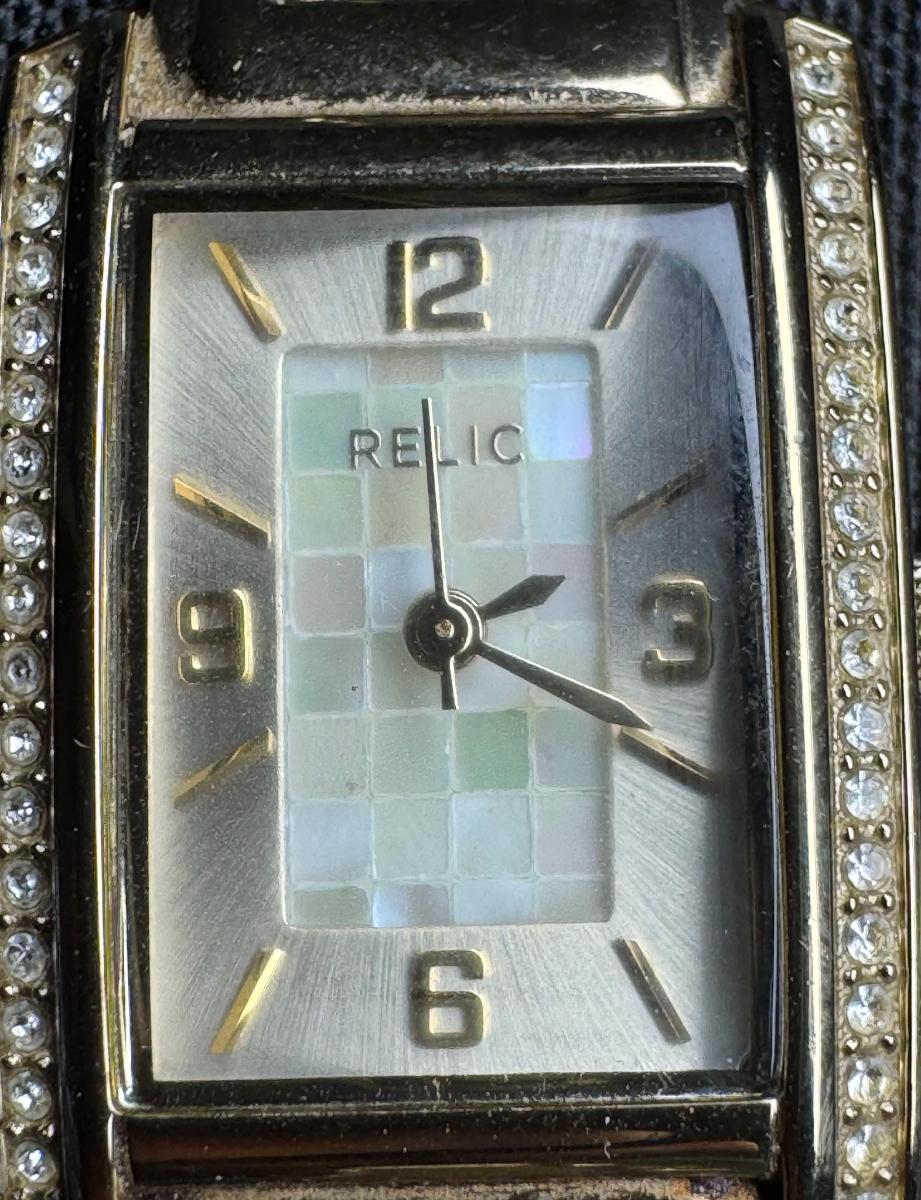 Includes a Burberry Heritage Bangle silver tone watch, model BU4701, with quartz movement, made in Switzerland, and water resistant to 30 meters. Also includes a Relic by Fossil gold tone quartz watch with a mother of pearl mosaic face, model ZR34126, water resistant to 30 meters. Total of two pieces. Not tested. [JL]