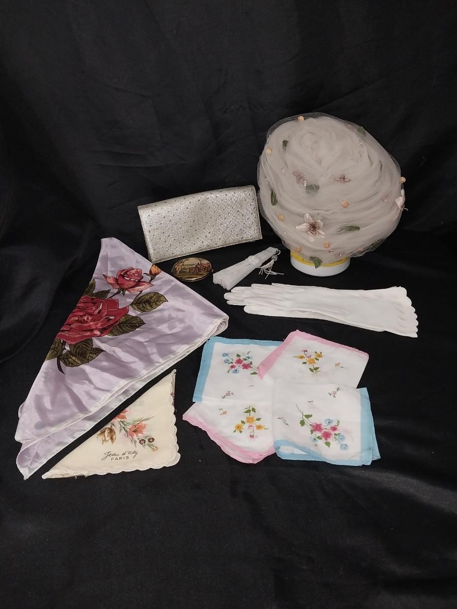 LADIES DON ANDERSON HAT-PRETTY HANKIES-CLUTCH-GLOVES AND COMPACT