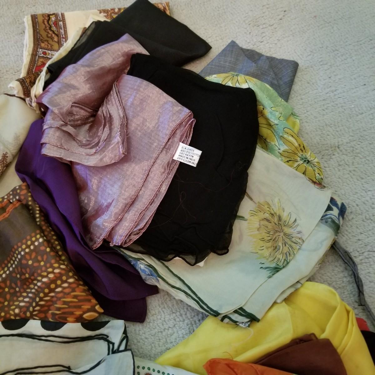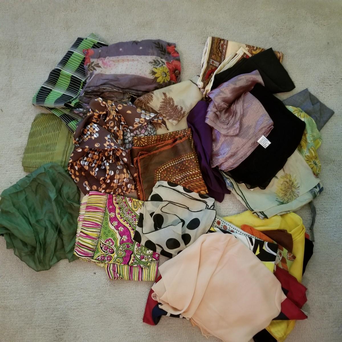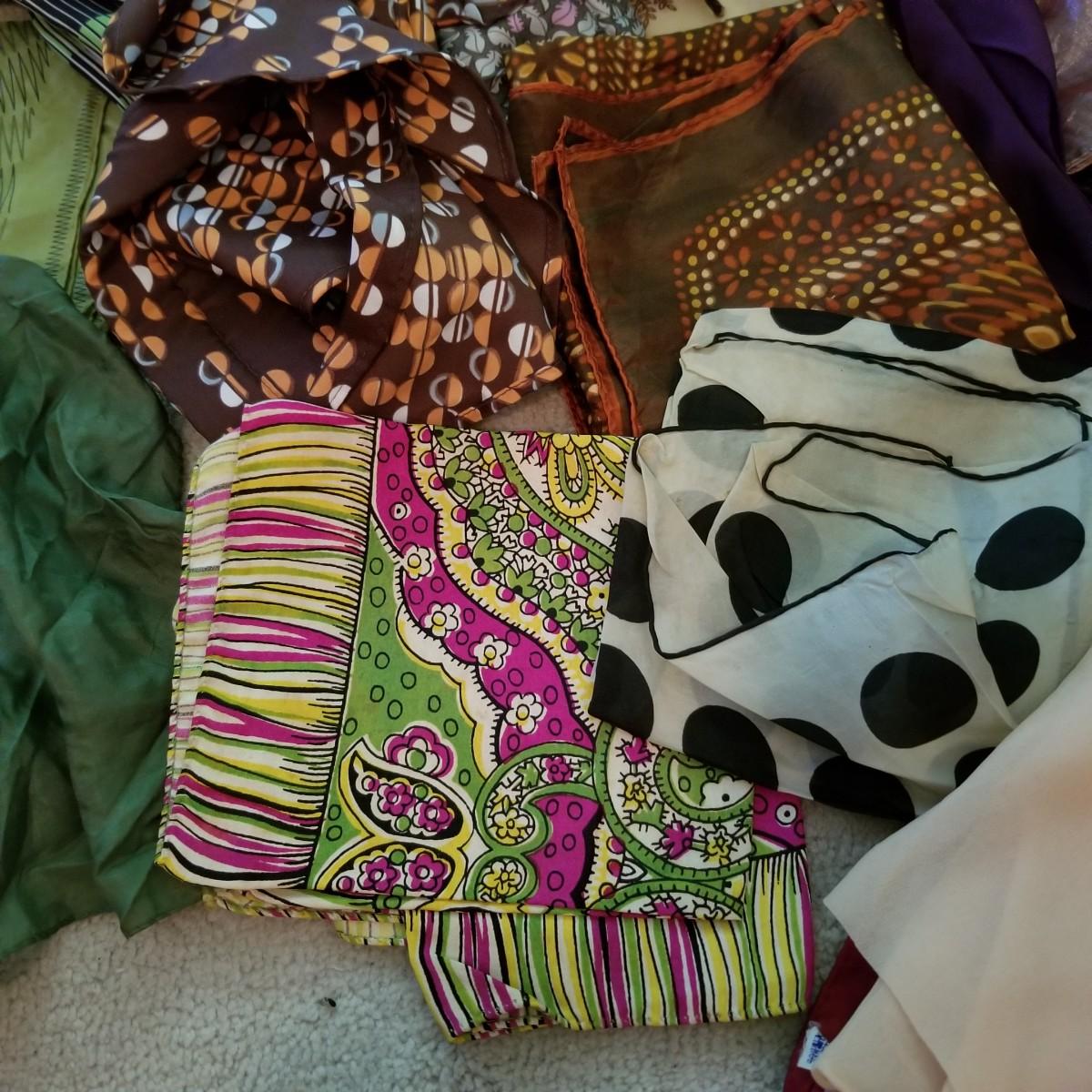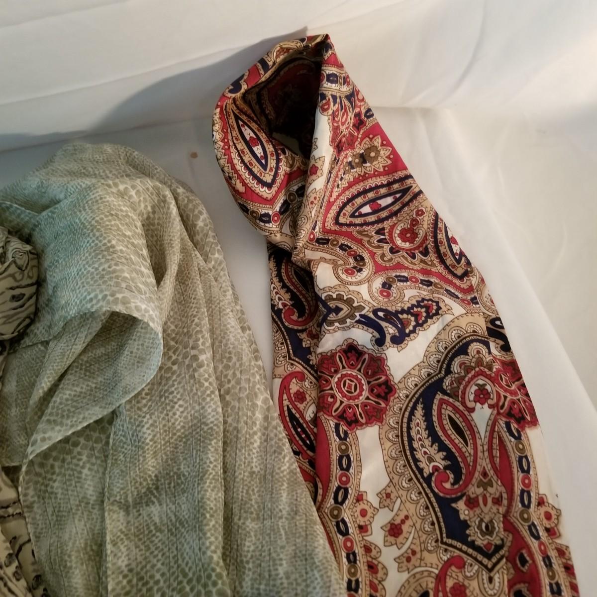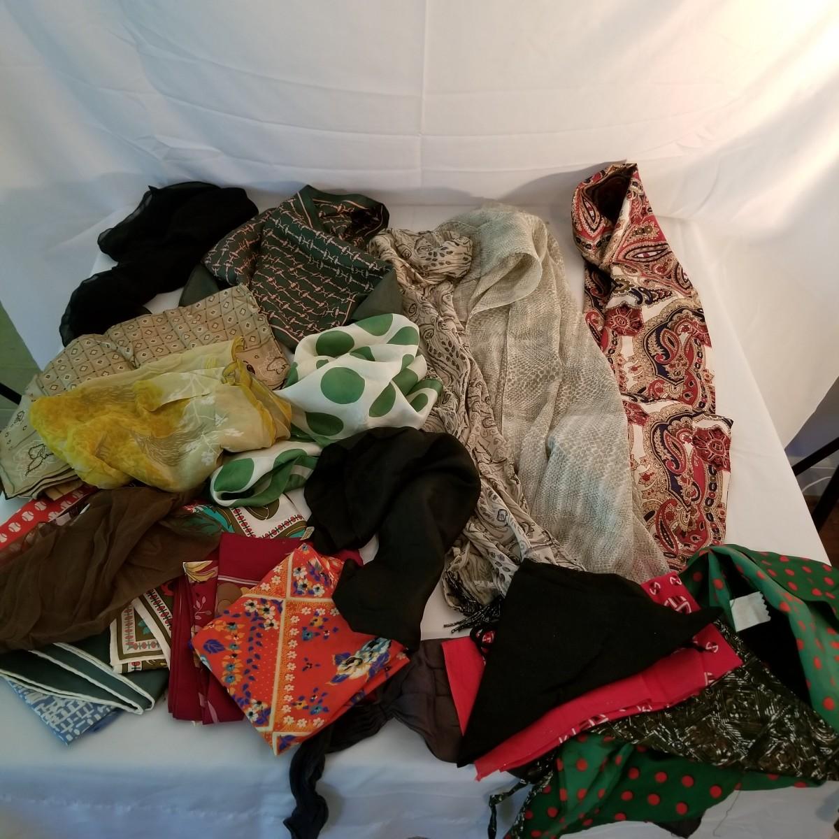 An assortment of ladies dress scarves in multiple patterns and colors. Silk, rayon, polyester, acetate and cotton. Length from bandana size to 72". Approximately fifty pieces. See photos for detail. Shipping available.