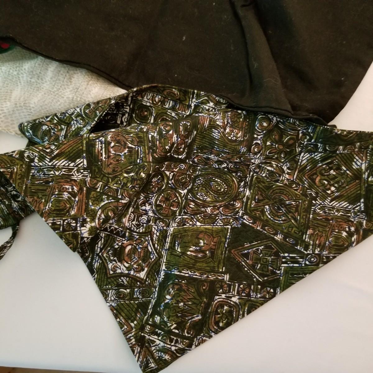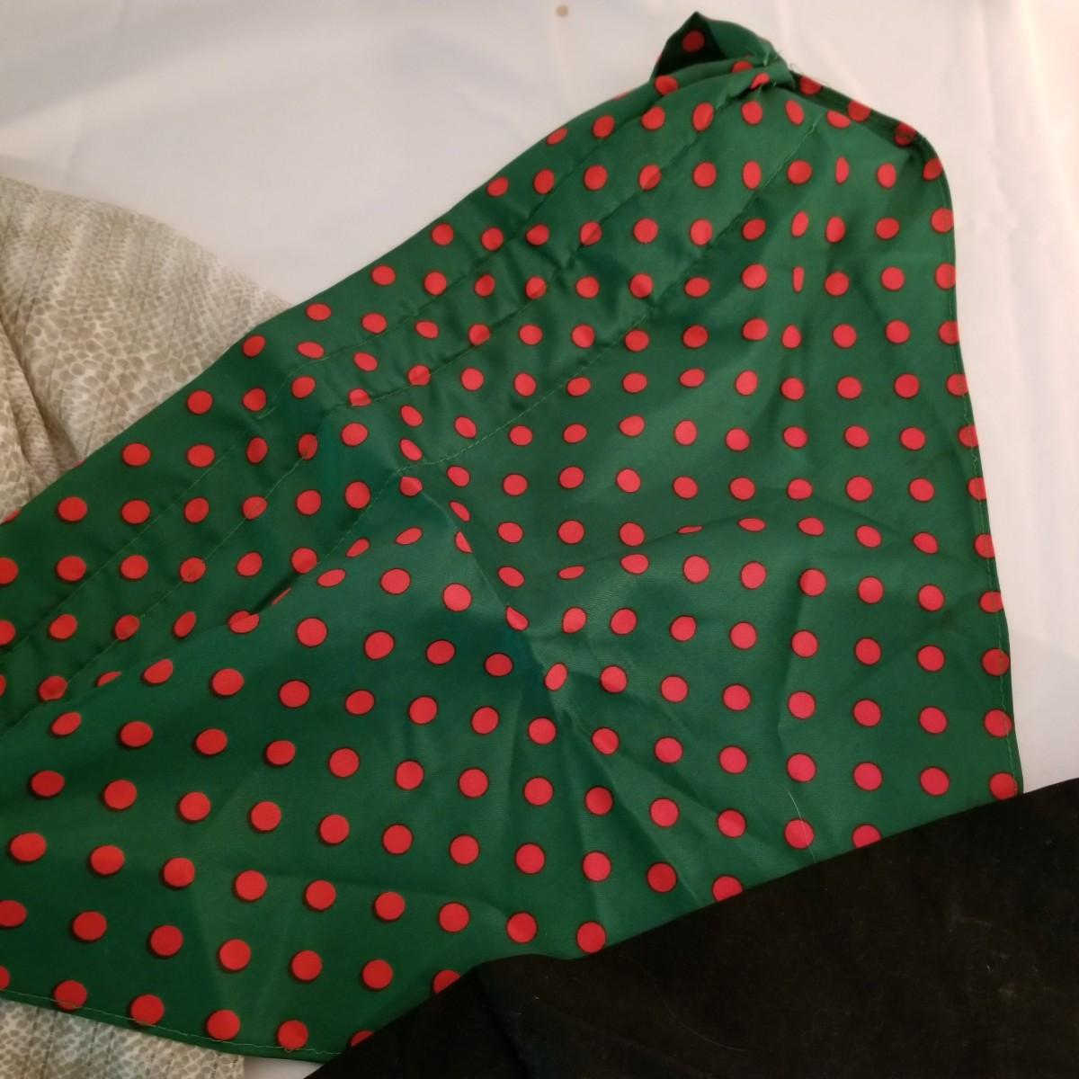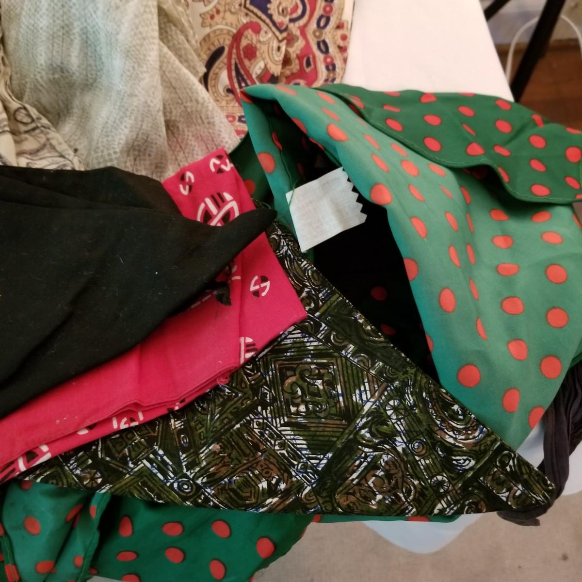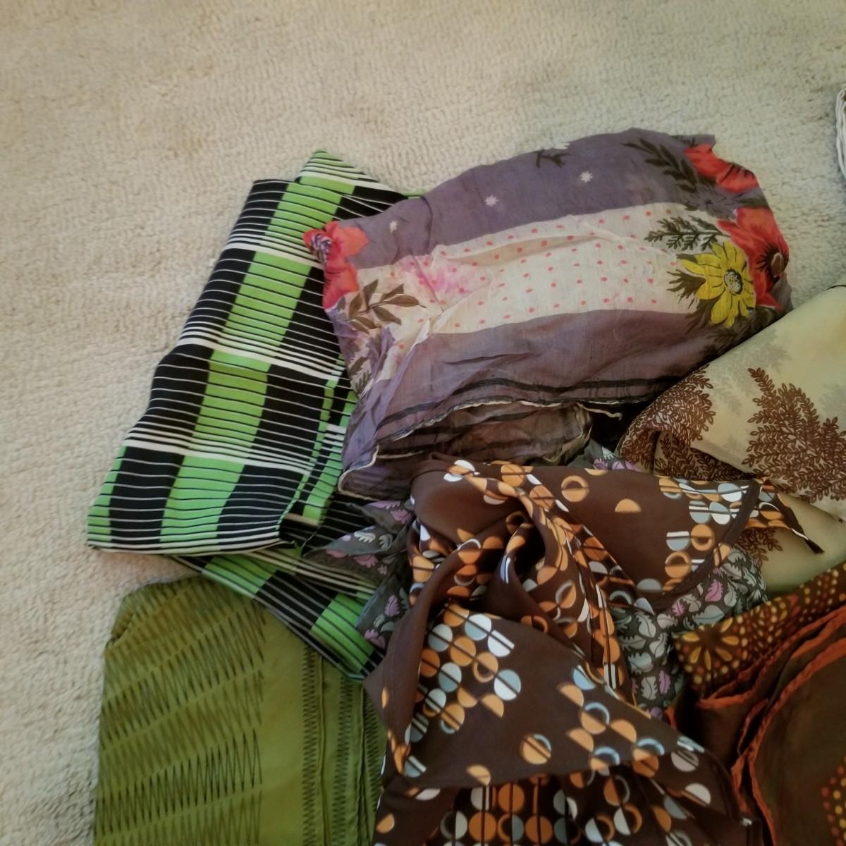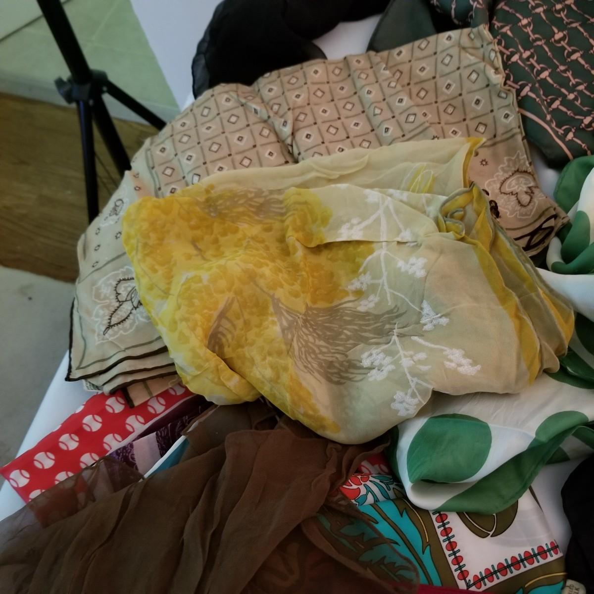 An assortment of ladies dress scarves in multiple patterns and colors. Silk, rayon, polyester, acetate and cotton. Length from bandana size to 72". Approximately fifty pieces. See photos for detail. Shipping available.
