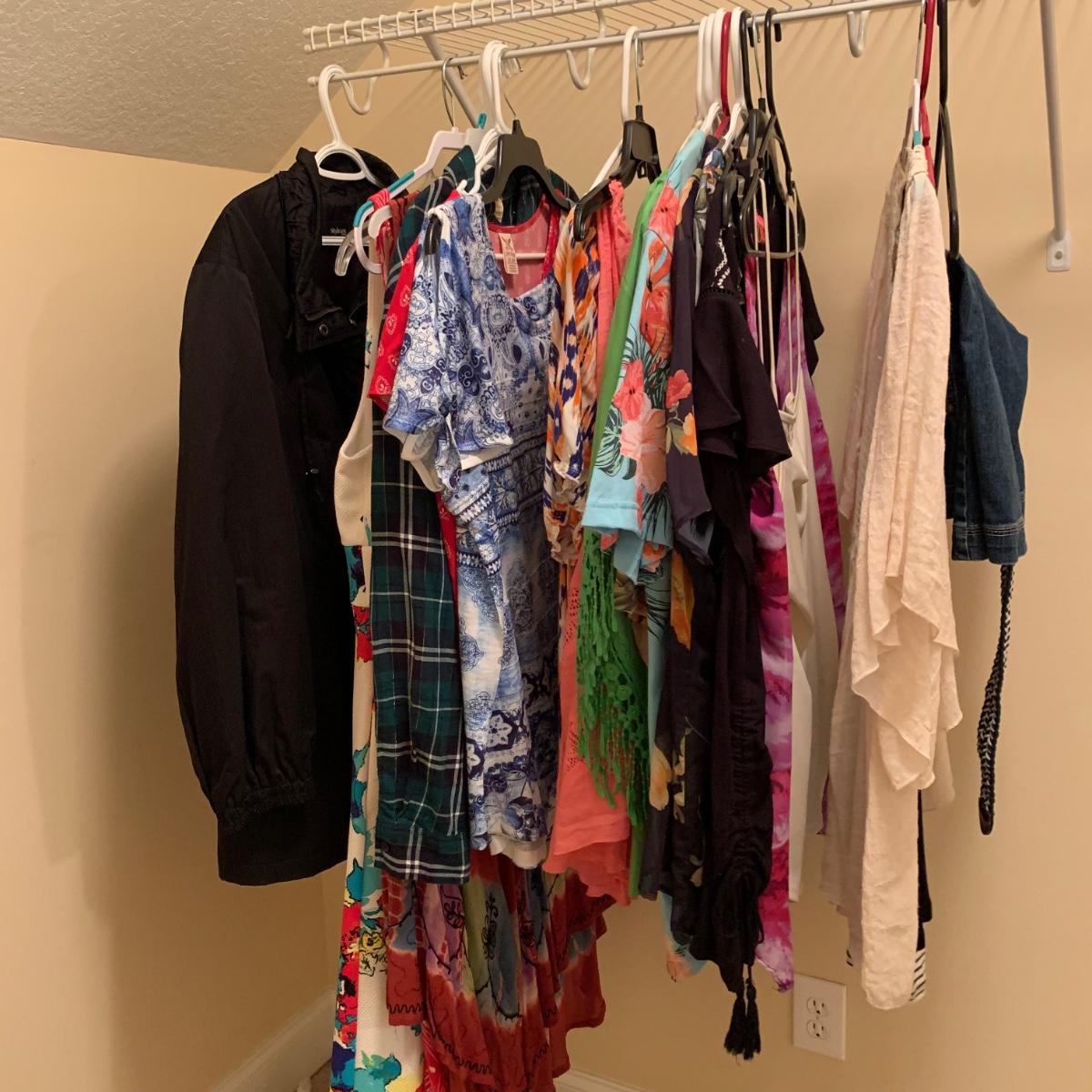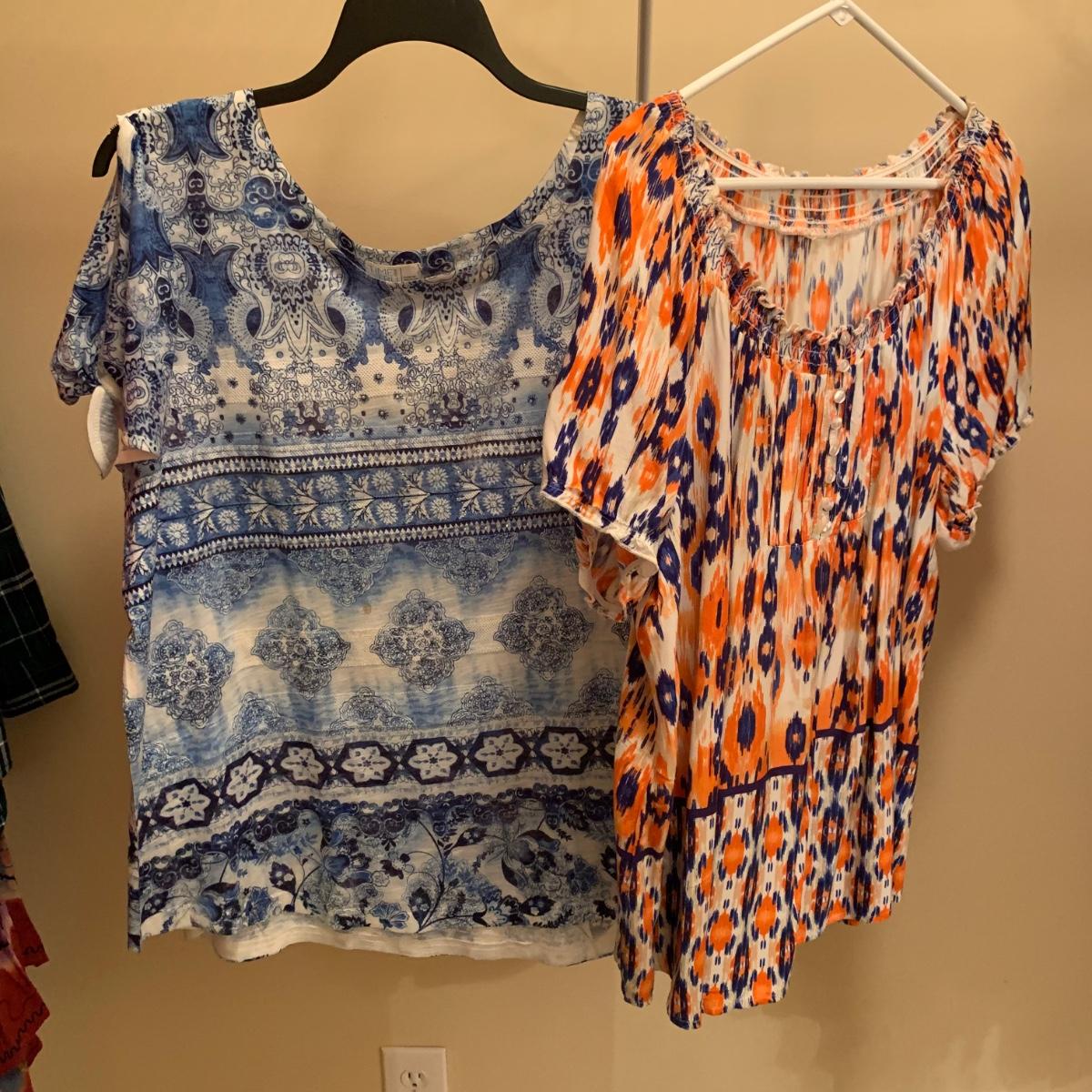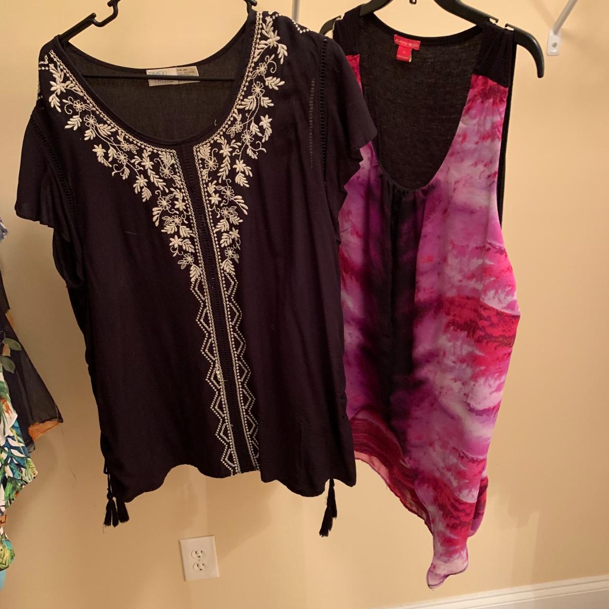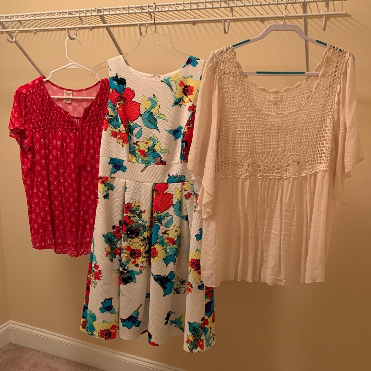 15 ladies tops, three dresses, a pair of size 16 Gloria Vanderbilt jean shorts, and a Style & Co. coat are included in this lot. Items are size XL/2X. Please see photos for inventory and details.