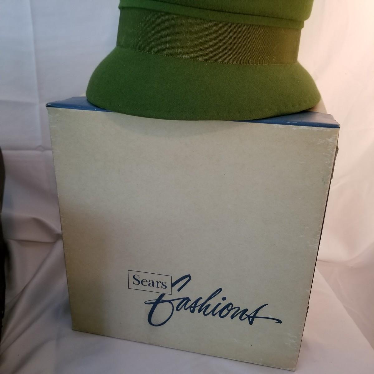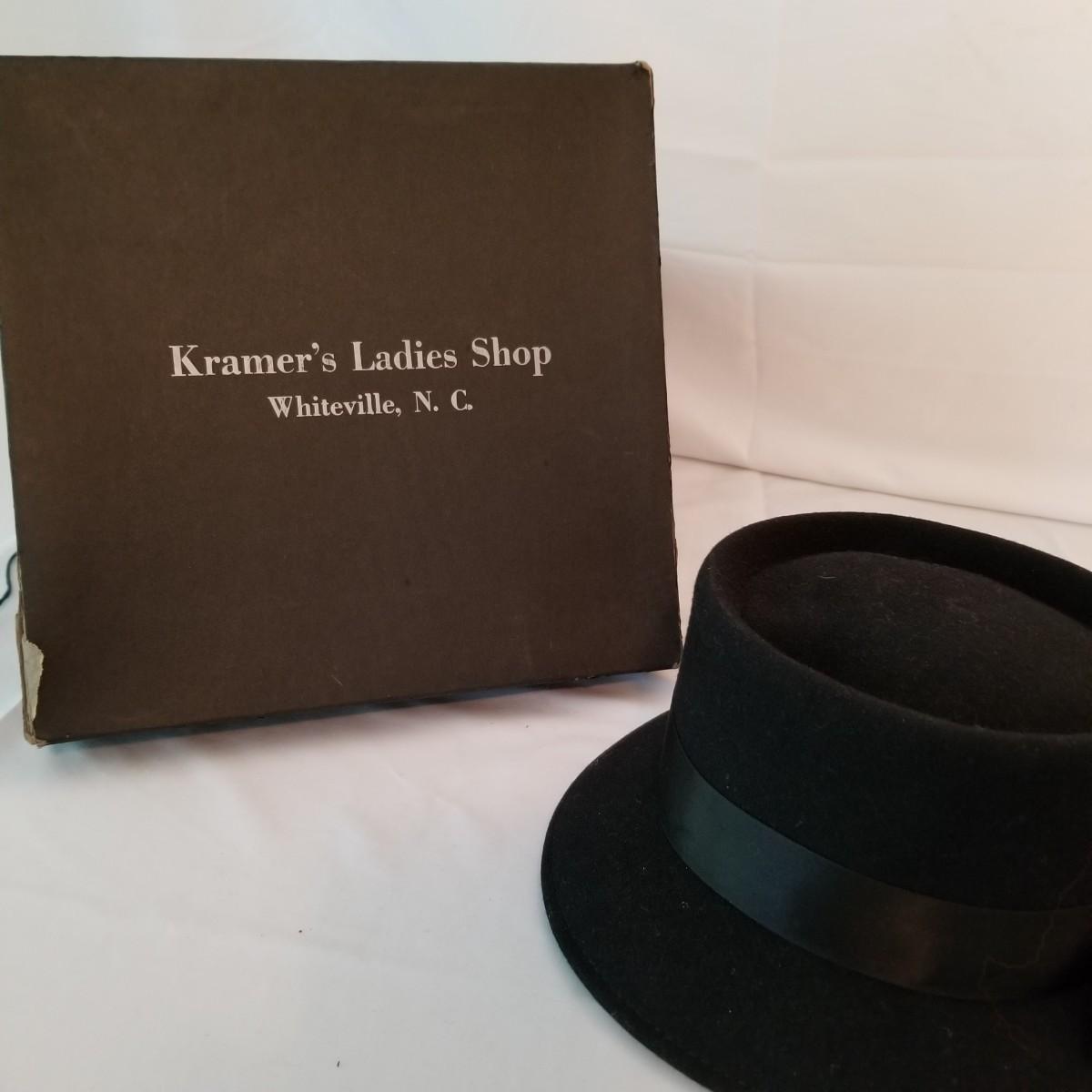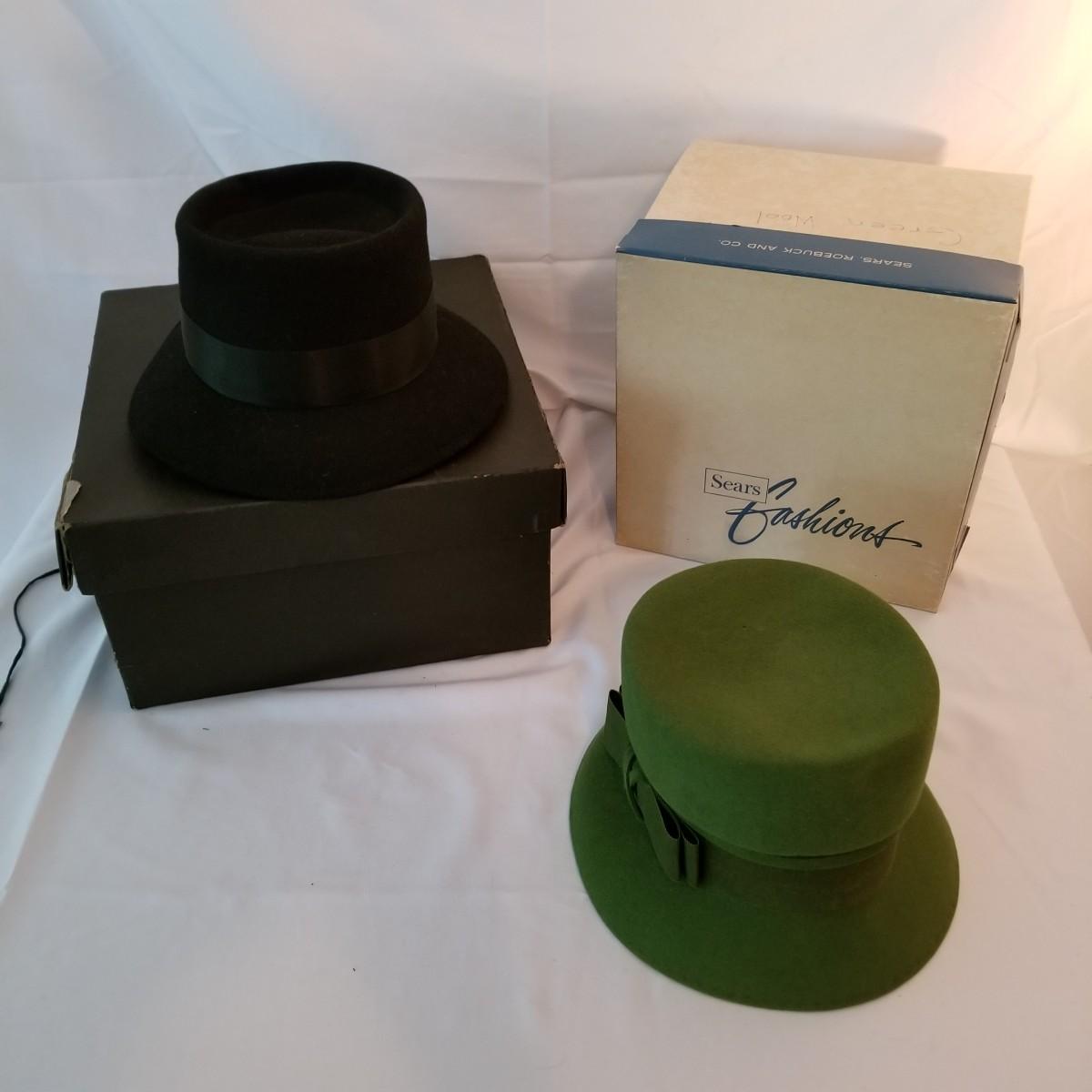 Two ladies high fashion hats, one from Sears and one from Kramer's Ladies Shop. Both items in good condition, in original boxes. See photos for detail. Shipping available.