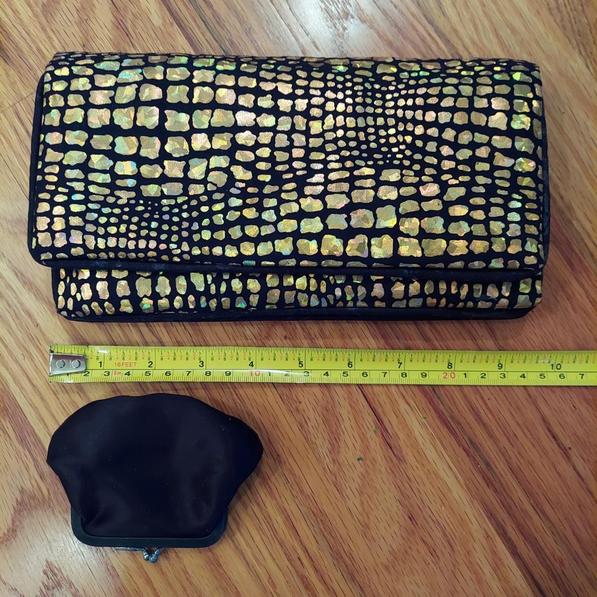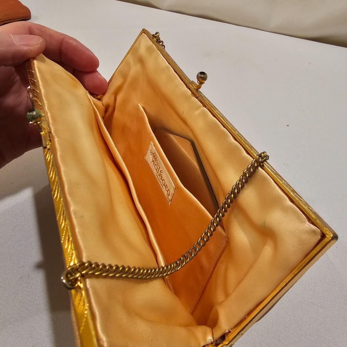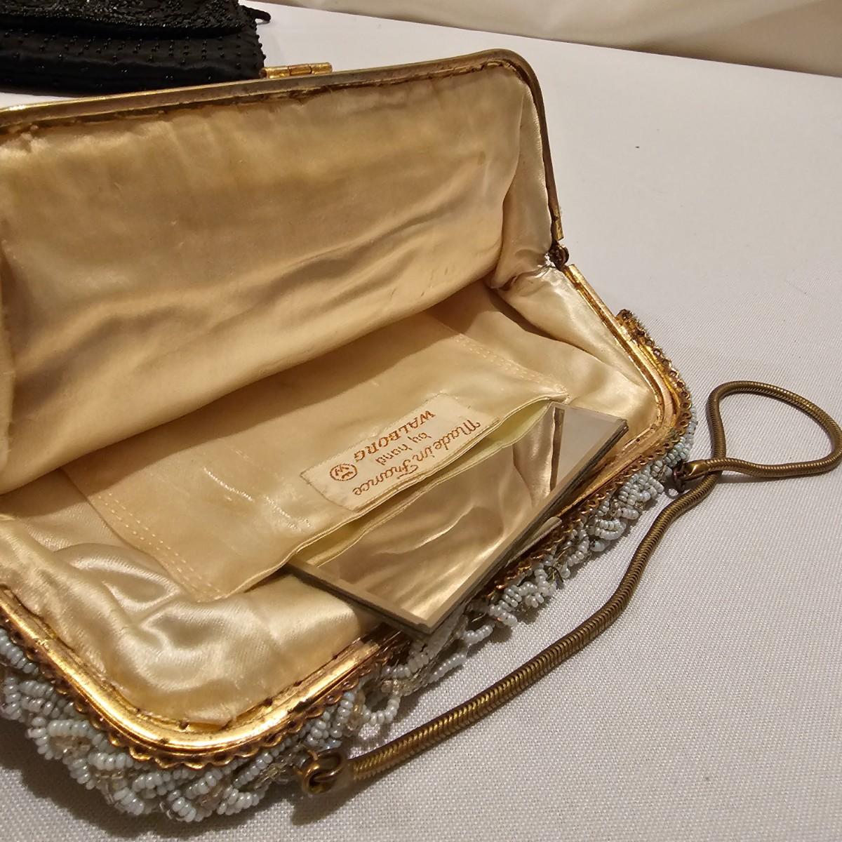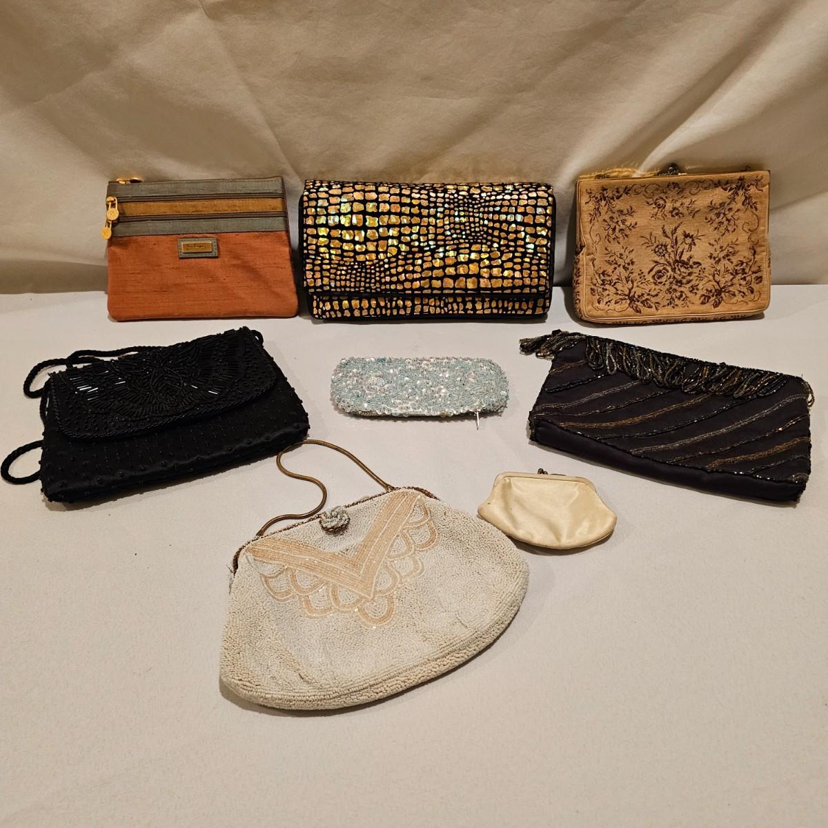Six ladies high fashion purses/clutches and two smaller items. Several pieces handmade in France and China, decorated with fine beads. Walborg, Jim Thompson, La Regale, others. The smallest black coin purse measures approximately 4" x 3.5"H. The largest gold and black clutch is 9.5" x 2.5" x 5"H. See photos for details. Shipping available.