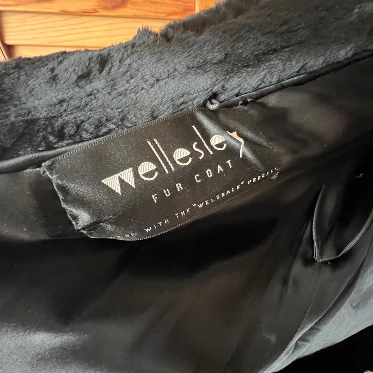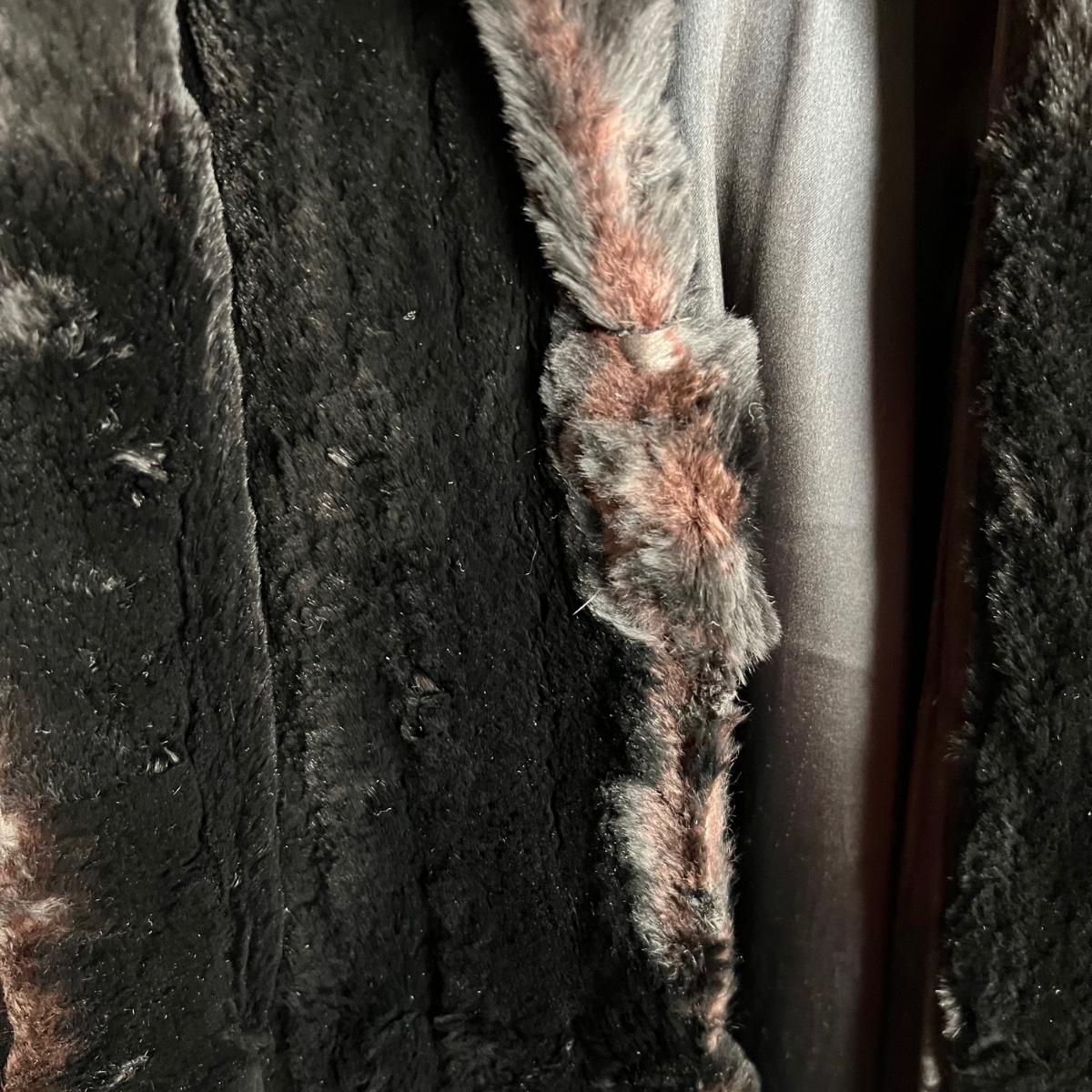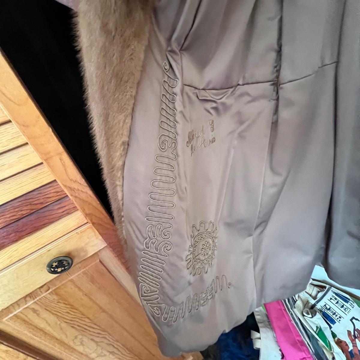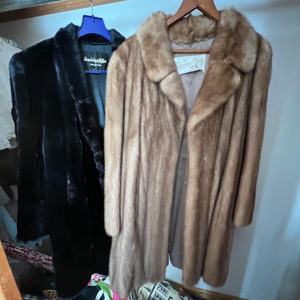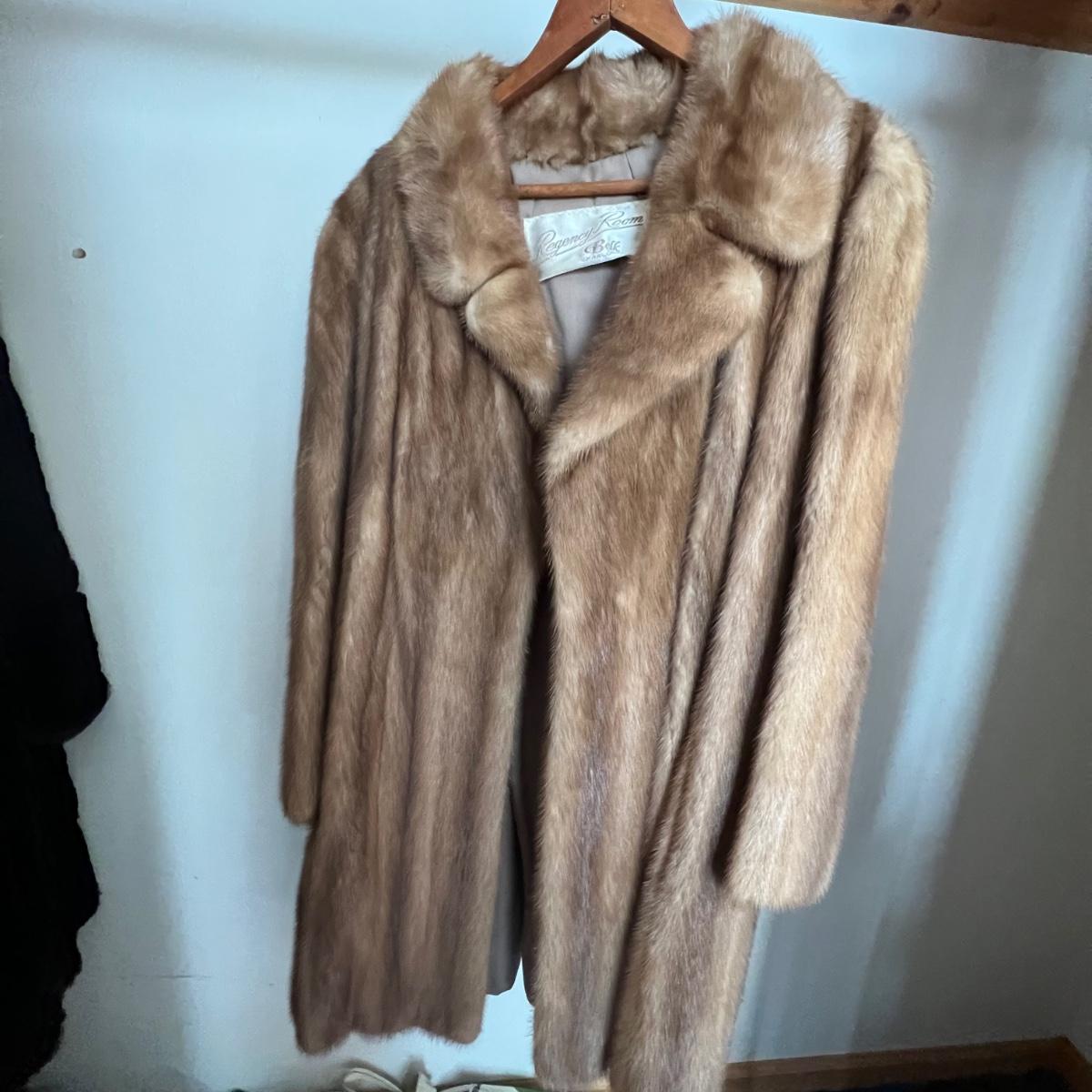 One black and one camel colored fur coats in this lot that also includes a fur collar; we cannot guarantee the material of any items in this lot. The camel colored coat has a label stating Regency Room, Belk, Charlotte, it measures 22” chest x 36” long. The black “˜Wellesley’ coat is the same size but 1” longer. This coat comes with extra fur swatches; there is some discoloration on the front of this jacket where the black is now a purple color, see images. The fur collar is dark brown with an orange/red silk like lining that does have some minor discoloration, it measures 25” long x 4.5” H.