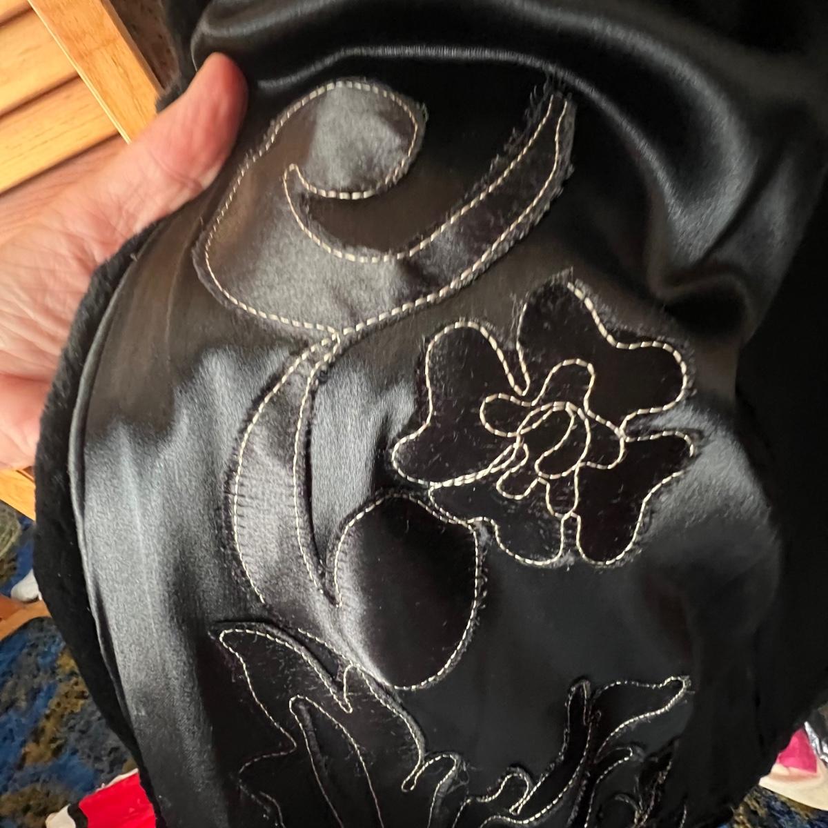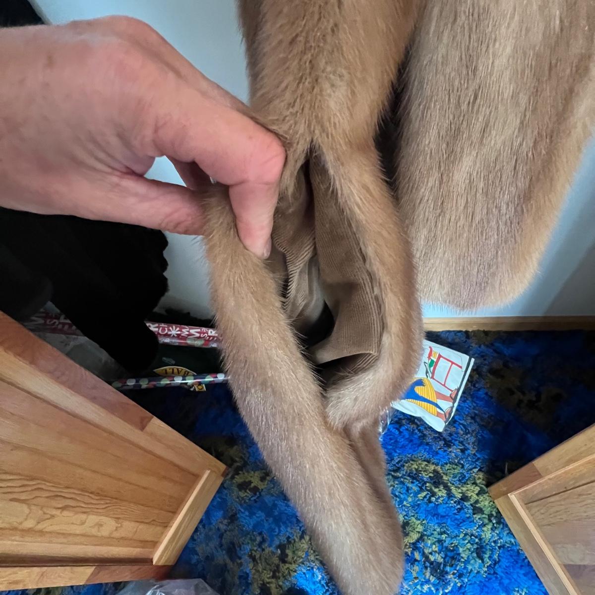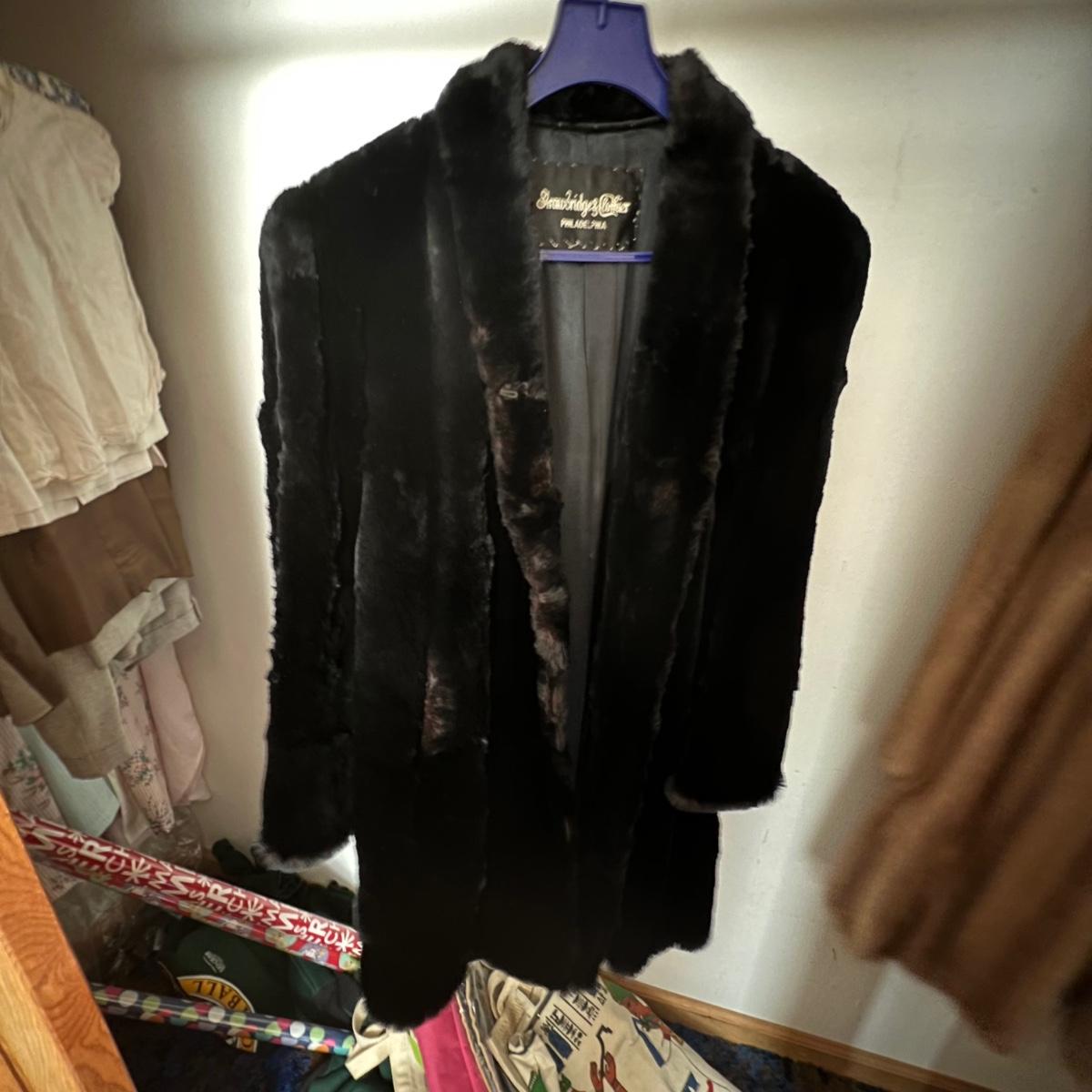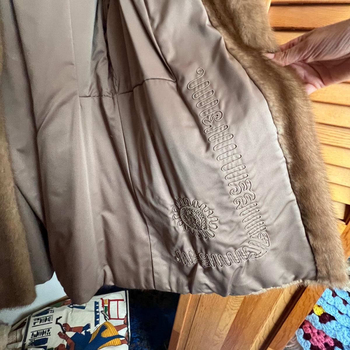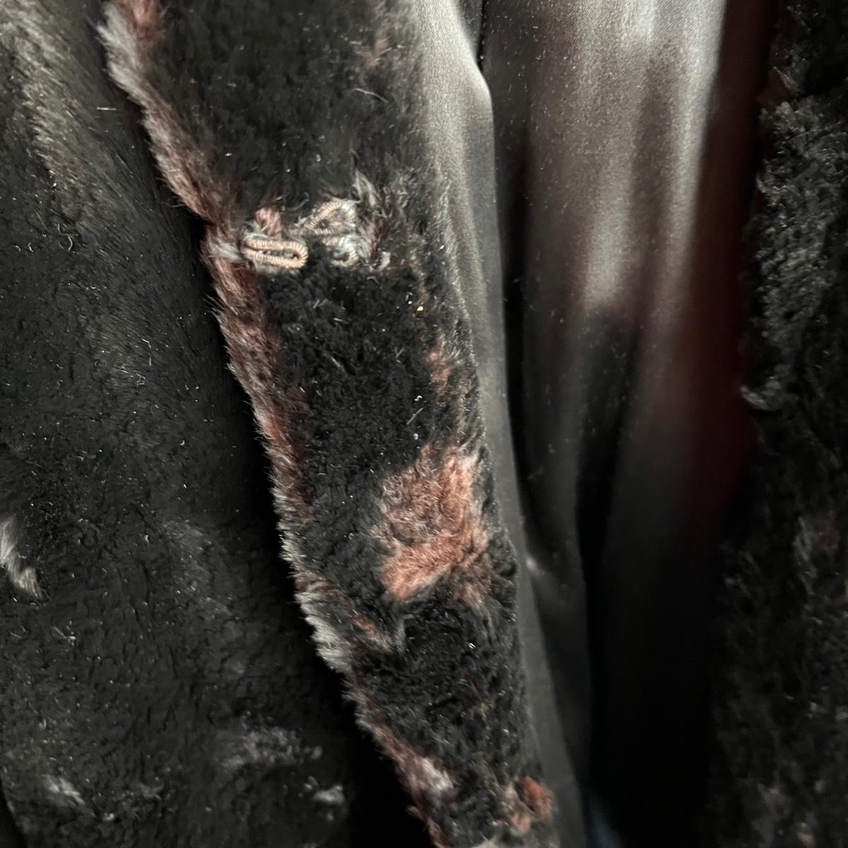 One black and one camel colored fur coats in this lot that also includes a fur collar; we cannot guarantee the material of any items in this lot. The camel colored coat has a label stating Regency Room, Belk, Charlotte, it measures 22” chest x 36” long. The black “˜Wellesley’ coat is the same size but 1” longer. This coat comes with extra fur swatches; there is some discoloration on the front of this jacket where the black is now a purple color, see images. The fur collar is dark brown with an orange/red silk like lining that does have some minor discoloration, it measures 25” long x 4.5” H.