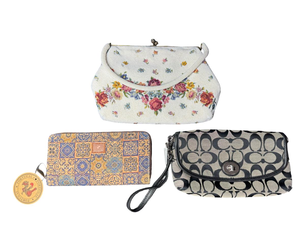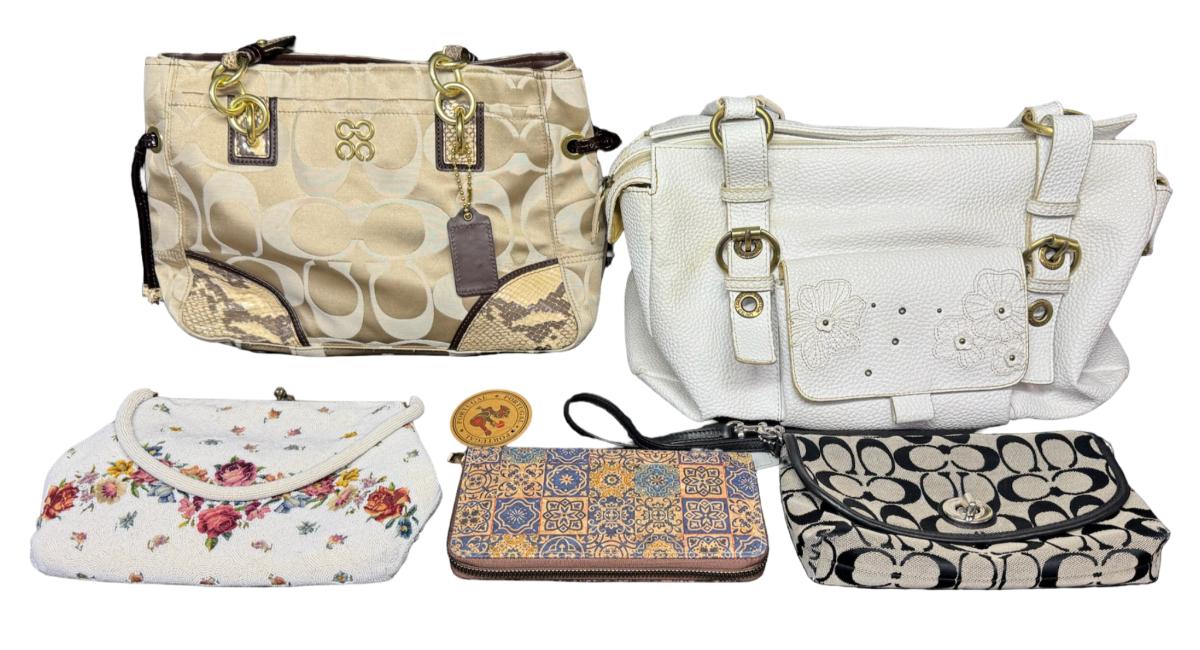 Includes Coach, Benetton, vintage beaded, and more. Total of five pieces. There is age related wear, including some minor staining on the insides. [RY]