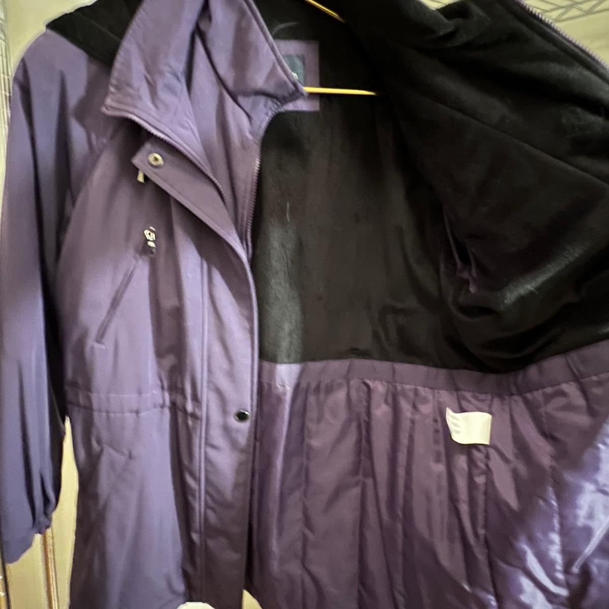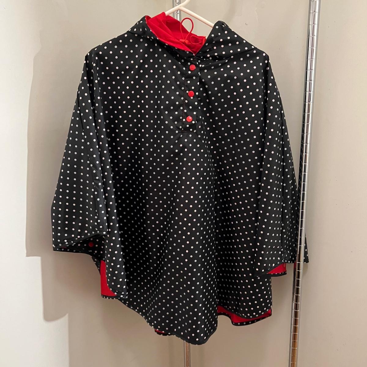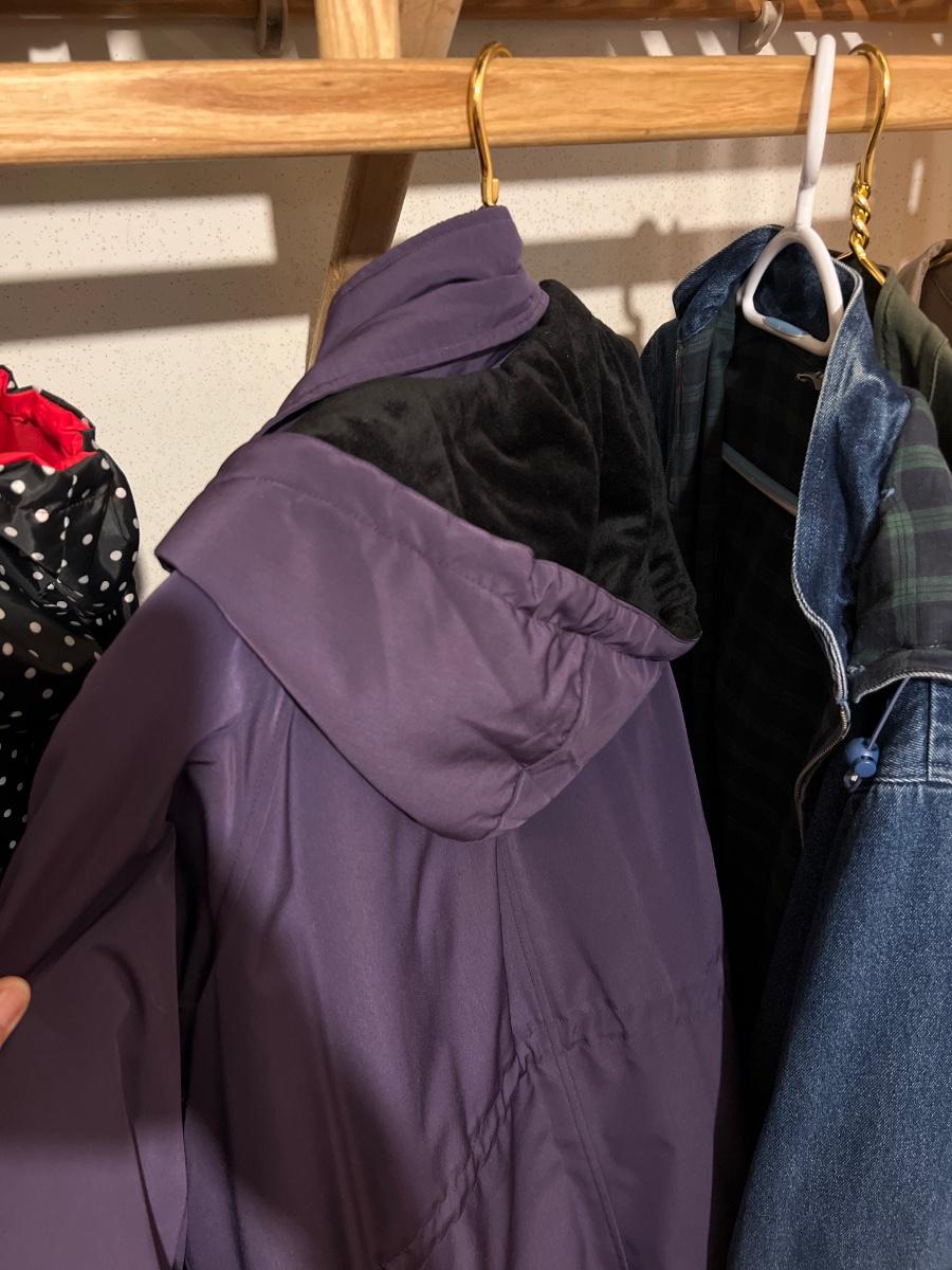 Four jackets and a rain poncho are mostly size L/XL, see images. No label on the polka dot rain poncho. The North Style denim jacket and the purple Nautica are both heavier/lined jackets for colder weather and have hoods.