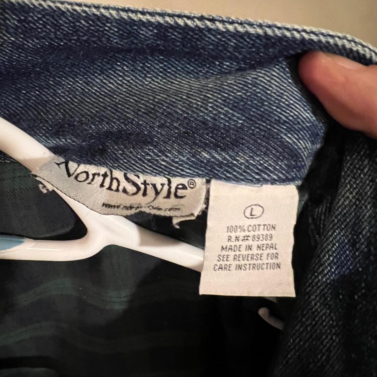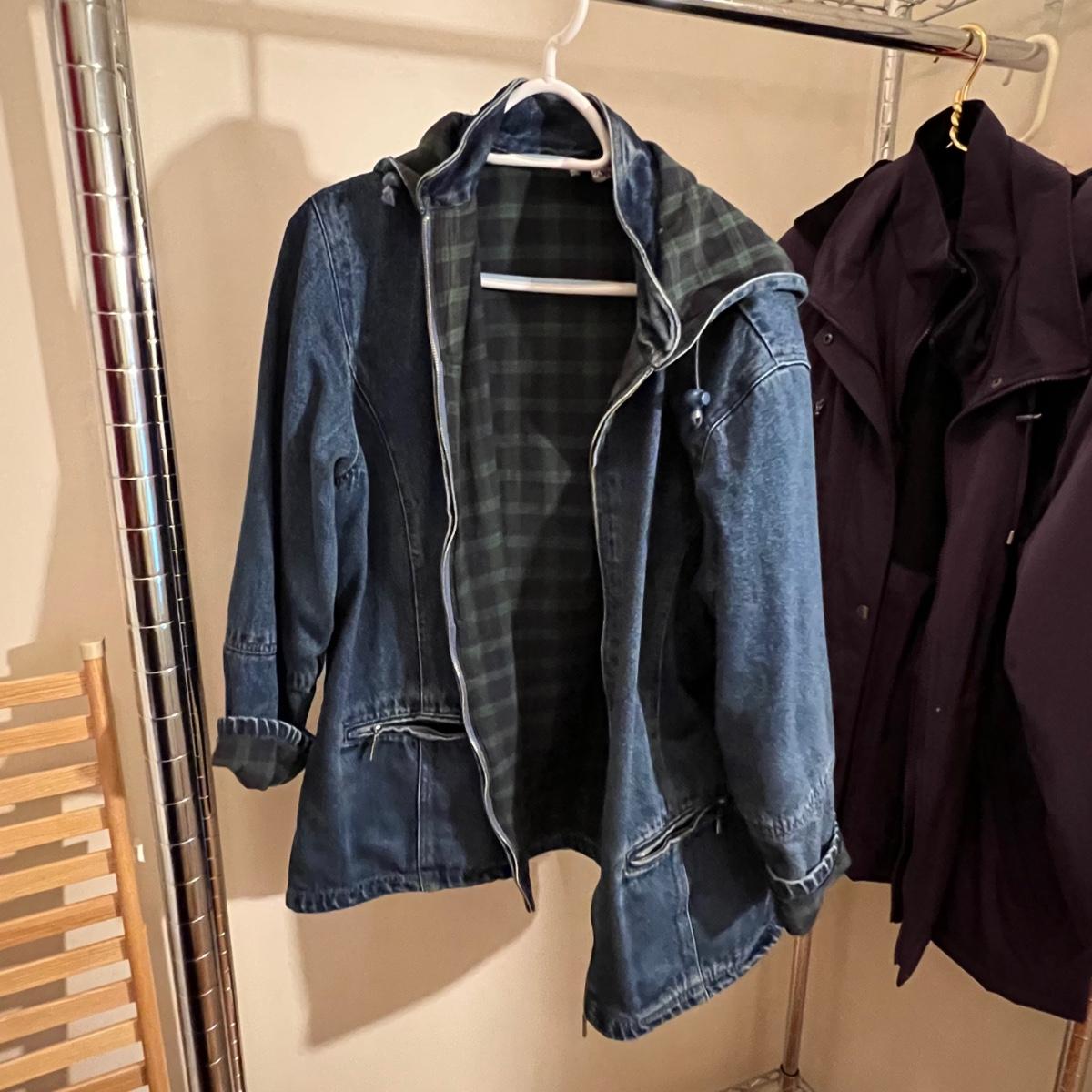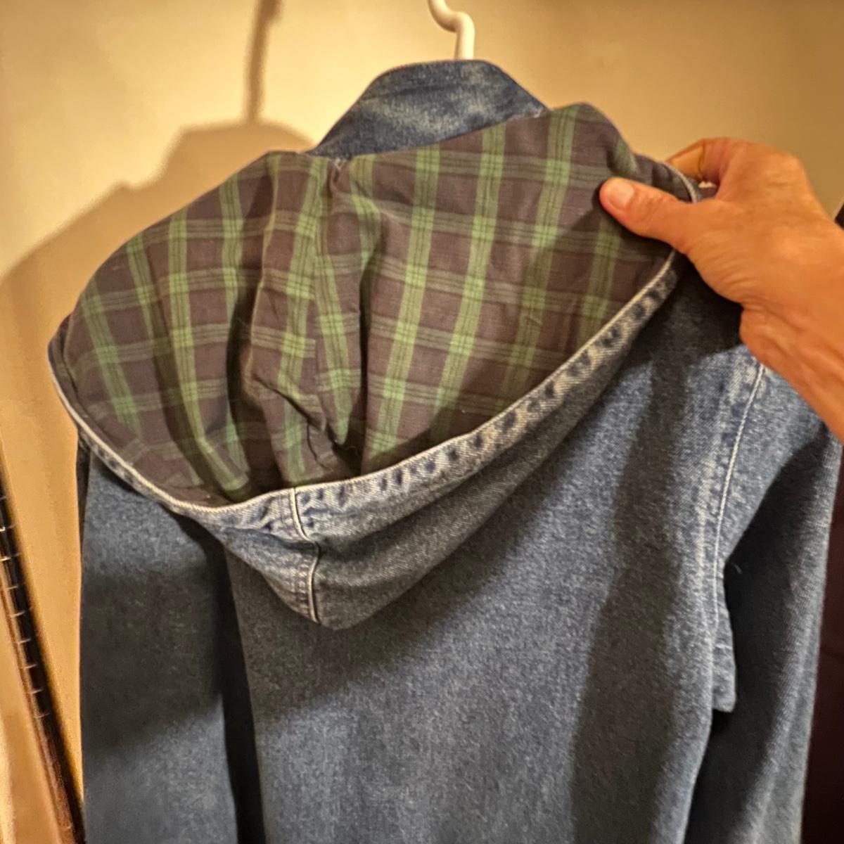 Four jackets and a rain poncho are mostly size L/XL, see images. No label on the polka dot rain poncho. The North Style denim jacket and the purple Nautica are both heavier/lined jackets for colder weather and have hoods.