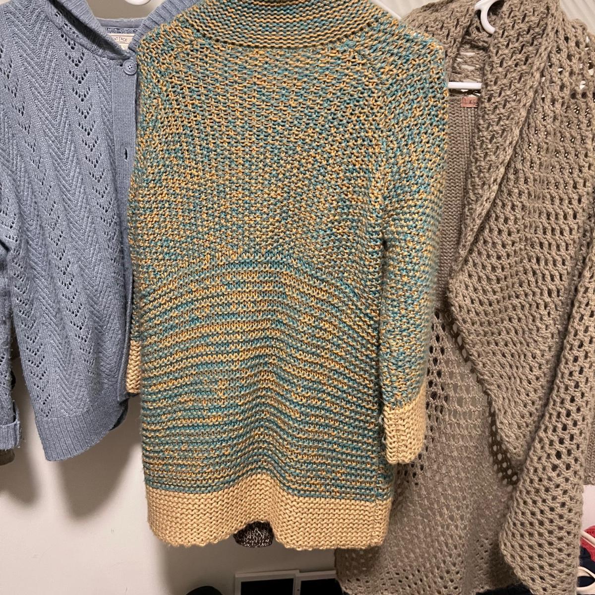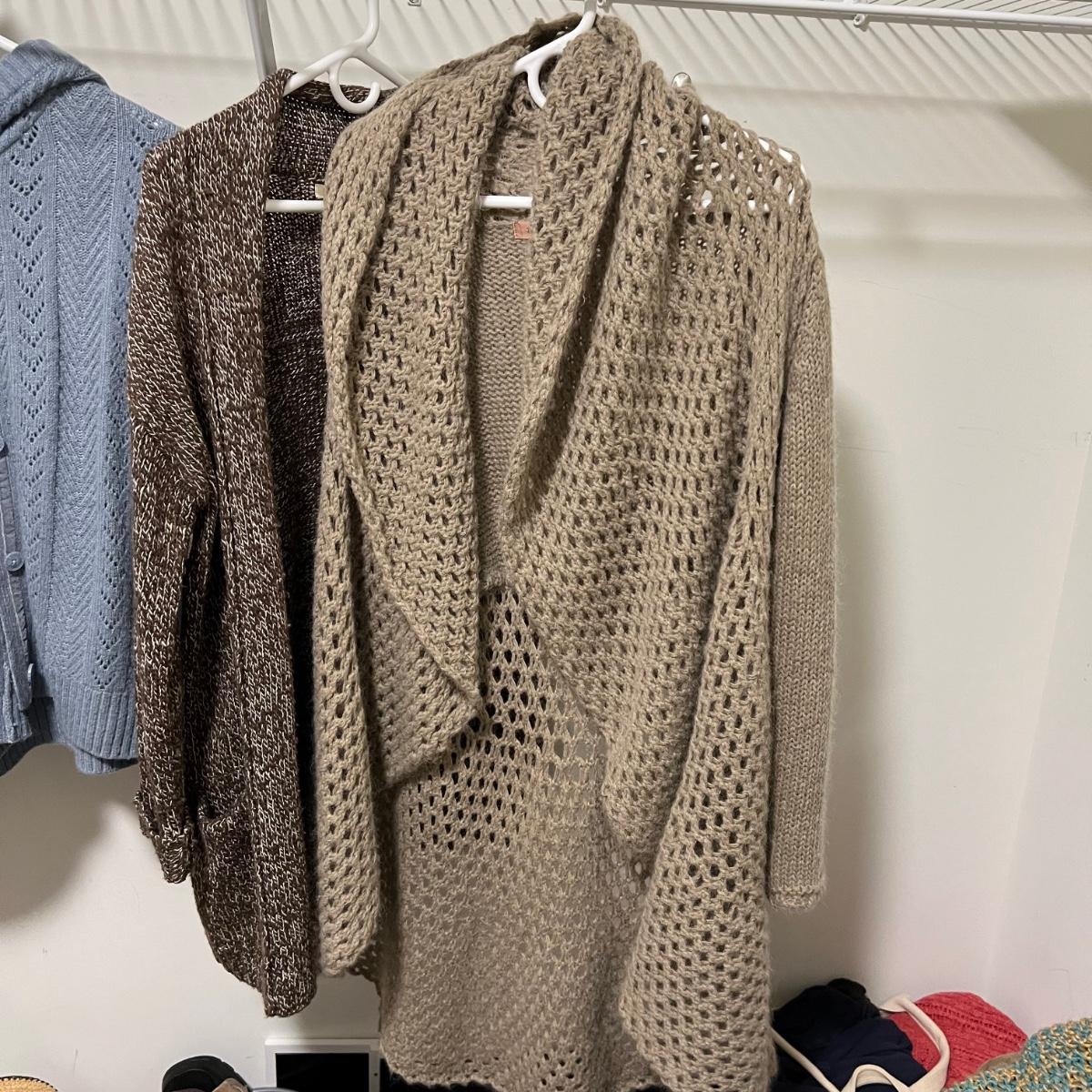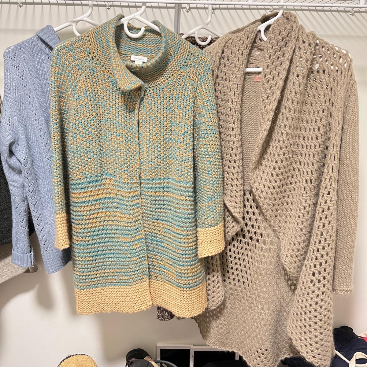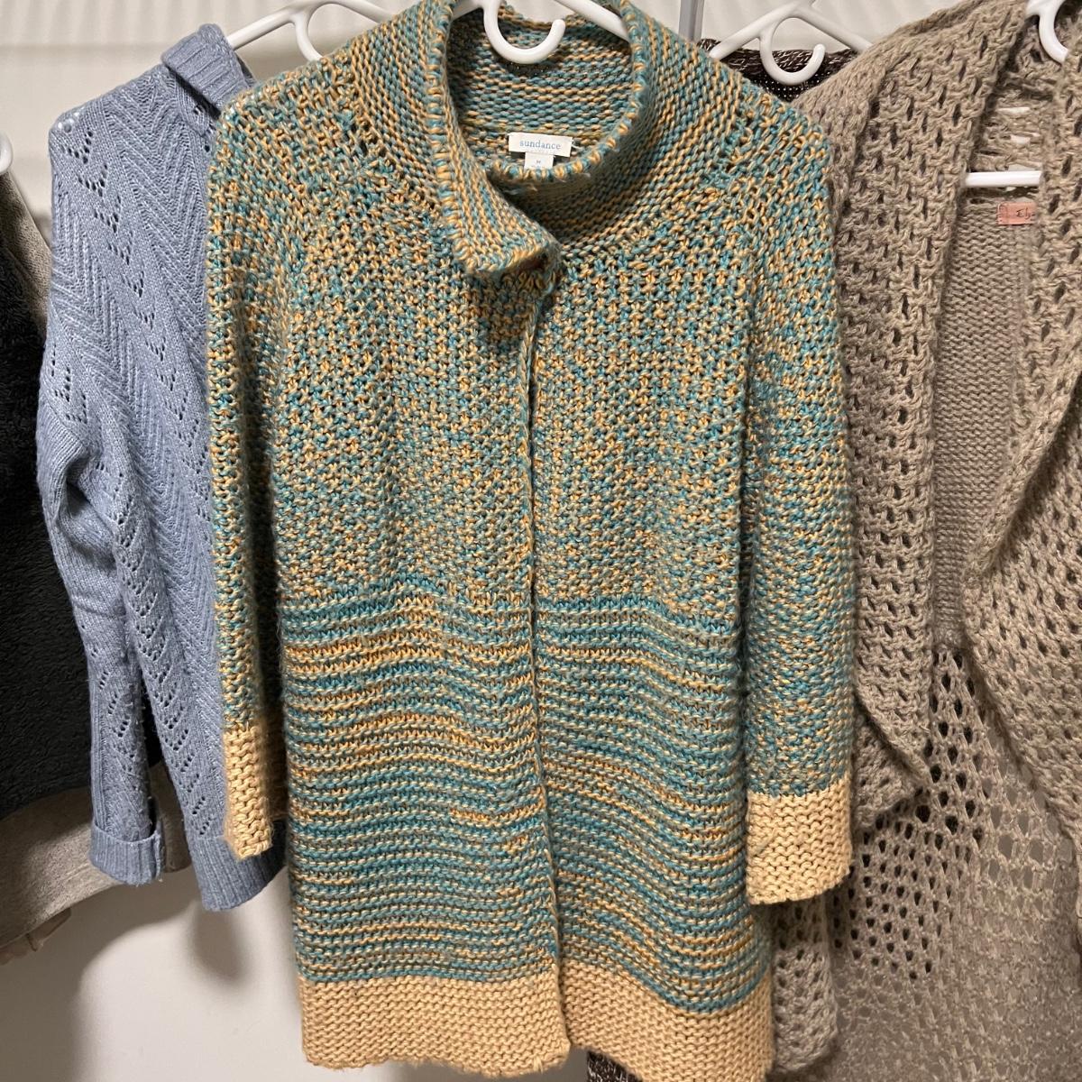 A nice assortment of ladies knitted cardigans in this lot that includes a long mohair cardigan by Elsamanda of Italy (size is 1X but this piece could be worn by most medium to large wearing people) and a Sundance pretty blue and yellow piece. All items are in good condition with no rips or stains. See images for brands and sizes.