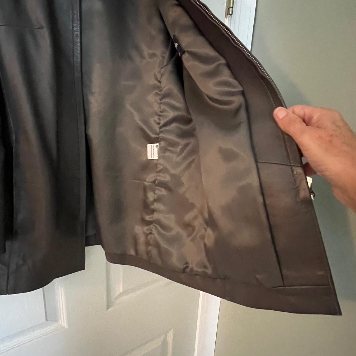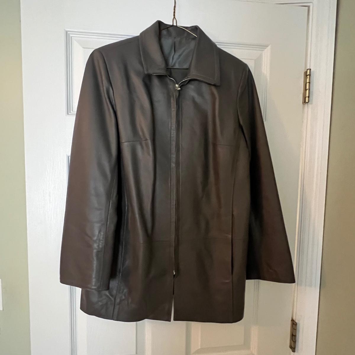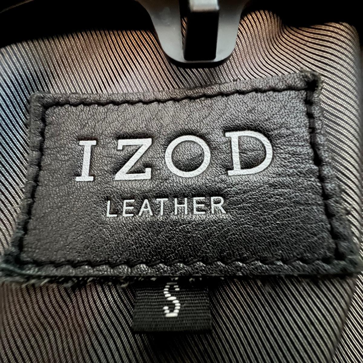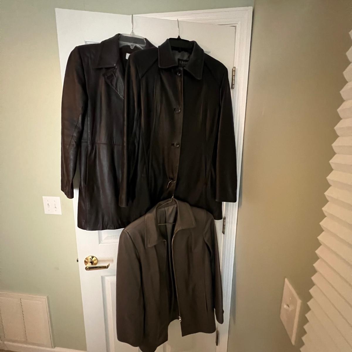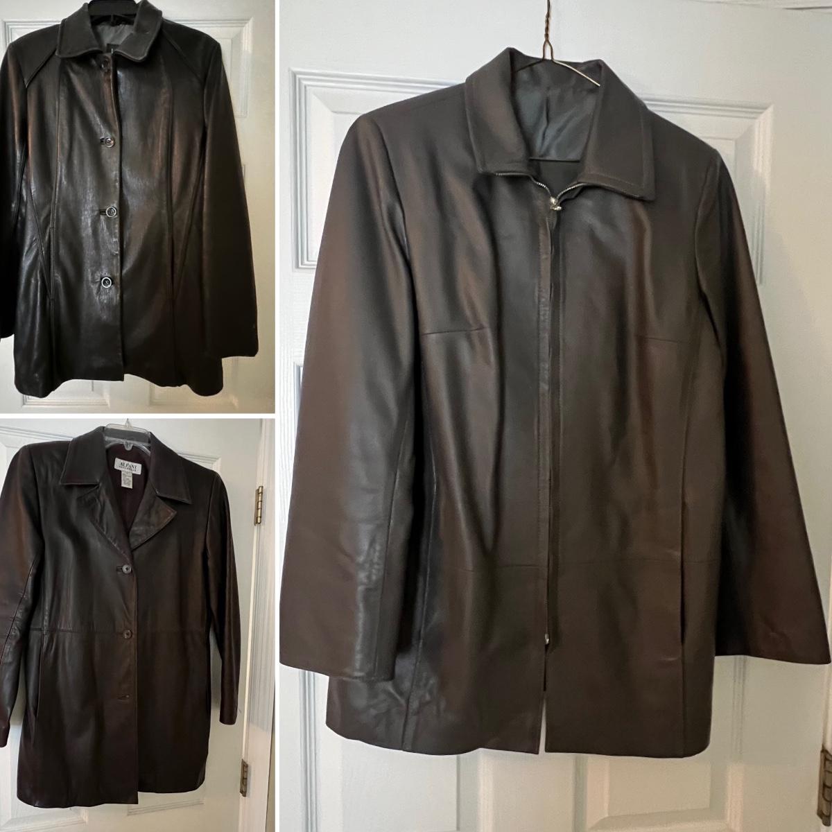 Three ladies leather jackets. The longer jacket is a dark chocolate brown and size small. The other longer jacket is Izod, it is black and size small. The shorter jacket is a medium grey color and is sheep leather and size 40; it has zipper closure plus zippers on pockets and sleeves. All jackets are labeled leather.