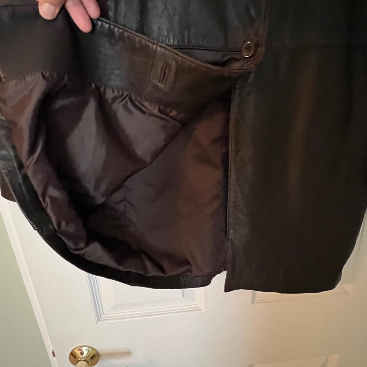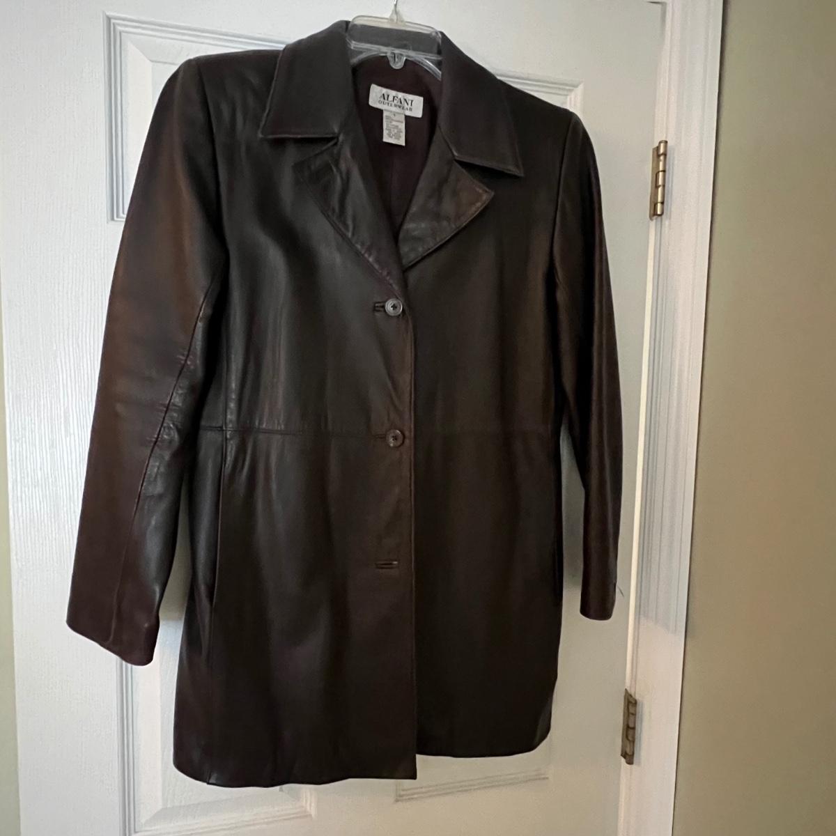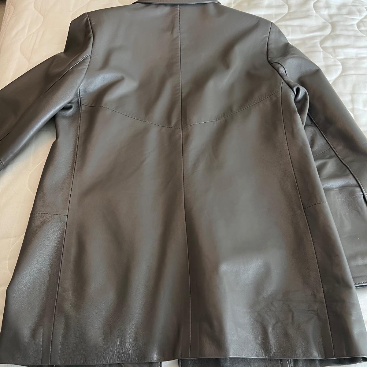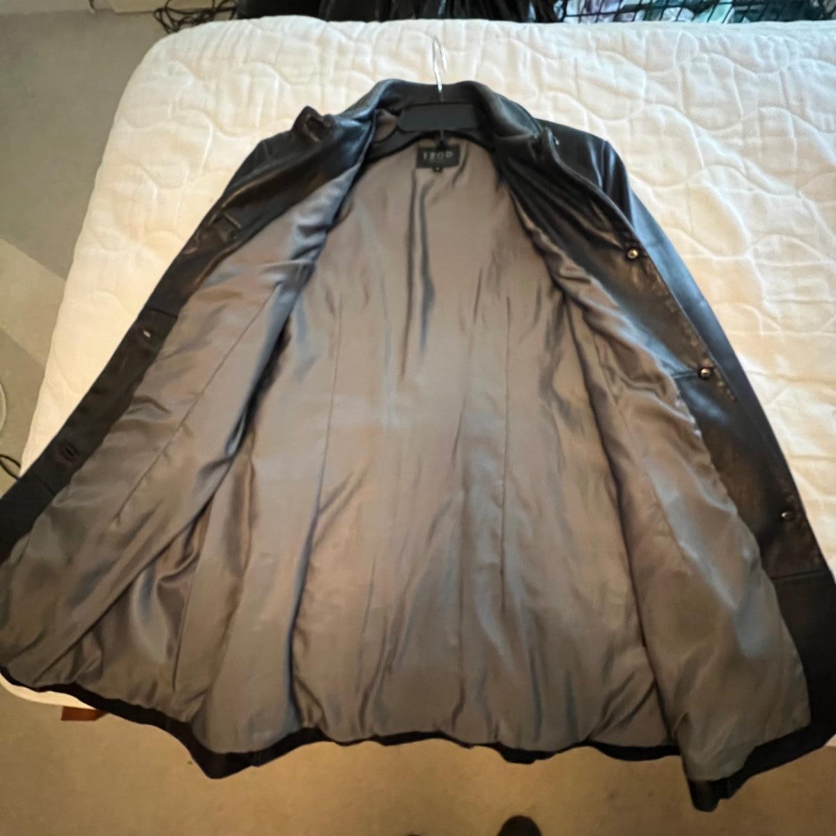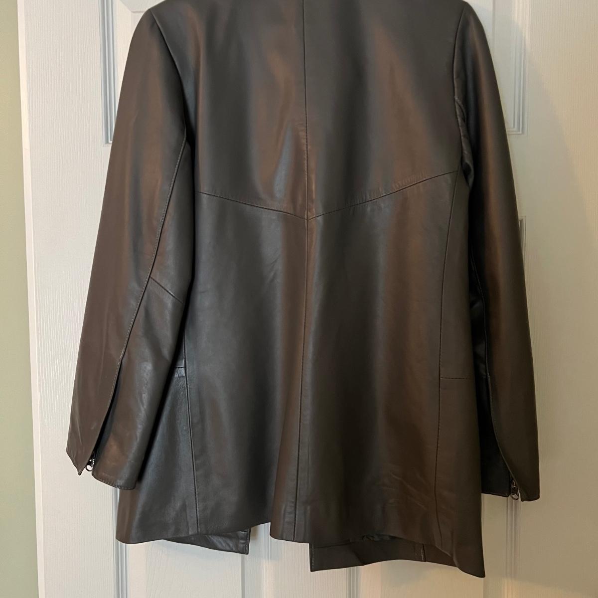 Three ladies leather jackets. The longer jacket is a dark chocolate brown and size small. The other longer jacket is Izod, it is black and size small. The shorter jacket is a medium grey color and is sheep leather and size 40; it has zipper closure plus zippers on pockets and sleeves. All jackets are labeled leather.