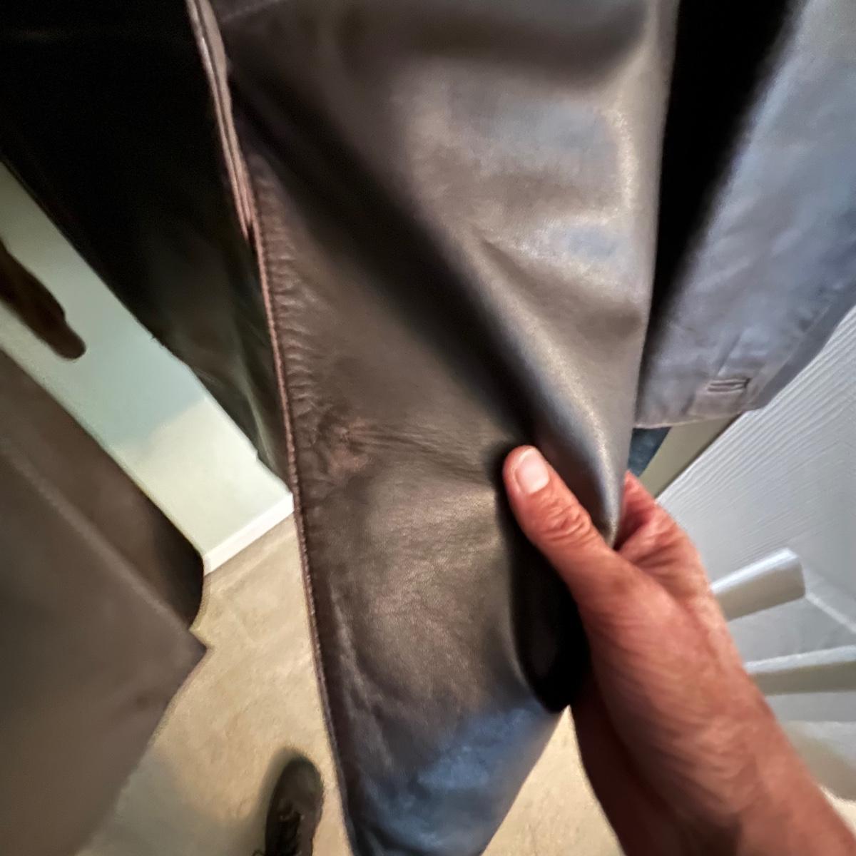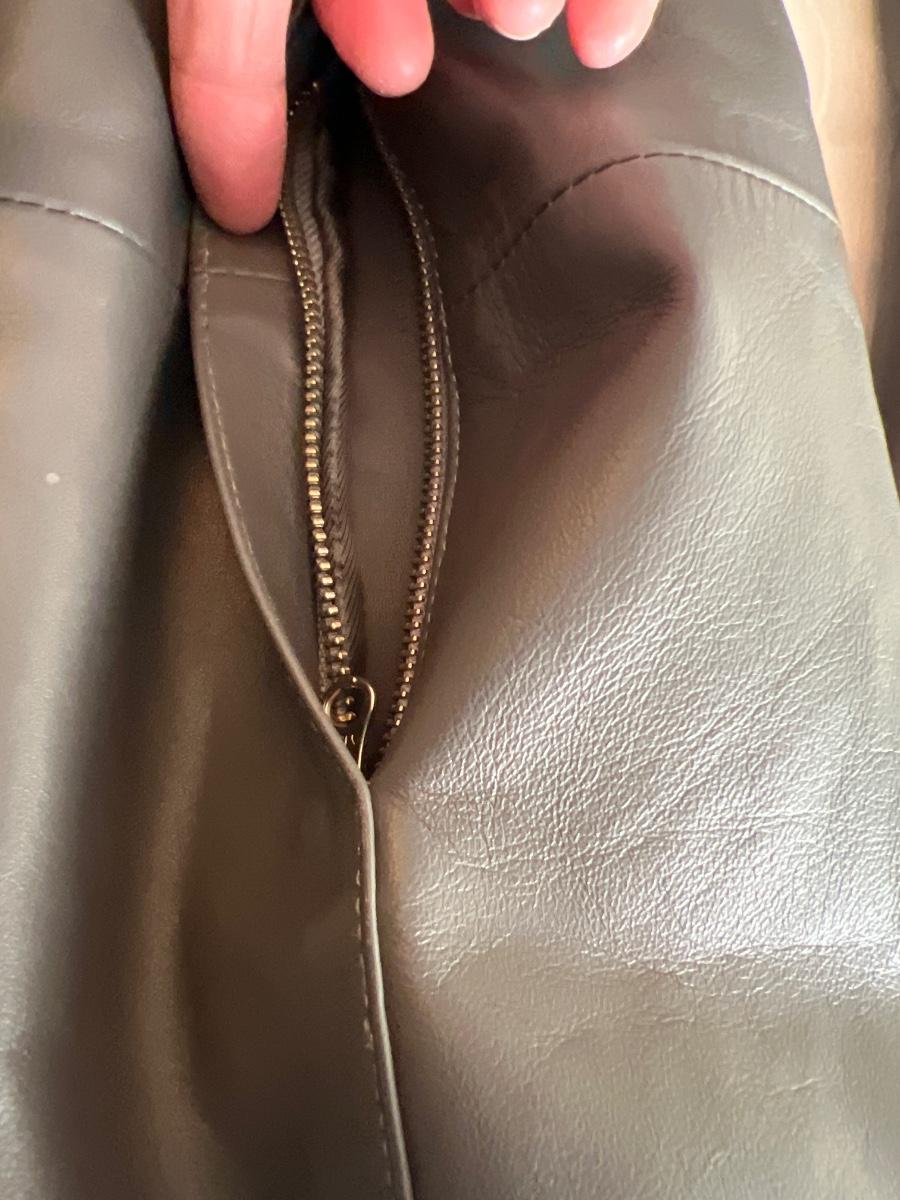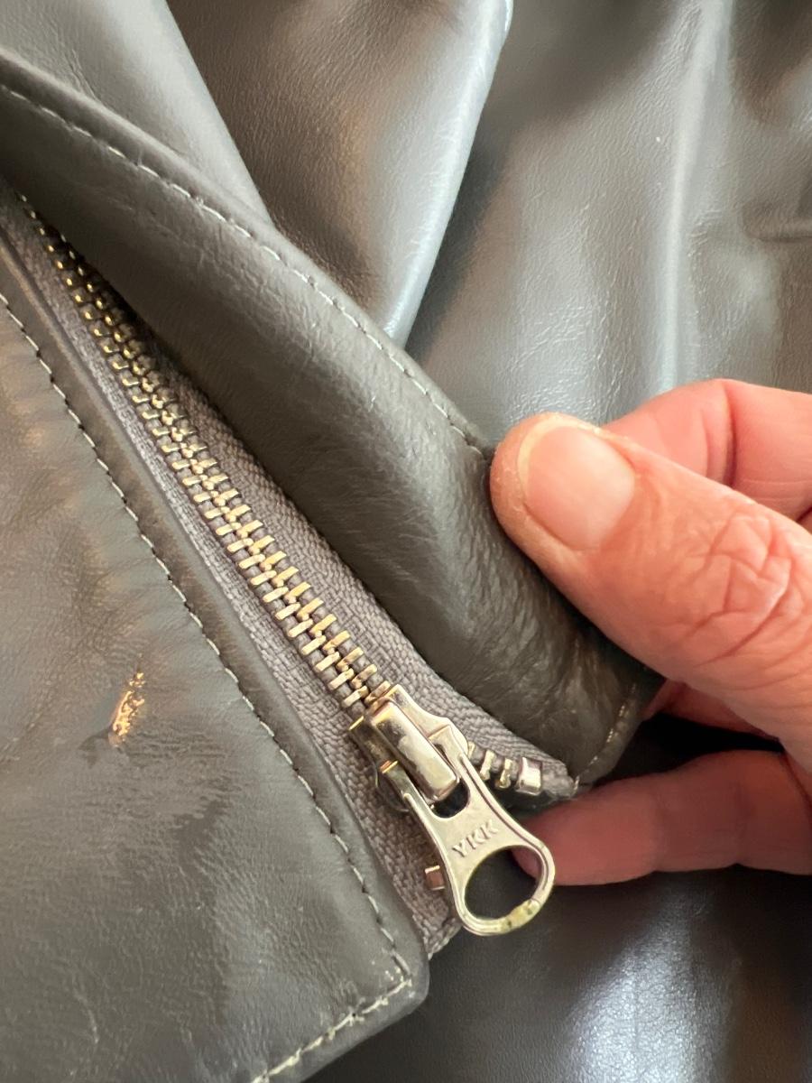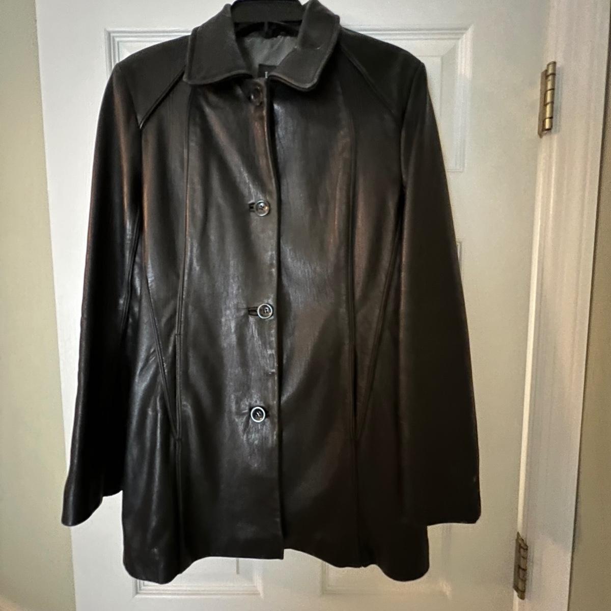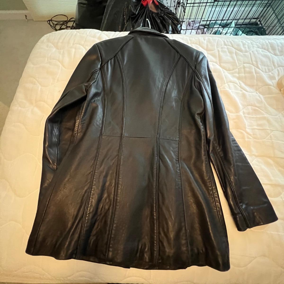 Three ladies leather jackets. The longer jacket is a dark chocolate brown and size small. The other longer jacket is Izod, it is black and size small. The shorter jacket is a medium grey color and is sheep leather and size 40; it has zipper closure plus zippers on pockets and sleeves. All jackets are labeled leather.