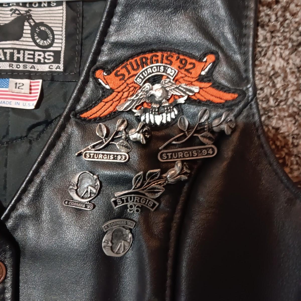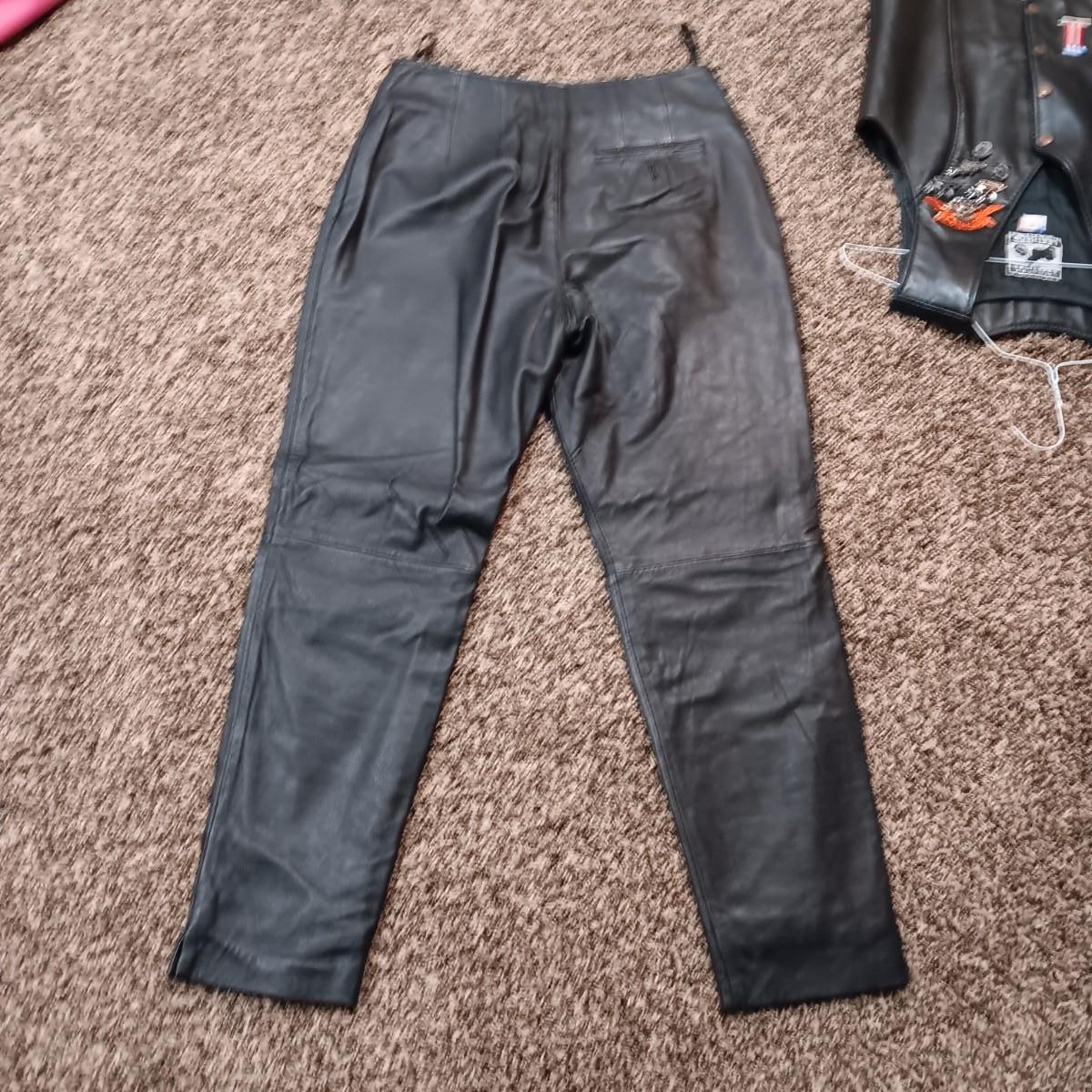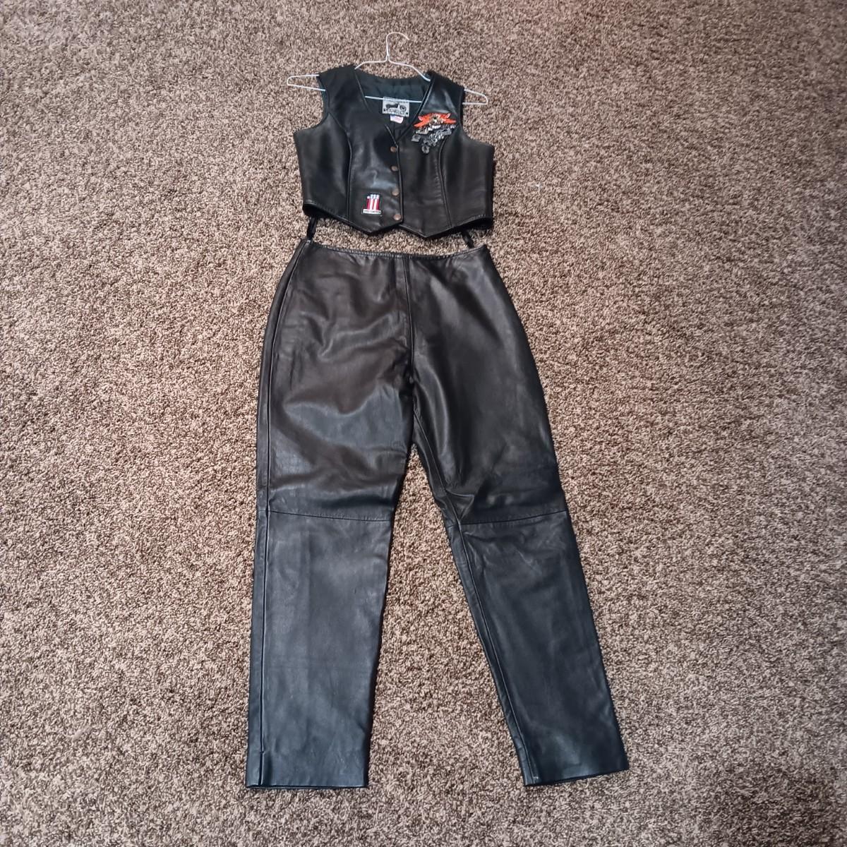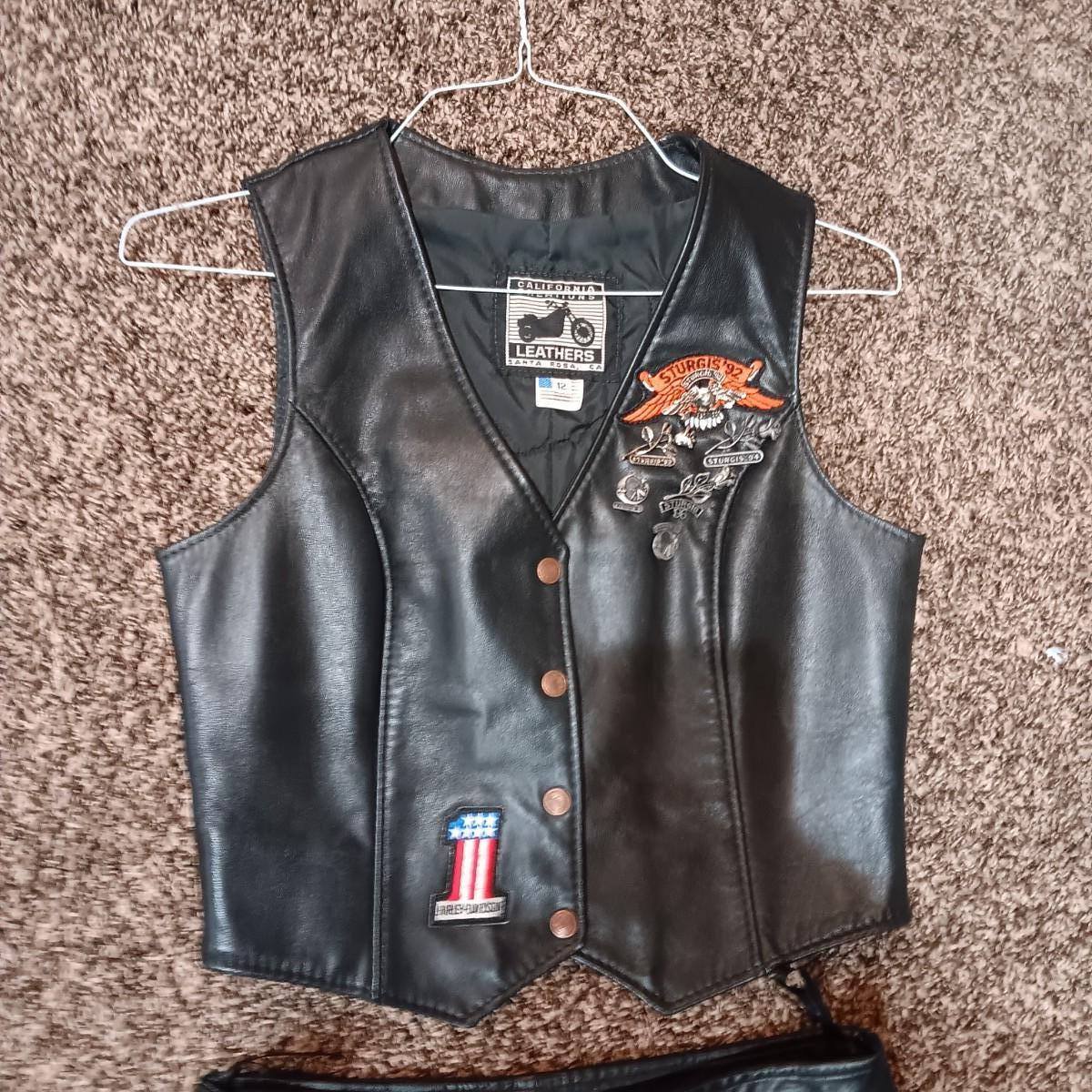 LADIES LEATHER VEST W/STURGIS PEWTER PINS AND HARLEY DAVIDSON PATCH PLUS LEATHER PANTS